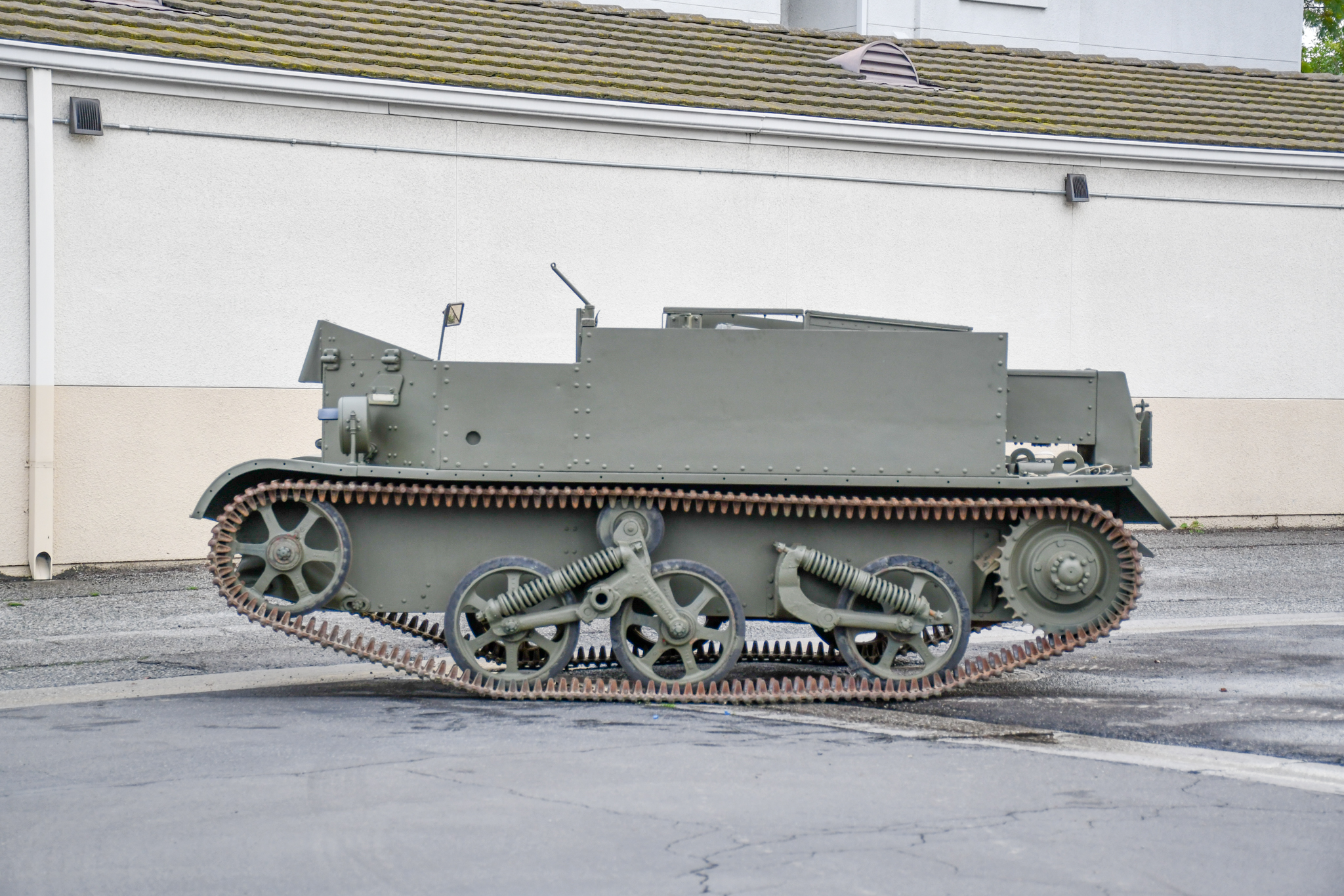 The Universal Carrier features suspension based on the contemporary Vickers Light Tank and utilizes steel treads, Horstmann springs, and a Ford live rear axle.