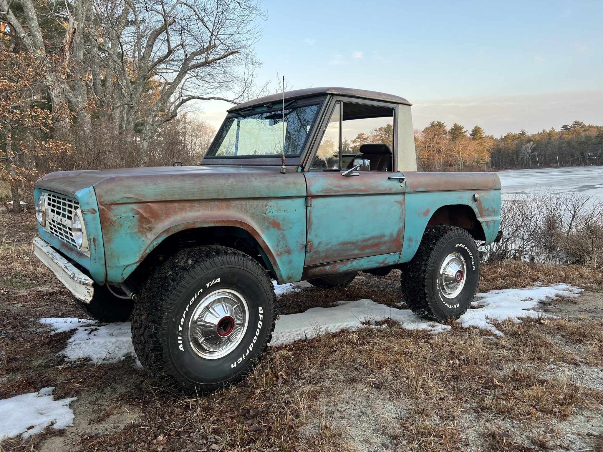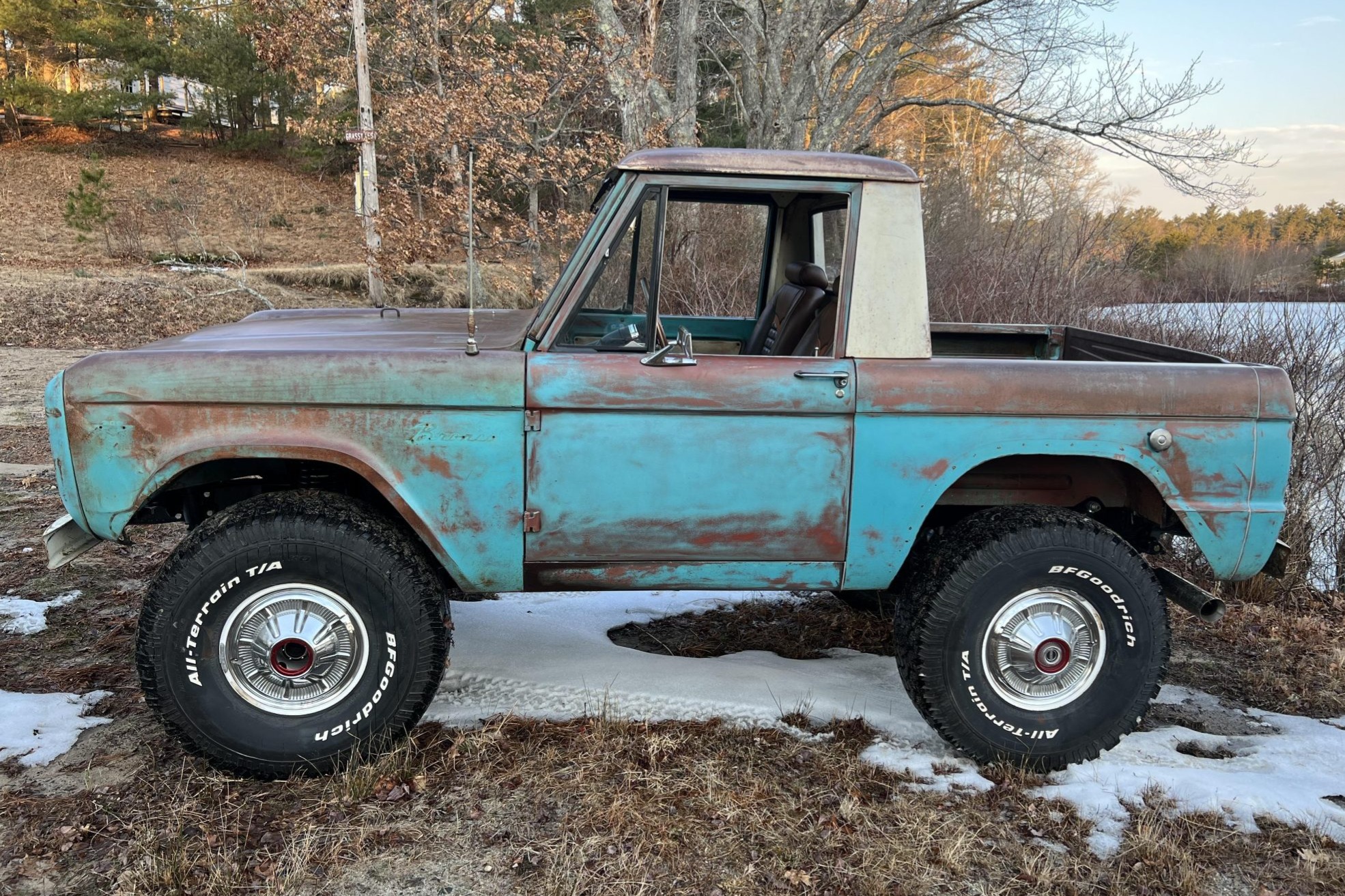 Replacement white 15″ steel wheels wear stock hubcaps and are mounted with 35×12.5″ BFGoodrich All-Terrain T/A KO tires. The rear fenders have been cut and the suspension lifted approximately 2.5″ to clear the larger rubber. Additional modifications include Bilstein shocks, a Borgeson power steering kit, and a power-assisted braking system with front discs. New bushings, bearings, and seals have been fitted according to the selling dealer.