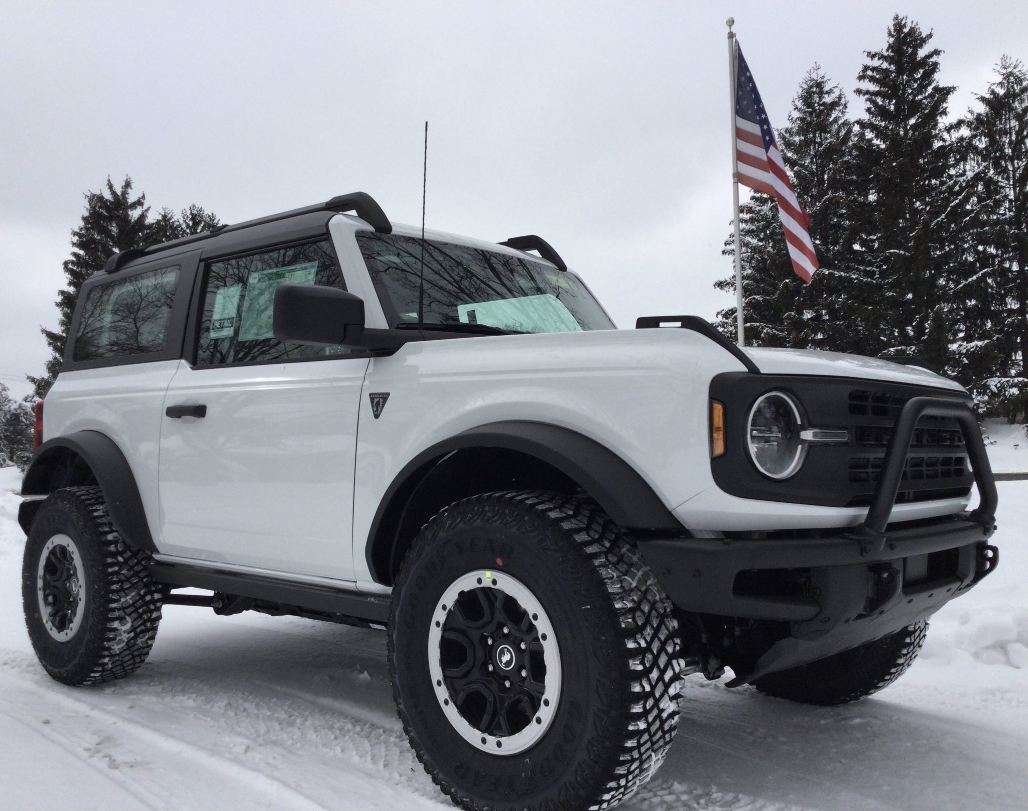 Factory 17″ wheels are beadlock-capable and are wrapped in 315/70 Goodyear Territory MT tires, and a matching spare wheel and tire are mounted to the tailgate. The truck is equipped with the Sasquatch package which added front and rear locking differentials as well as Bilstein dampers. Additional equipment includes a Terrain Management System (TMS) with selectable “Goes Over Any Type of Terrain” (G.O.A.T) drive modes.