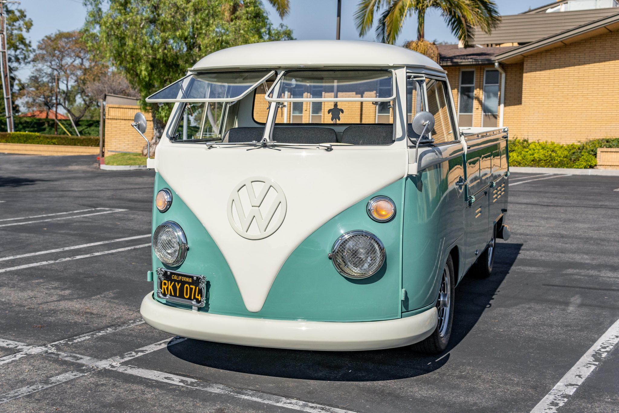 A lower storage compartment is accessible via flip-up doors. BRM-style 15″ wheels sourced from EMPI are mounted with 195/60 Uniroyal and Negotiator tires, and a spare wheel and tire is stored in the aforementioned compartment. According to the seller, the ride height has been lowered, and braking is handled by discs up front and drums out back.