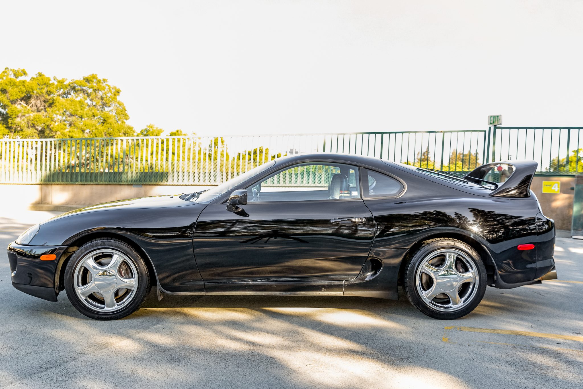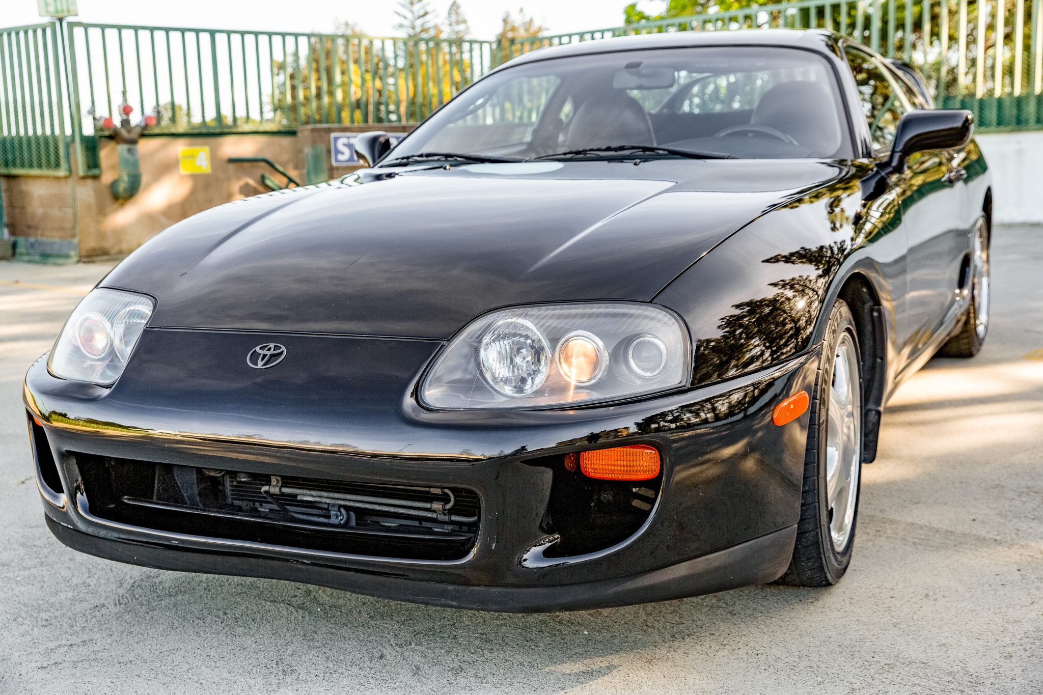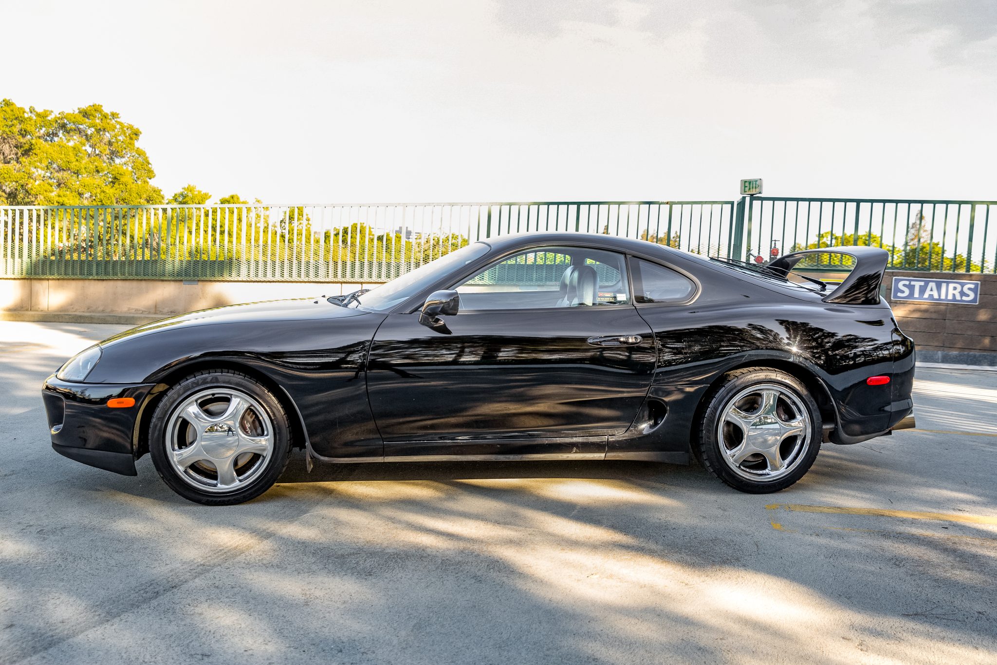 Chrome-finish 17″ wheels are wrapped in 235/45 front and 255/40 rear Bridgestone Potenza RE750 tires. Braking is handled by four-wheel anti-lock discs with Supra-script calipers. The brake rotors were reportedly replaced in February 2022. Curb rash and pitting of the finish on the wheels are shown in the gallery.