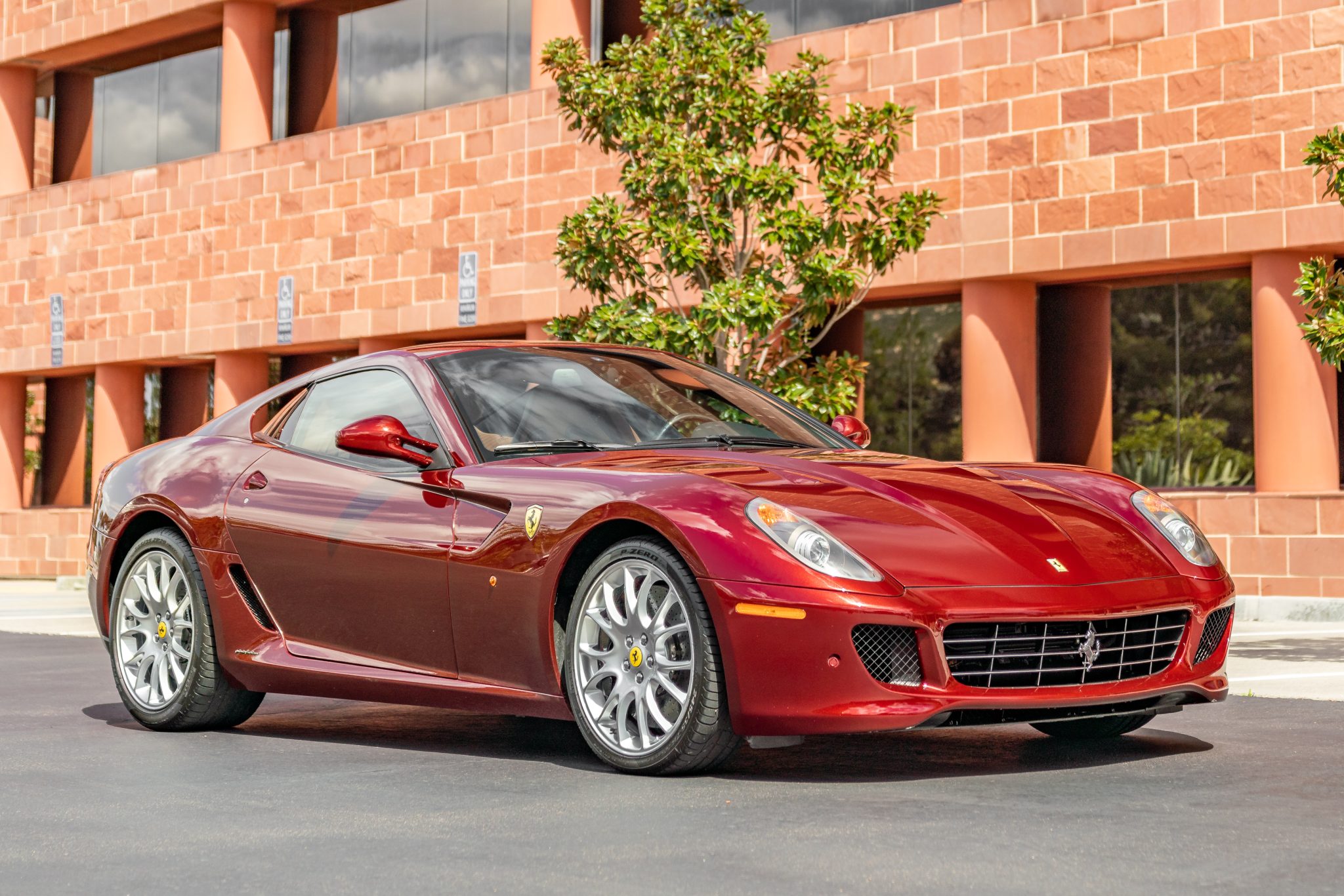 Forged 20″ Monolithic wheels are mounted with 245/35 front and 305/35 rear Pirelli P Zero tires showing 2018 date codes. The 599 rides on an aluminum chassis with a semi-active magnetorheological suspension system, while stopping power is provided by cross-drilled carbon-ceramic brake rotors clamped by Ferrari-branded calipers at all four corners. A brake fluid flush was performed in January 2022.