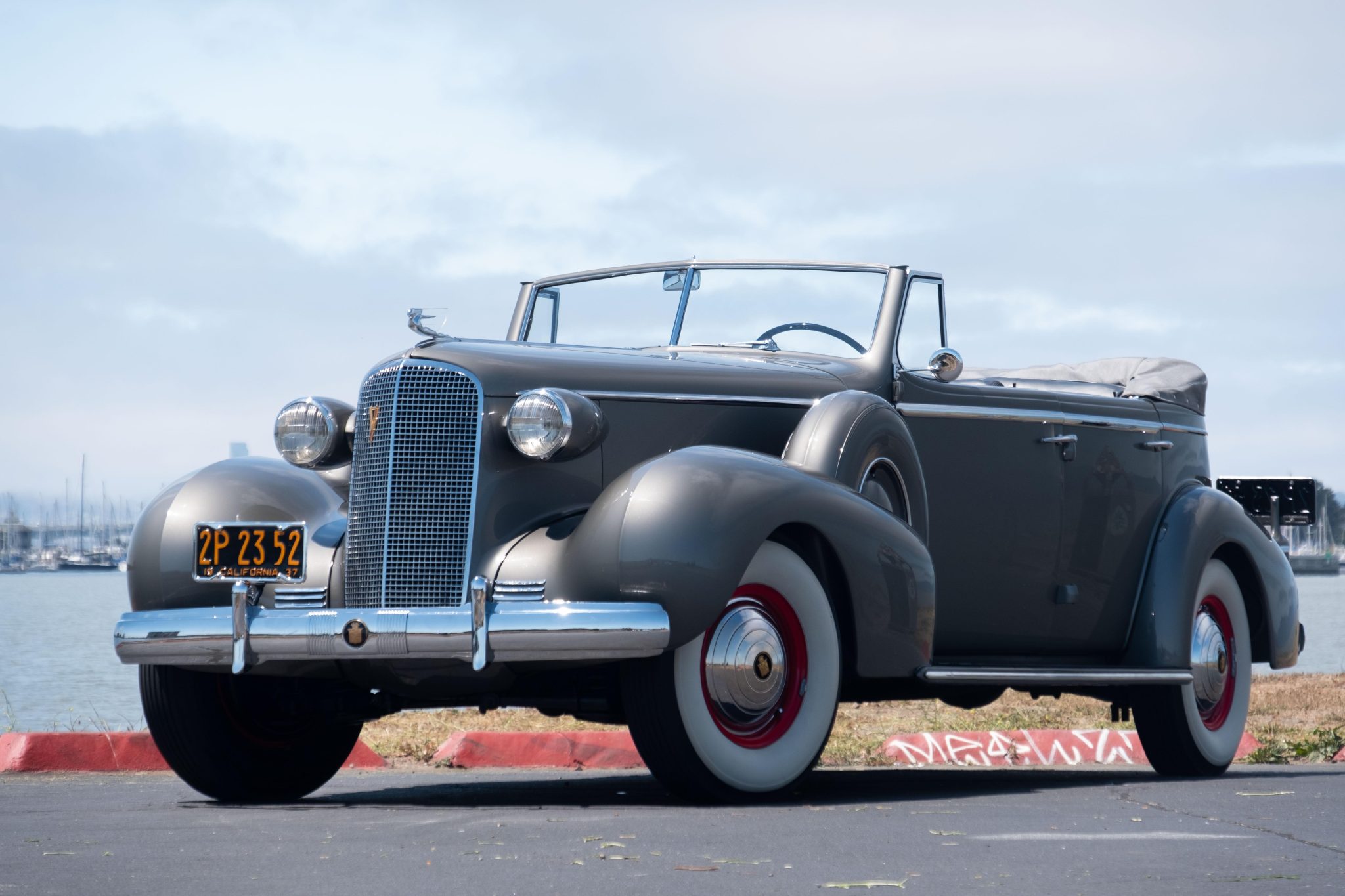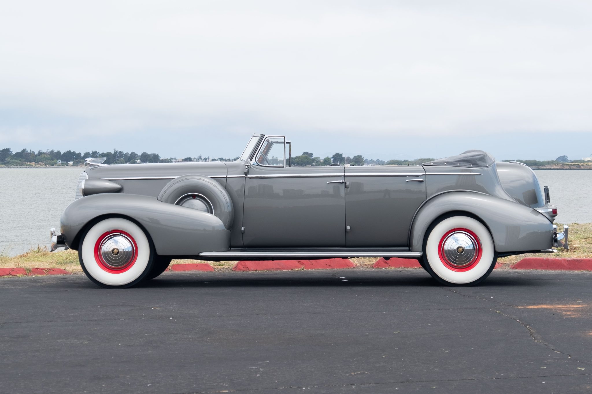The red-painted steel wheels wear chrome Cadillac crest hubcaps and trim rings, and they are mounted with 7.50/8.20–16 Denman bias-ply whitewall tires. Twin spare tires are mounted inside body-color covers on the front fenders. A replacement gray soft top was reportedly fitted during the refurbishment. The Model 85 rode on a 138″ wheelbase and featured an independent front suspension with semi-elliptical leaf springs out back. Stopping power is provided by hydraulically assisted drums at all four corners.