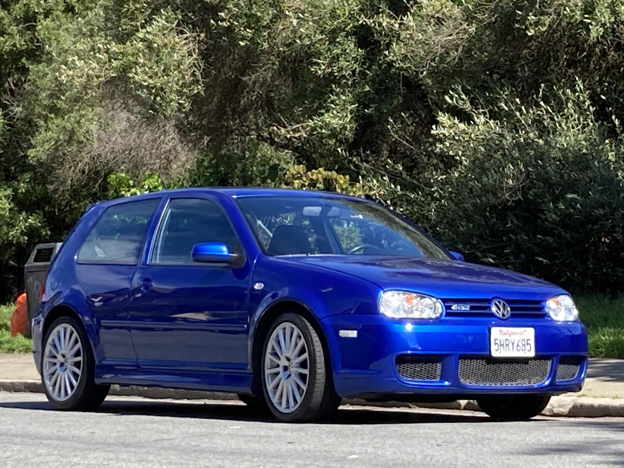 OZ Racing 18″ alloy wheels are mounted with Bridgestone Potenza 225/40 tires that show 2018 date codes. The R32 received upgraded brakes compared with the GTI, including larger ventilated discs and blue-painted calipers at each corner.