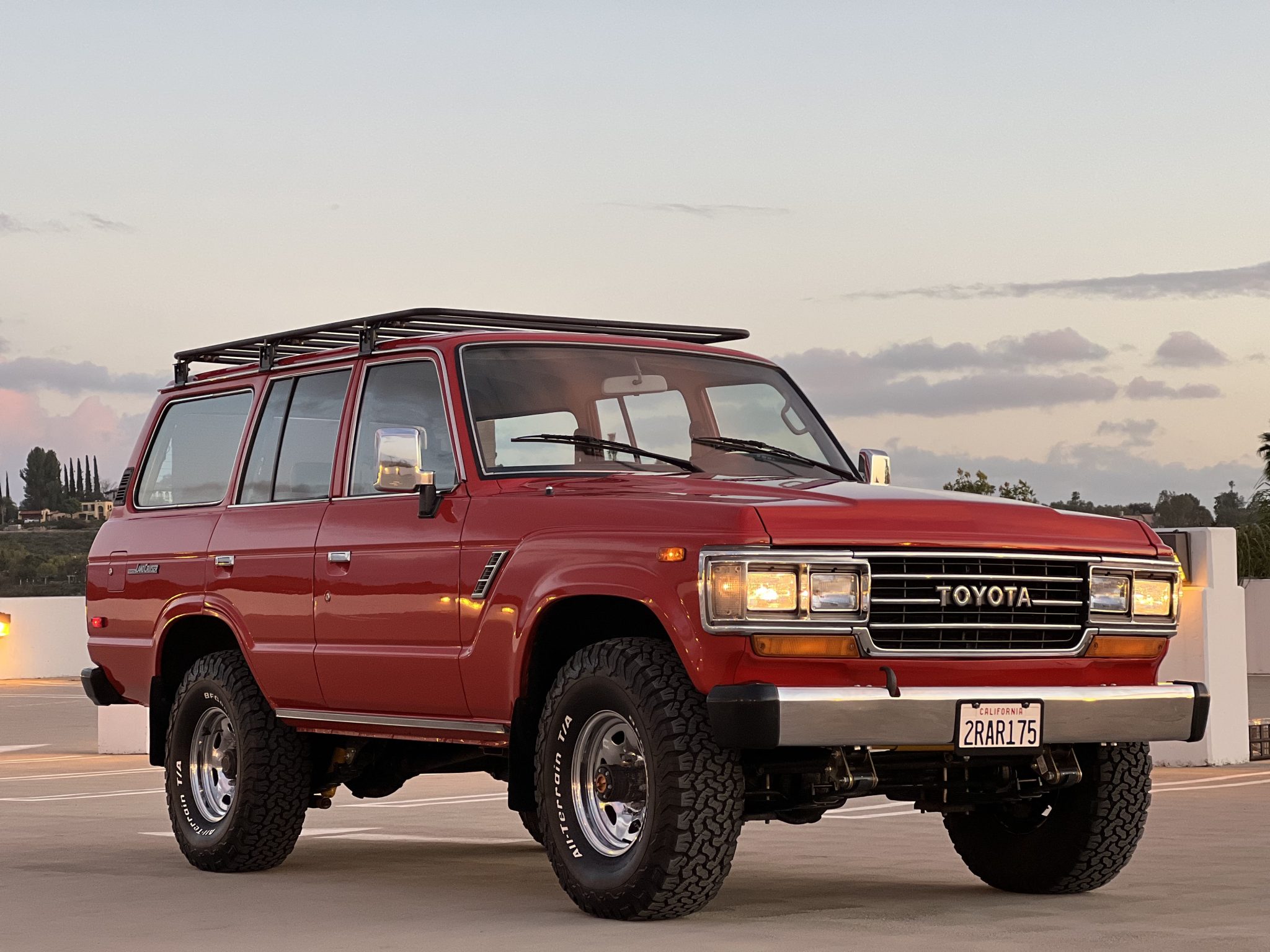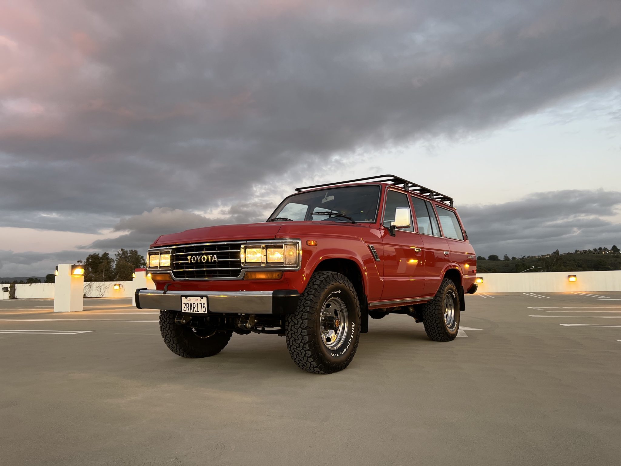 The 15″ polished steel wheels are wrapped in 33×10.5″ BFGoodrich All-Terrain T/A KO2 tires. The front axle is equipped with Aisin manually locking hubs, and braking is handled by front discs and rear drums. An Old Man Emu 3″ lift kit is said to have been recently installed by Corsetti Cruisers in Gardena, California.