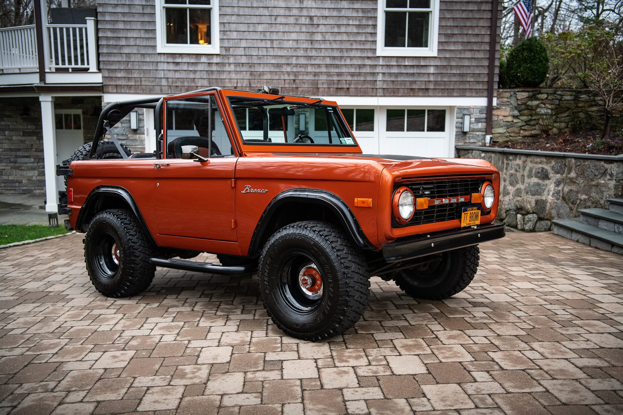 Black-finished 15″ steel wheels wear custom hub caps and are wrapped in 33×12.5″ Cooper Discoverer ST tires. A matching spare is mounted to the swing-away rear rack. The truck is equipped with manually locking front hubs, F-150 front springs, 1″ rear spring blocks, and a 1″ body lift. Stopping power is from front disc and rear drum brakes.