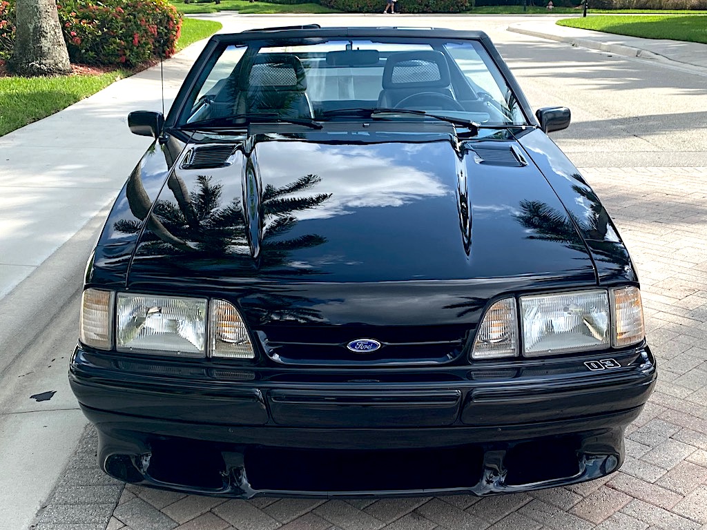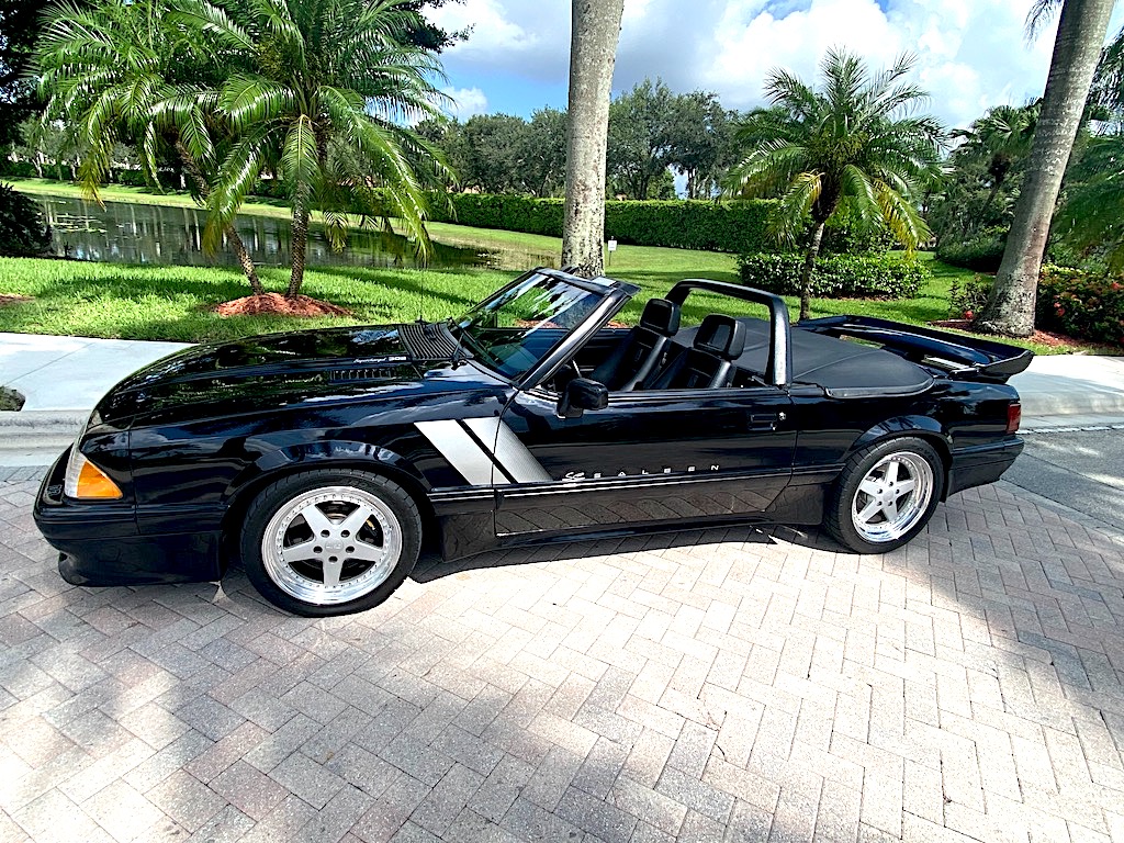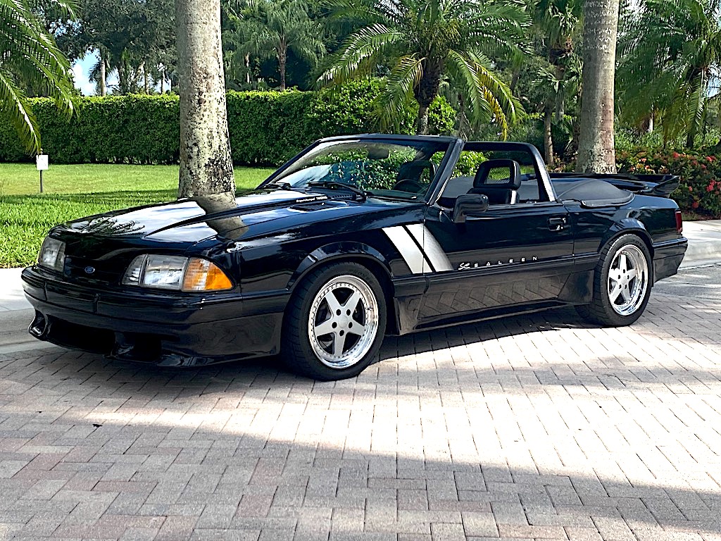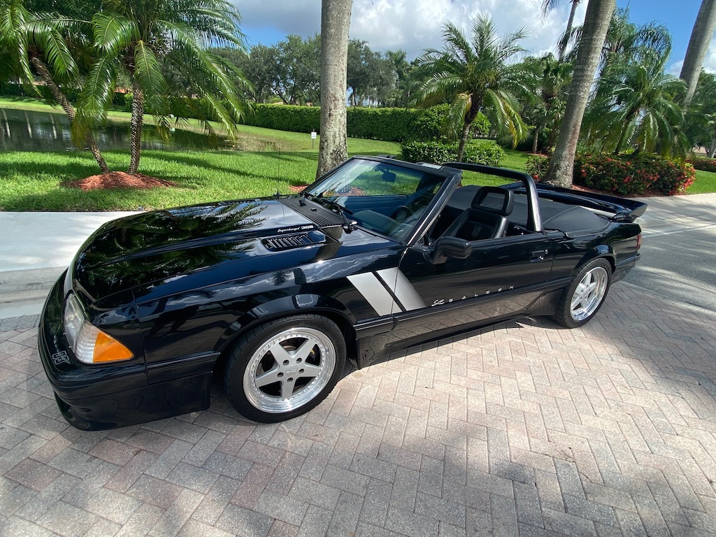 Saleen Design 17″ modular wheels were produced by WRD and are mounted with 235/40 front and 255/40 rear Toyo Proxes R1R tires that are said to have been installed in 2021. Braking is handled by four-wheel discs that feature Saleen-branded Alcon four-piston calipers over slotted two-piece rotors up front. The suspension was fitted with the following components from Saleen: