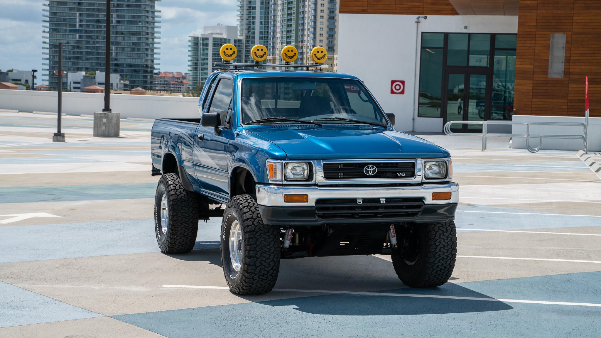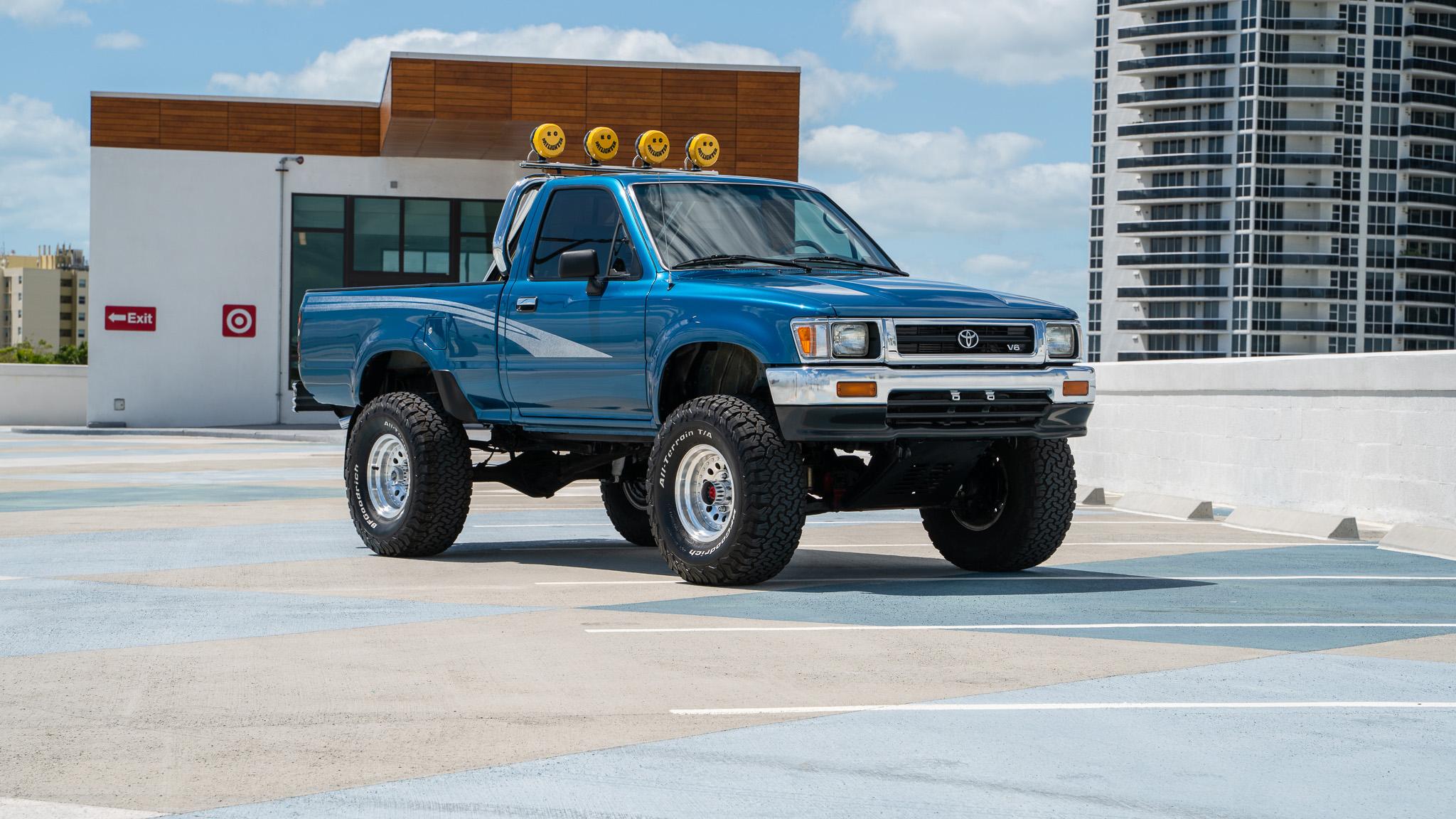 Aluminum 15″ American Racing wheels wear 33×12.5″ BFGoodrich All-Terrain white letter tires. The shocks were reportedly replaced in 2020, and a Skyjacker suspension lift has been installed. Mudflaps are fitted at the rear, and the front axle is equipped with manually locking front hubs.