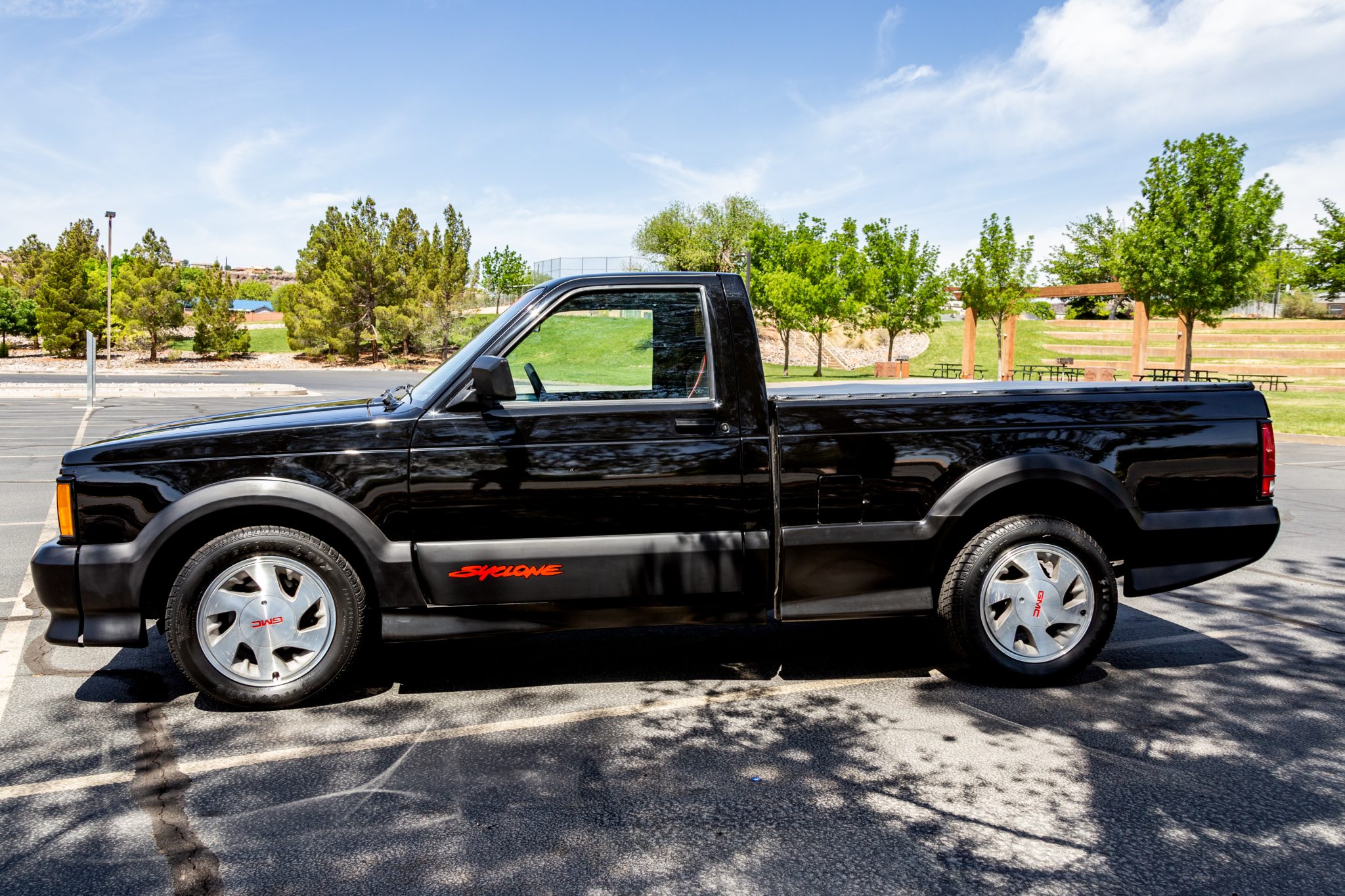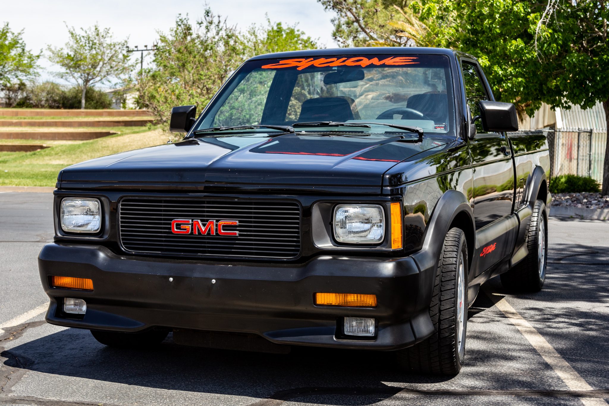 Turbine-style 16″ aluminum wheels wear GMC-branded center caps and are mounted with 245/50 Firestone Firehawk SVX tires. The truck is equipped with power steering and a sport-tuned suspension. Braking is handled by power-assisted front discs and rear drums. The seller notes that the clear coat on the wheels is fading.