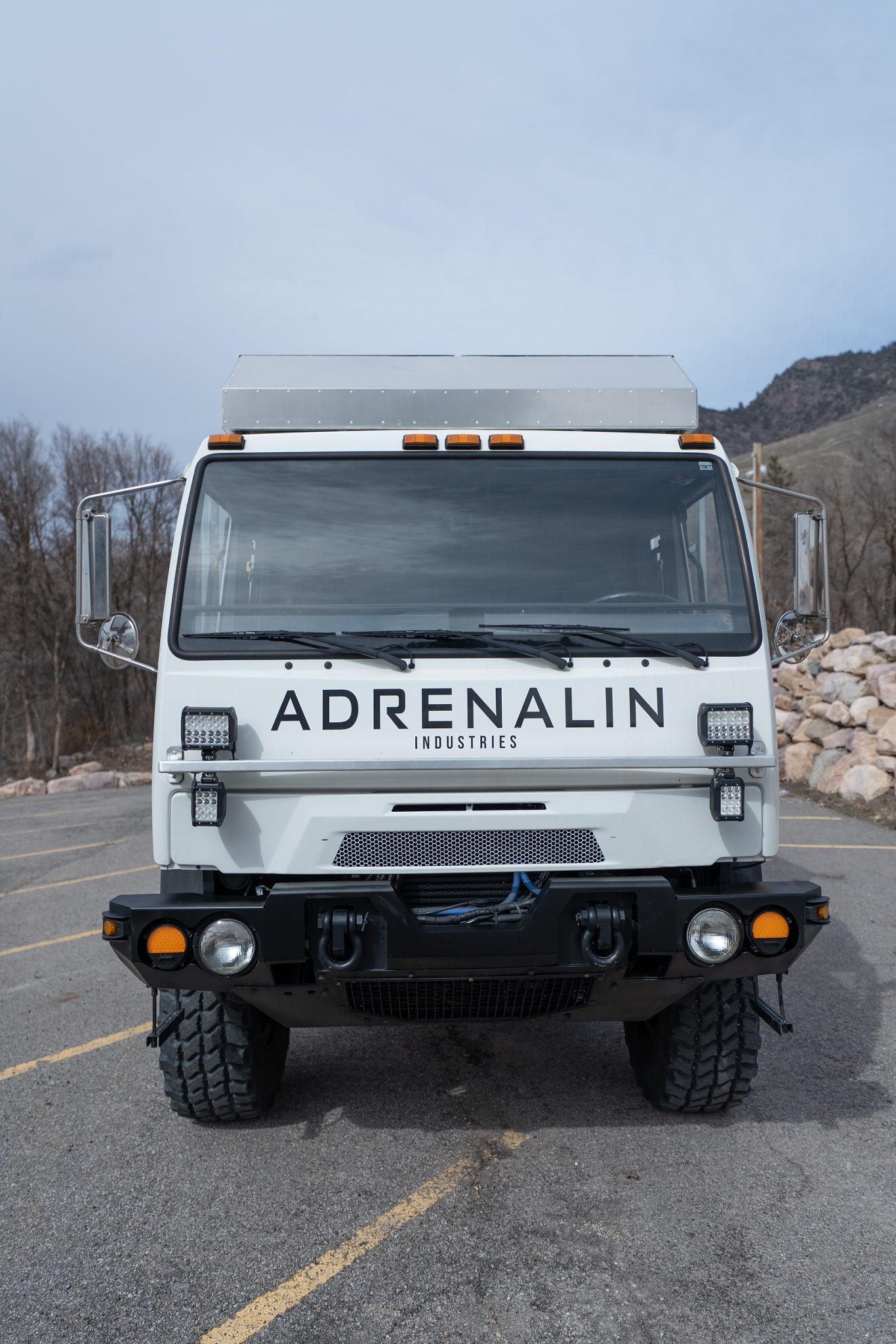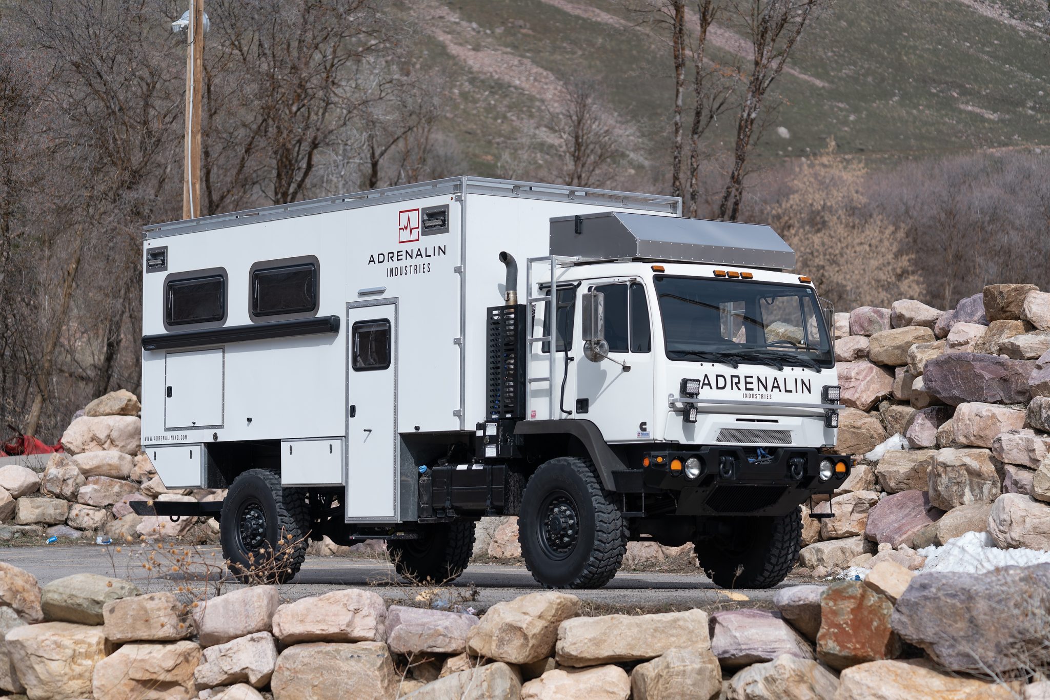 The camper cabin features an aluminum frame and skin, foam-core insulation, an active suspension system, a reinforced walk-on roof, and under-mount storage bins. Additional equipment includes Tern dual-pane acrylic windows with integrated screens and shades, a power-operated roof hatch, roof-mounted solar panels, an exterior shower, recessed LED load lights, and two power-operated awnings.