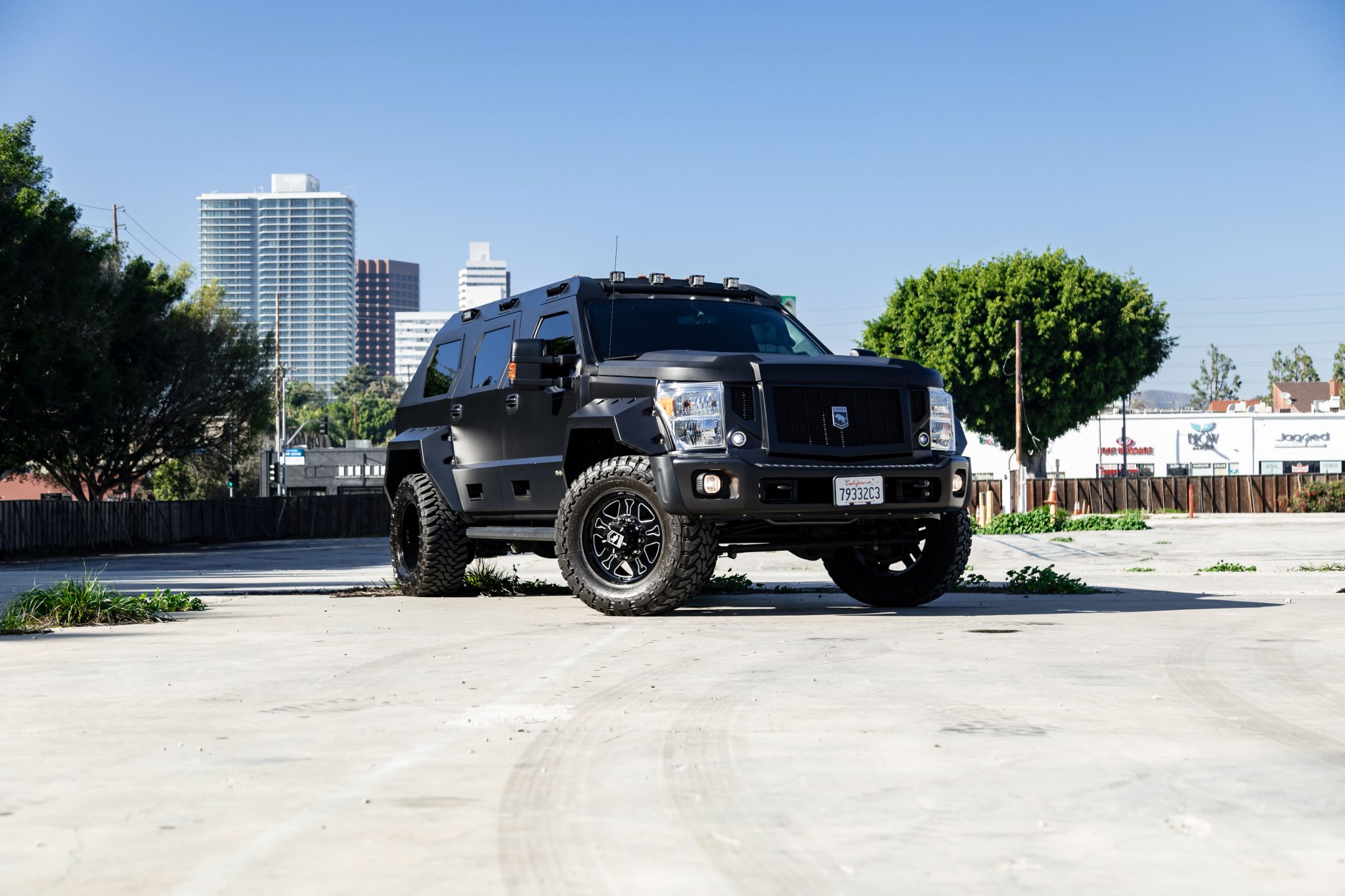 Forged 20″ aluminum wheels are wrapped in 38×15.50″ Toyo Open Country tires. A matching spare is mounted on a swing-out carrier. The suspension features Bilstein dampers in the front and self-leveling hydraulic shocks out back. Braking is provided by four-wheel ventilated discs with heavy-duty calipers.