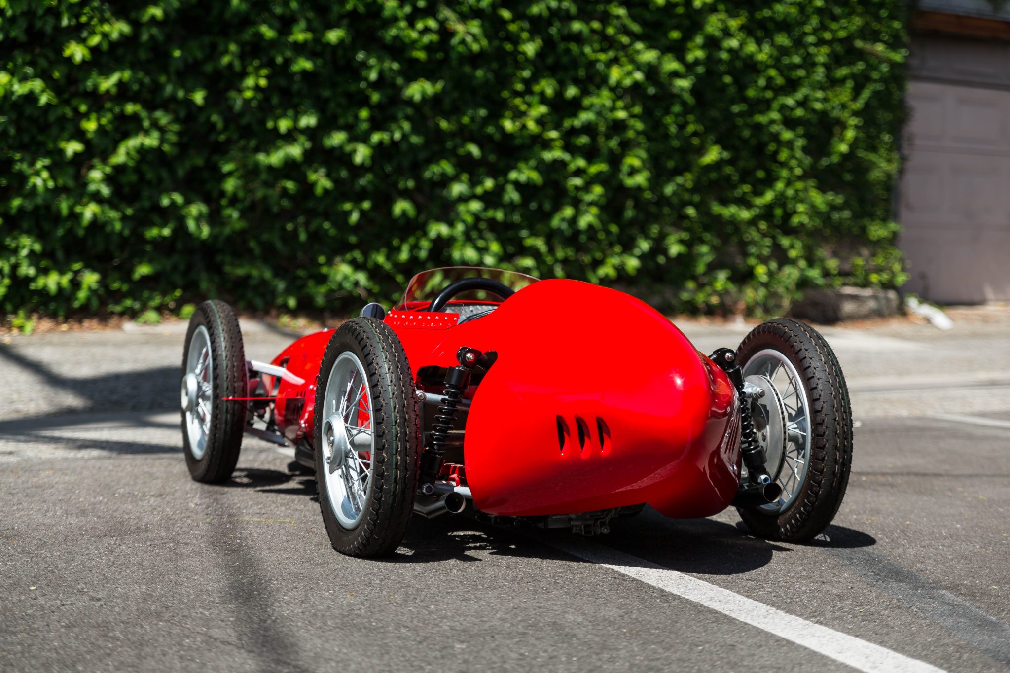 The silver-painted center-lock wire wheels are mounted with 3.00-12 Sava MC5 tires. A set of prancing horse center caps is included in the sale. The wheels are mounted with three-eared knock-offs ahead of faux brake rotors, and stopping power is provided by inboard rear units. The boxed steel frame is finished in red and features double wishbones at all four corners along with coilovers out back.