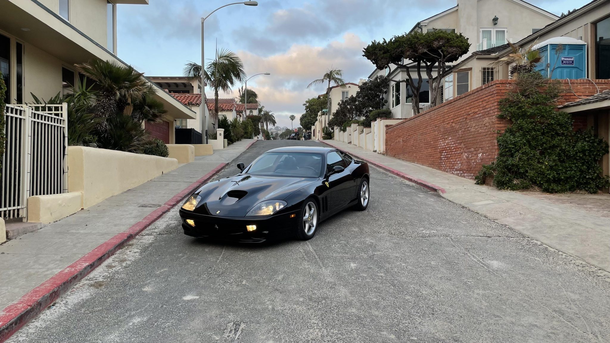 The 18″ five-spoke alloy wheels are wrapped in 255/40 front and 295/35 rear Michelin Pilot Super Sport tires the seller states were mounted in July 2021. Braking is handled by black-finished Ferrari-branded calipers over cross-drilled and ventilated rotors at all four corners, and the seller states spacers are fitted to the rear hubs. Work completed in 2021 included replacing the front suspension bushings and brake ducting.