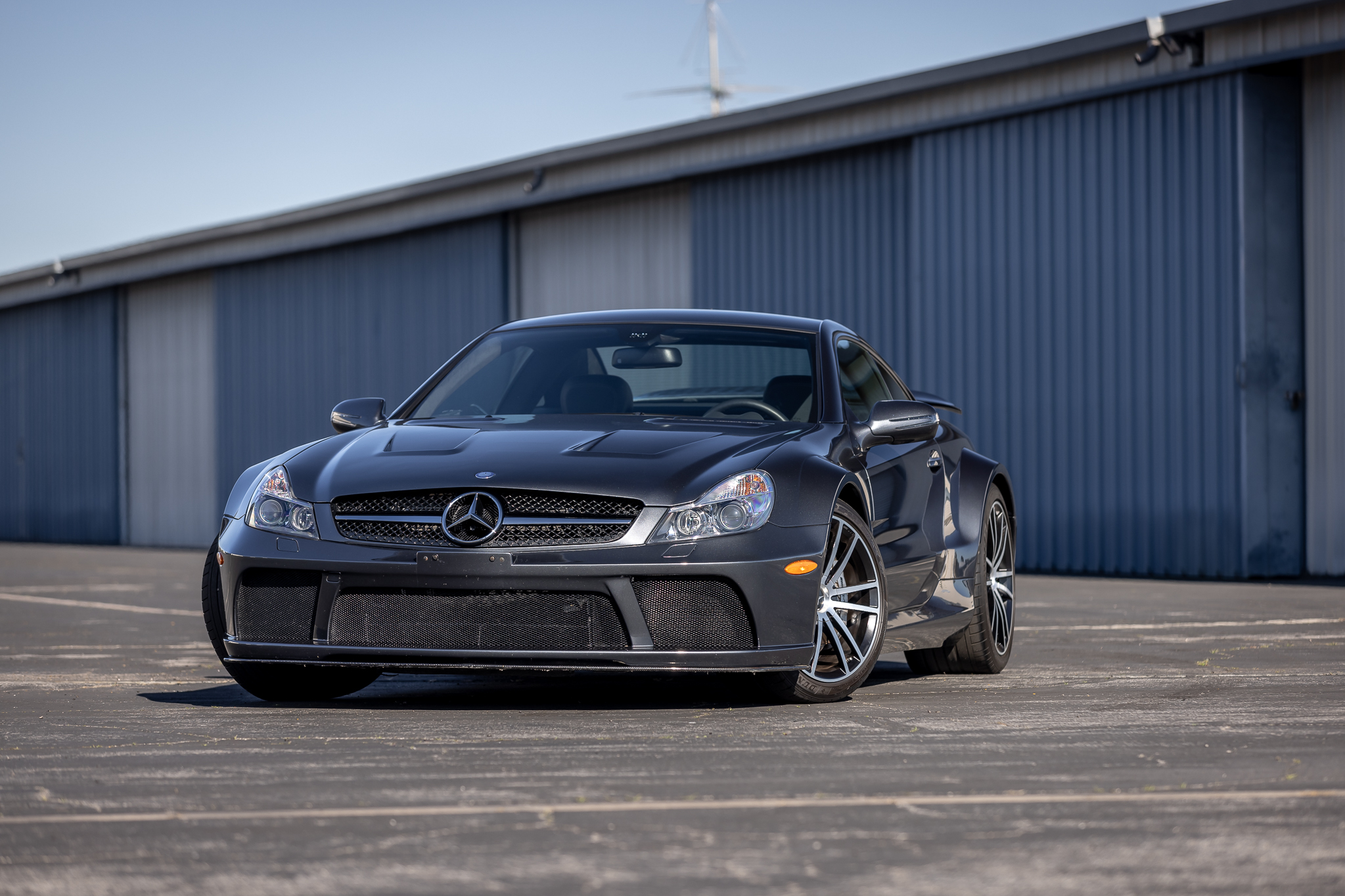 The forged 19″ and 20″ AMG twin-spoke alloy wheels are mounted with Dunlop SP Sport Maxx GT tires measuring 265/35 up front and 325/30 out back. The track is widened by 4.5” at the front and 4.1” at the rear compared to a standard SL65, and the car features an active-roll stabilization system and Electronic Stability Control. Stopping power is provided by silver AMG-branded calipers over slotted and cross-drilled rotors at all four corners. The seller notes the tires need to be replaced.
