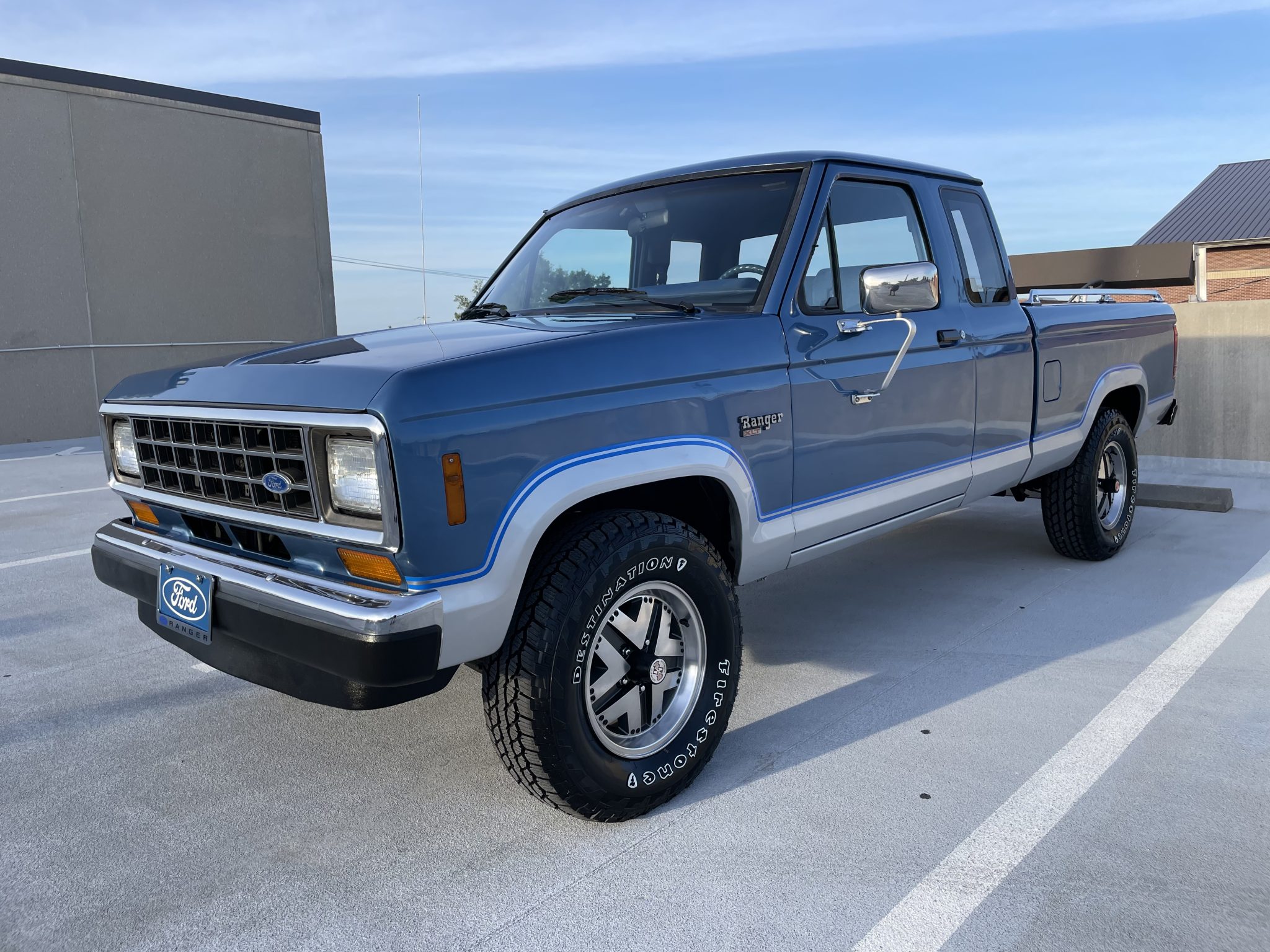 Silver-finished 15″ alloy wheels wear 235/75 Firestone Destination A/T 2 white-letter tires. A spare is located on the underside of the bed. Stopping power is provided by front disc and rear drum brakes, and the truck is equipped with Ford Motorcraft shocks.
