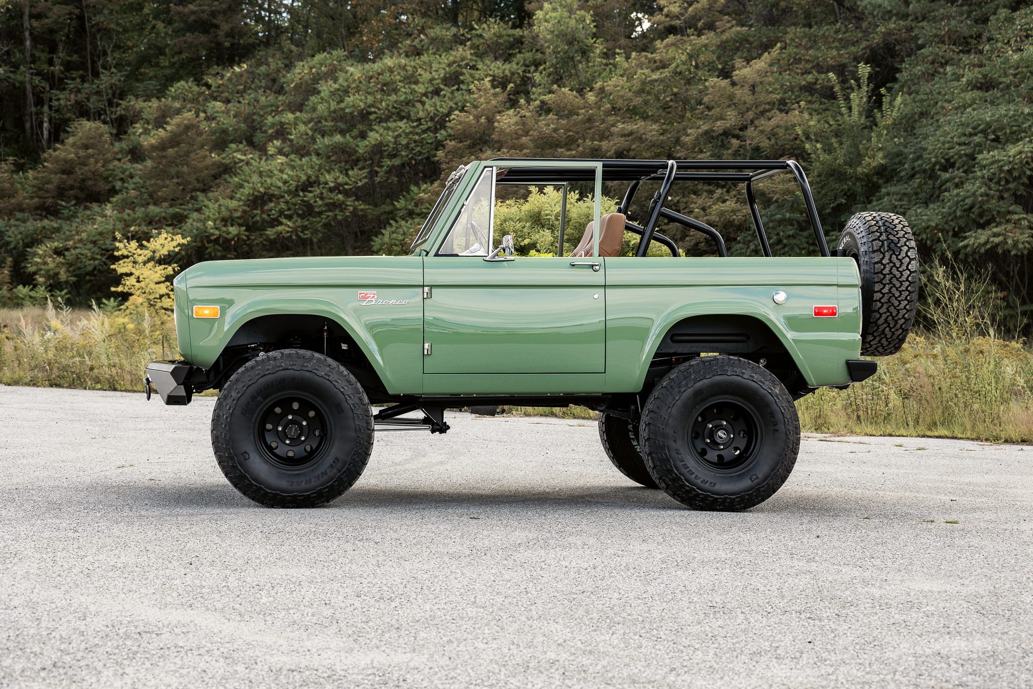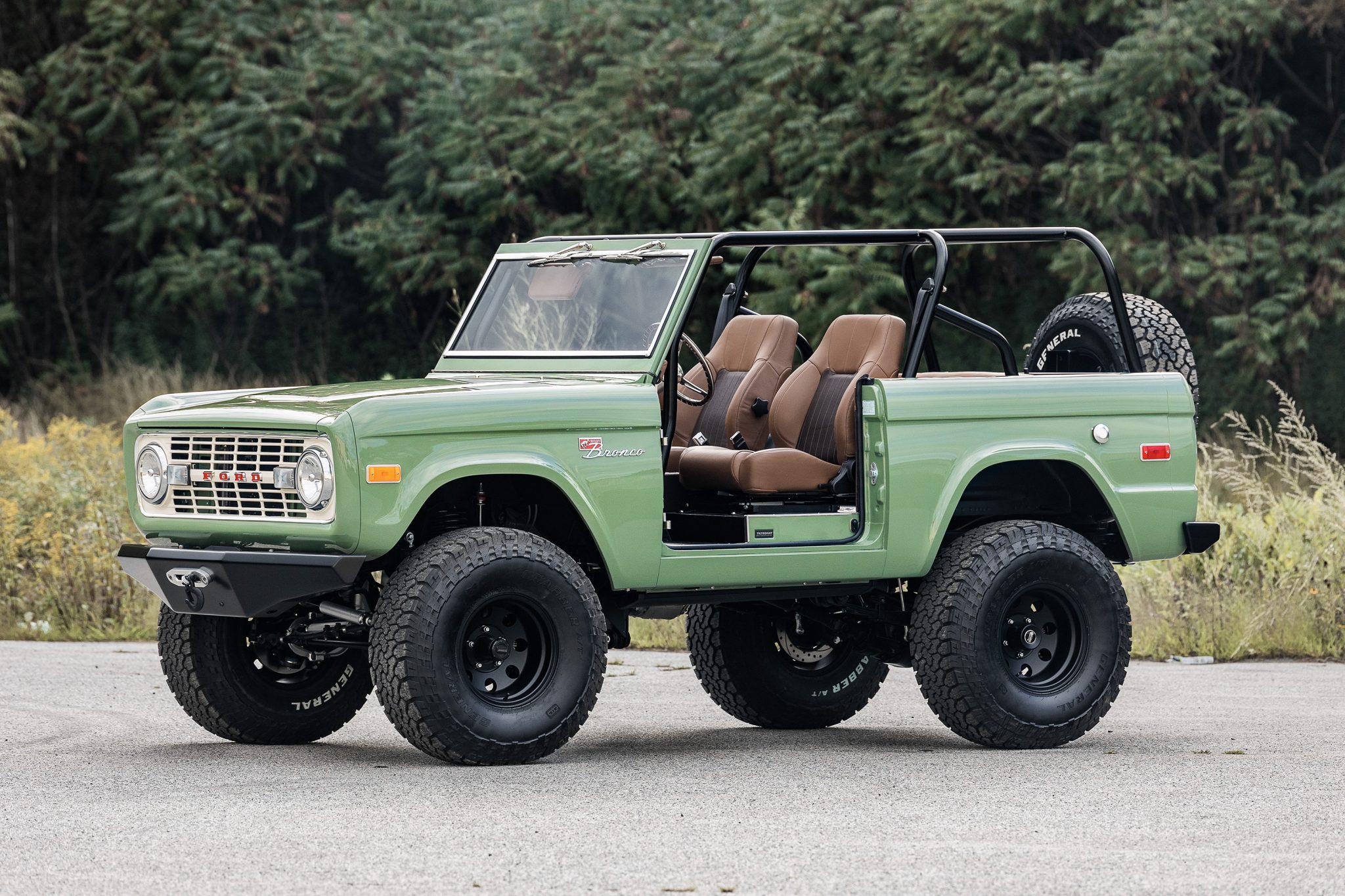 American Racing 15″ wheels are mounted over manually-locking front hubs and are wrapped in 35 x 12.5″ General Grabber A/TX tires. The truck is equipped with power steering, and modifications reported by the seller include a 2.5″ suspension lift, a 2″ body lift, front and rear sway bars with quick-disconnect links, and a retrofitted Wilwood disc brake system with six-piston front and four-piston rear calipers.