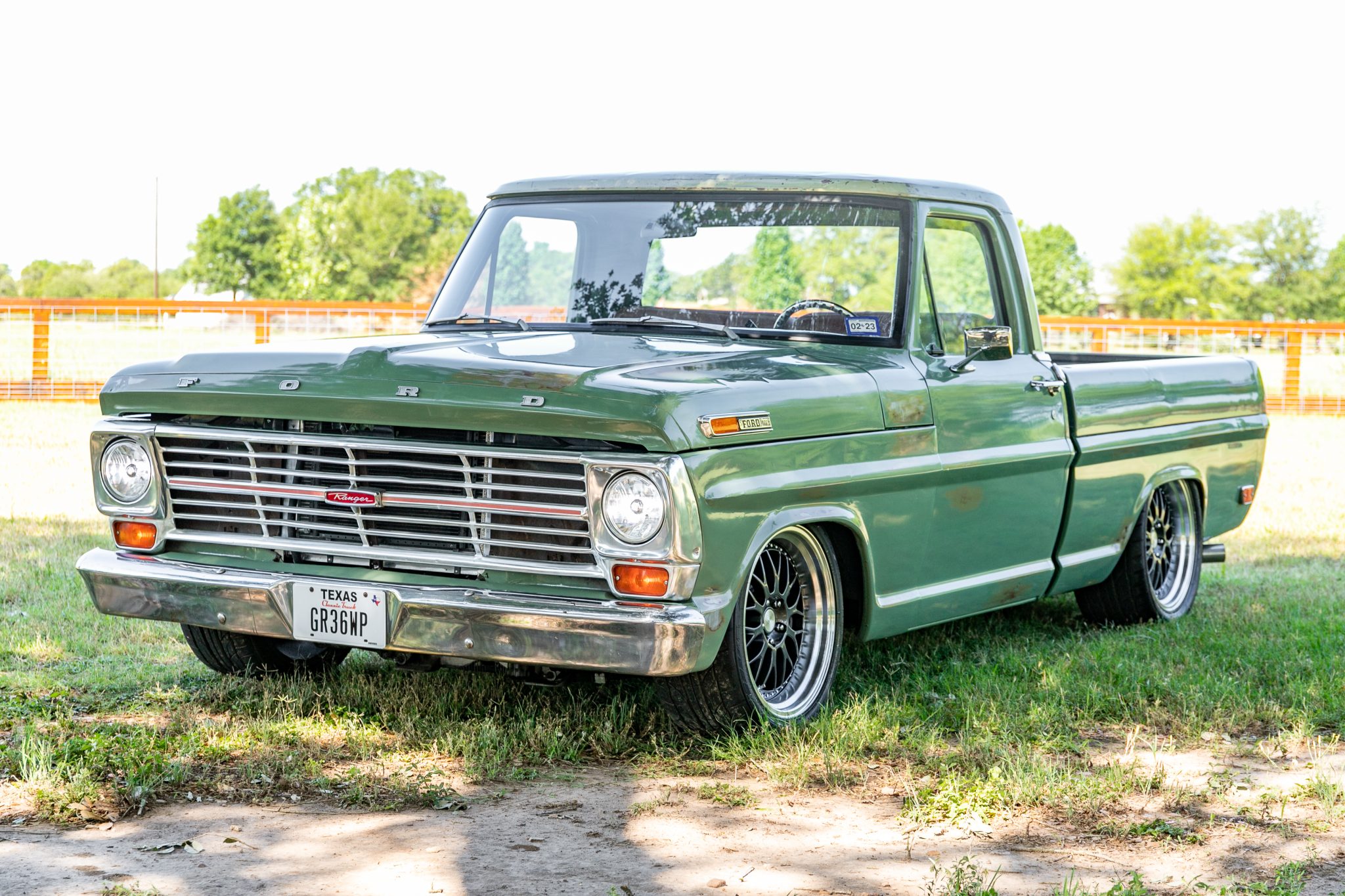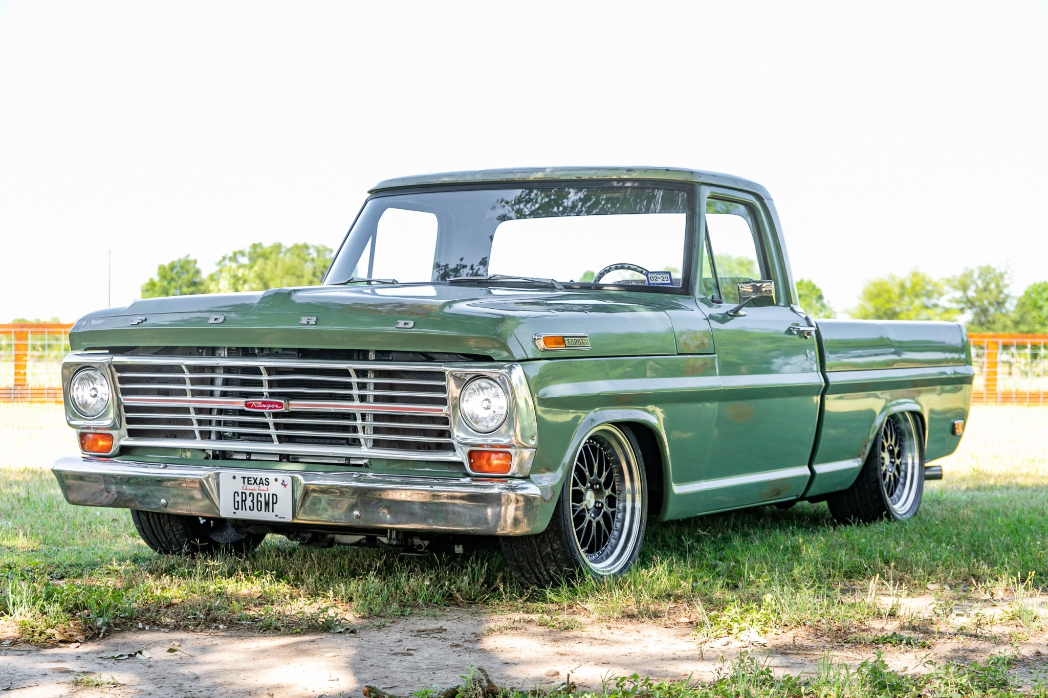 Gray 19″ ESR SR01 alloy wheels feature bright lips and are mounted with 275/35 front and 305/33 rear Nitto NT555 G2 tires. Independent front suspension components and rack-and-pinion steering from a 2008 Ford Crown Victoria have been installed, and the rear suspension was converted to an independent setup using components from a 2015 Ford Mustang. Team321 adjustable coilers have been installed, and stopping power is from power-assisted four-wheel disc brakes with cross-drilled and slotted rotors. The seller notes a whine from the power steering pump.