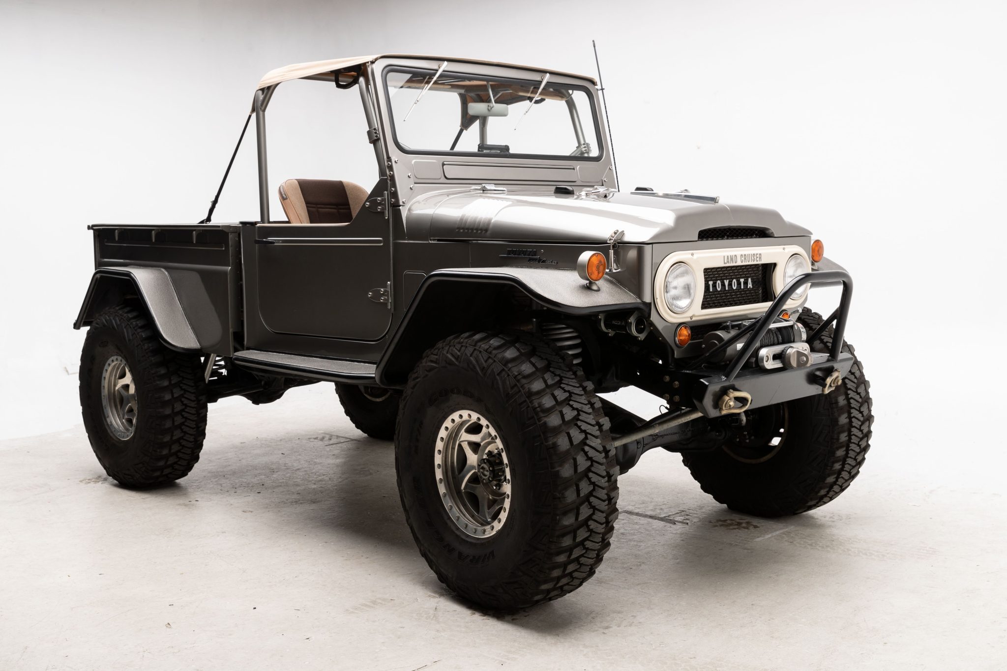 Walker Evans Racing 17″ beadlock wheels are mounted with 40×13.50″ Goodyear Wrangler kevlar tires all around, and Aisin manually locking hubs are fitted up front. The suspension is raised approximately 3″ using an Icon Slinky system with 2.5″ reservoir shocks, custom-made coil springs, adjustable panhard bars and rear links, and Slee Off-Road trailing arms. Additional modifications include a power steering system with hydraulic assist, a 105-series Land Cruiser steering box with a drop pitman arm, and disc brakes at each corner.
