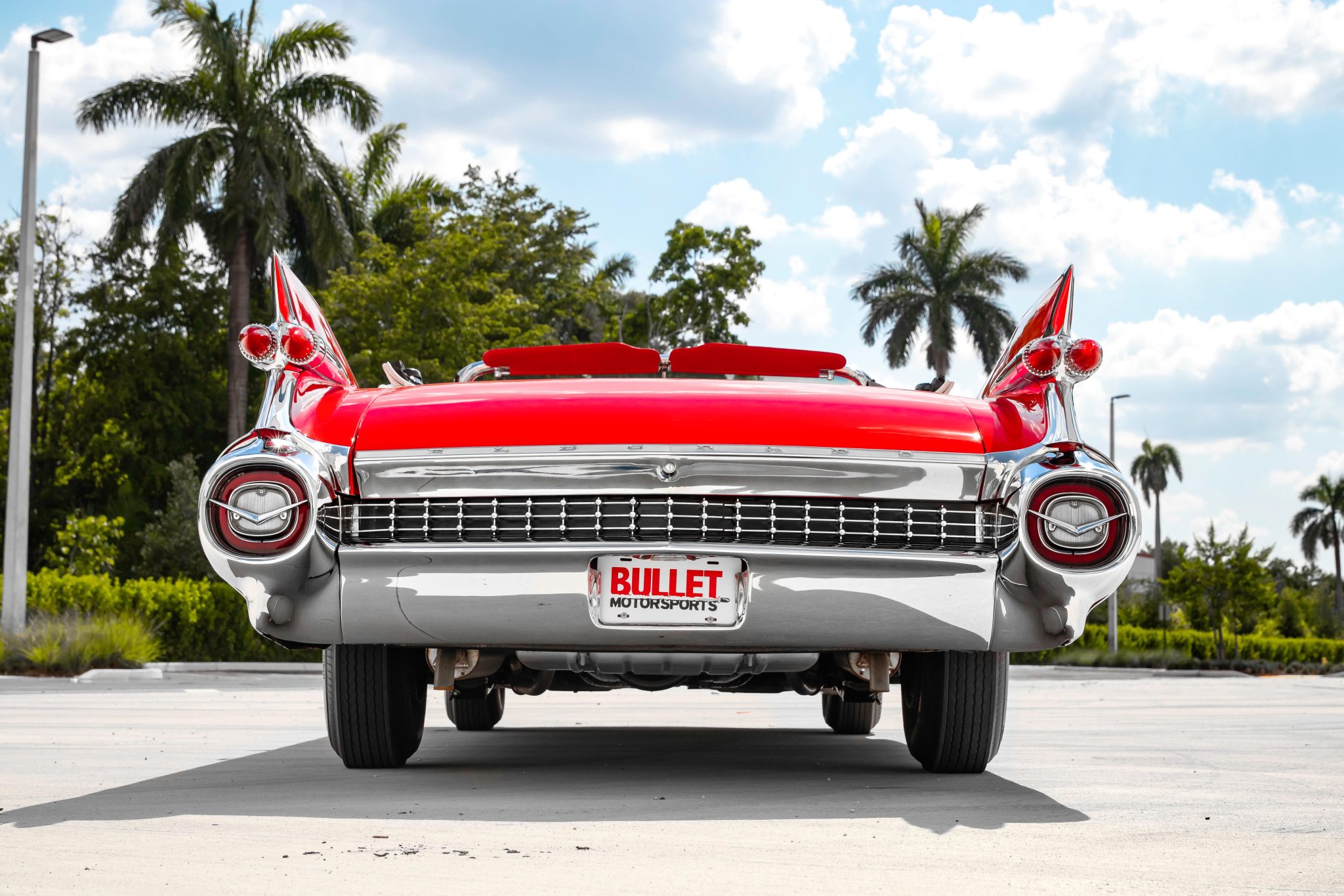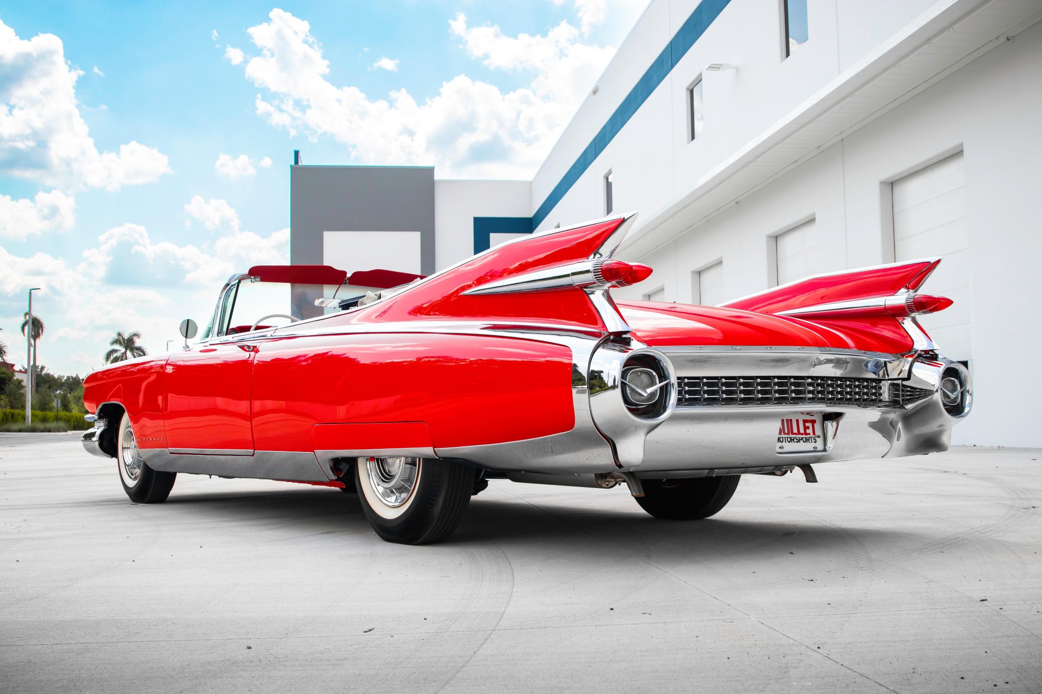 The power-operated white convertible soft top is shown raised in the gallery below. Steel wheels measure 15″ in diameter and are fitted with full covers as well as wide-whitewall tires. Braking is from power-assisted drums at all four corners.