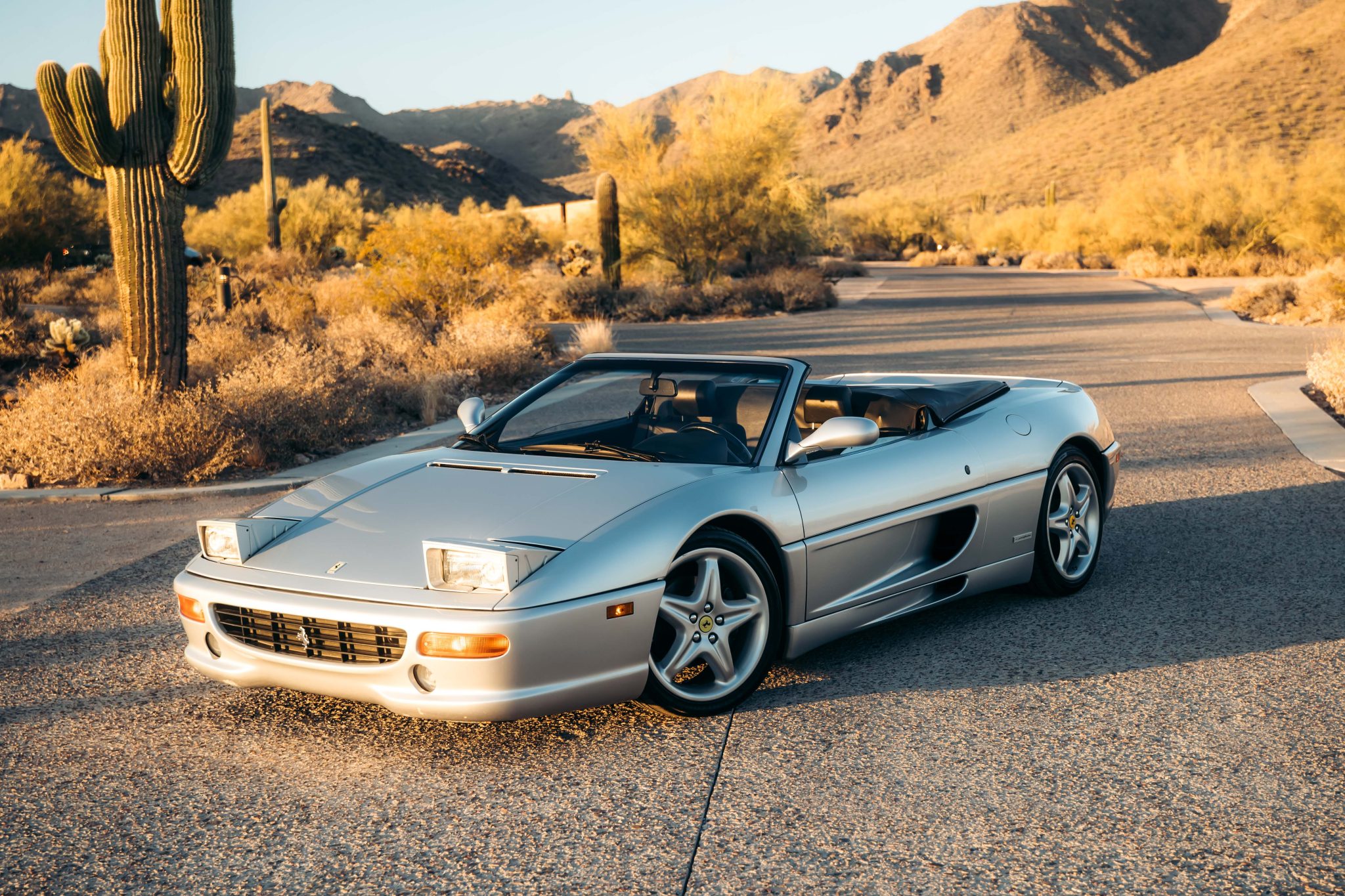 The 18″ five-spoke wheels are mounted with Sumitomo HTR Z5 tires. Ferrari-branded brake calipers are mounted over vented discs at each corner.