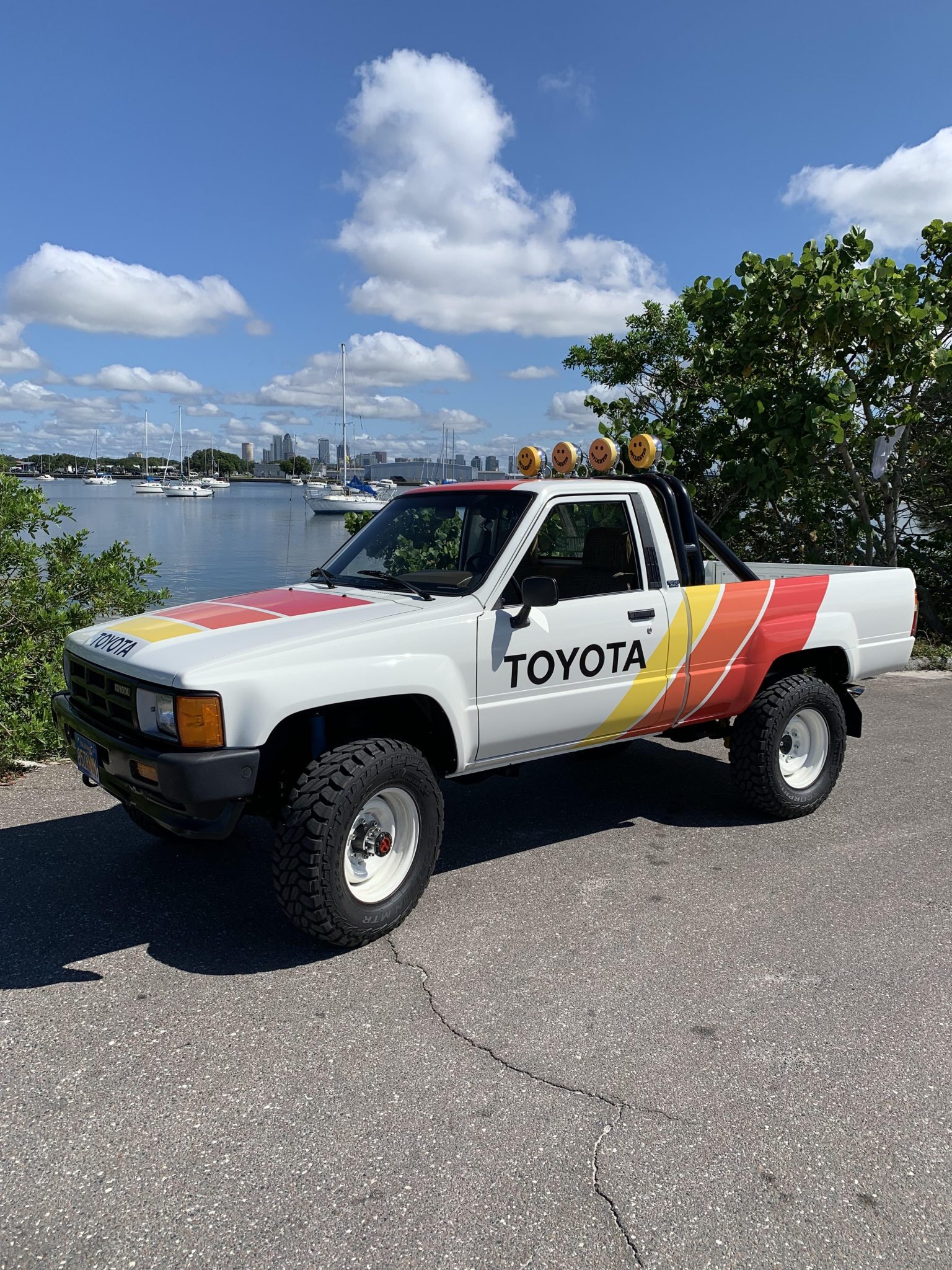 White-painted 15″ steel wheels are mounted with 30×9.5″ Pirelli Scorpion MTR tires with 2015 date codes. A spare wheel and tire are stored beneath the bed. The truck is equipped with manually locking front hubs as well as Bilstein shocks, and stopping power is provided by front disc and rear drum brakes. The steering gear was replaced in September 2021, and the seller notes that the rear brake line was repaired under current ownership.