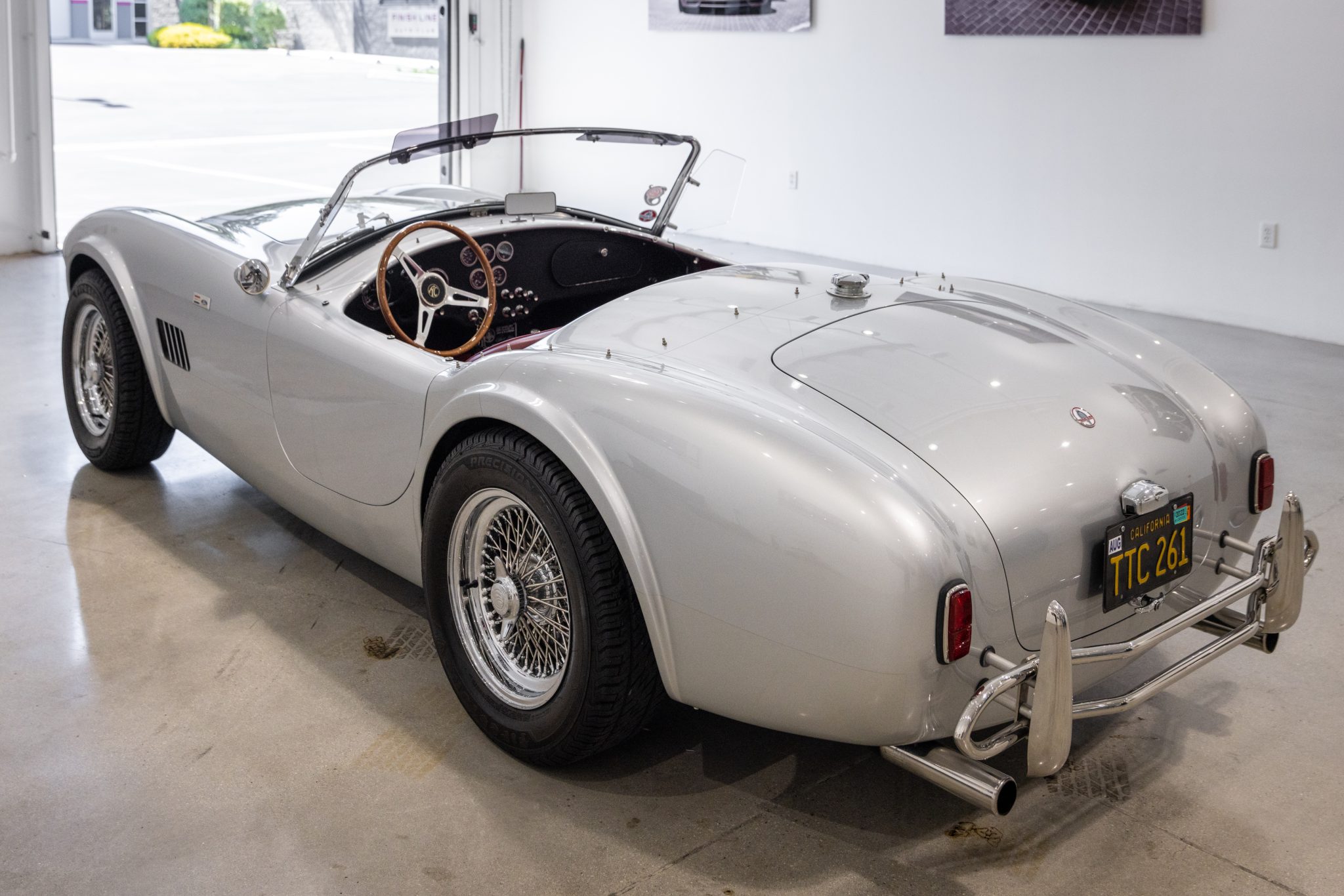 Chrome 15” Dayton wire wheels wear two-eared knock-off spinners and are mounted with 205/65 Firestone Precision Sport tires. A spare tire is located in the trunk. Stopping power is provided by four-wheel discs with Shelby-branded calipers.