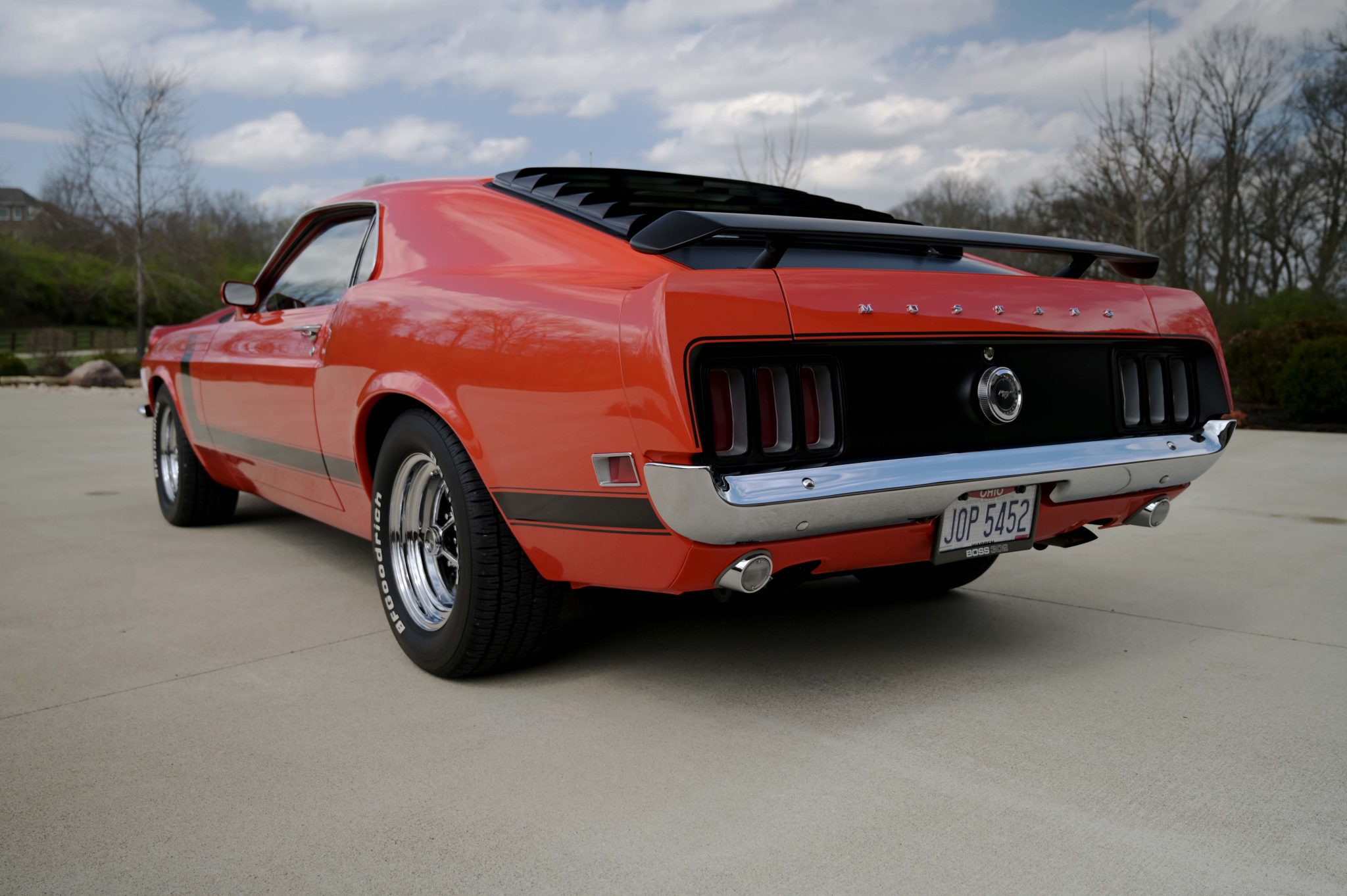 The 15” Magnum 500-style wheels are mounted with BFGoodrich Radial T/A white-letter tires. A space-saver spare is housed in the trunk. Power-assisted front discs were standard equipment on the 1970 Boss 302.