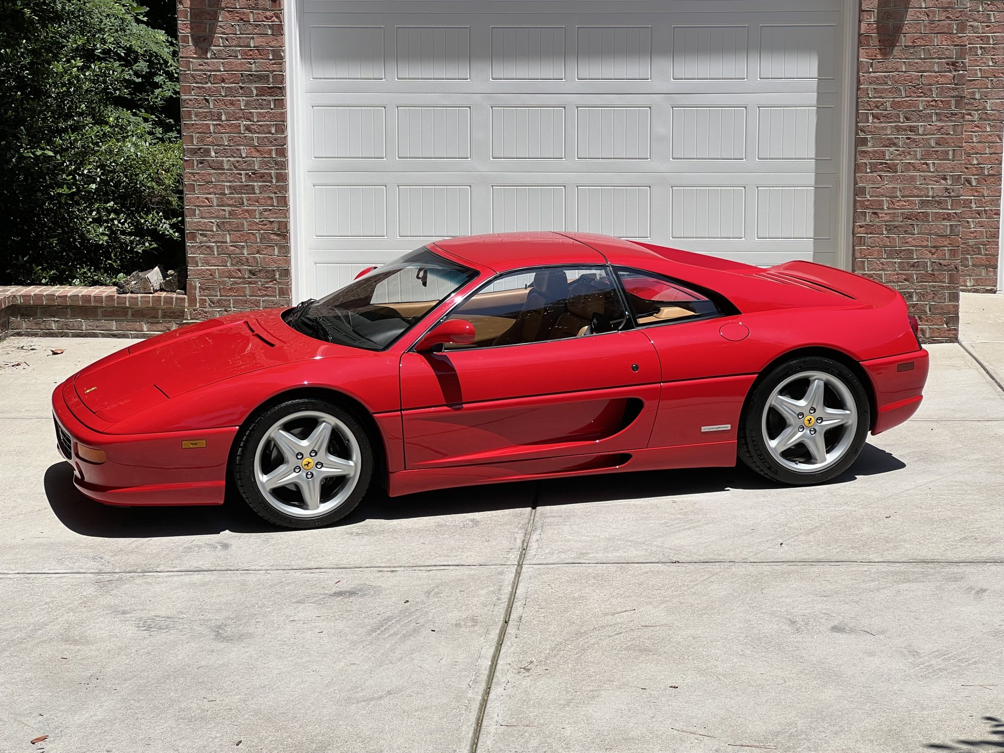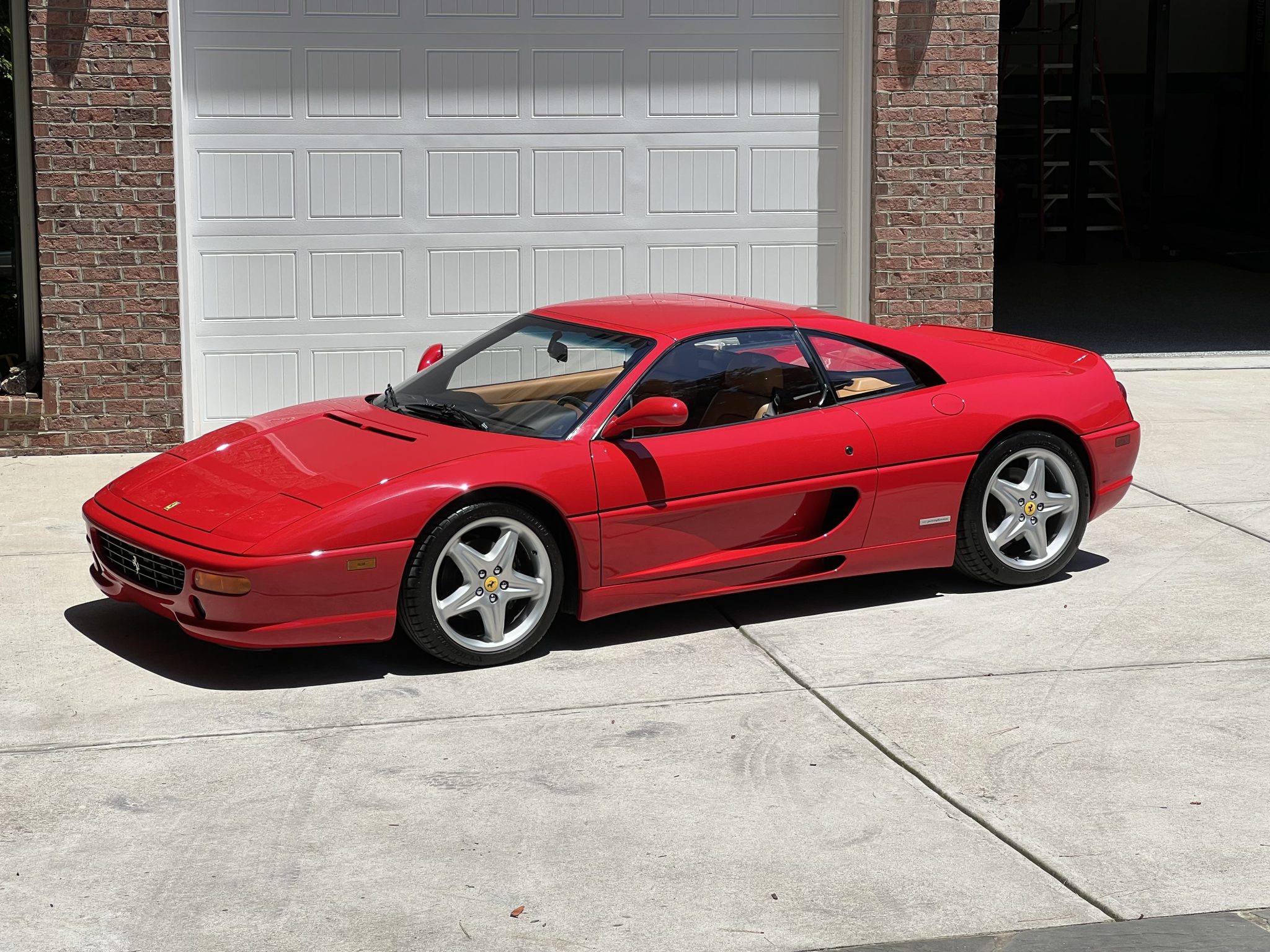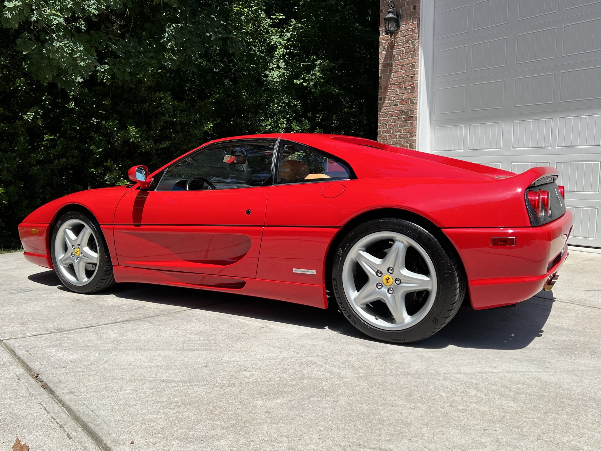 Staggered-width 18″ five-spoke wheels wear yellow Cavallino Rampante center caps and are mounted with 225/40 front and 265/40 rear Michelin Pilot Sport 4S tires that show 2018 date codes. Ferrari-branded brake calipers are mounted over vented discs at each corner, and the brakes were last bled in February 2021. Chips on the wheels can be seen near the lug nuts.