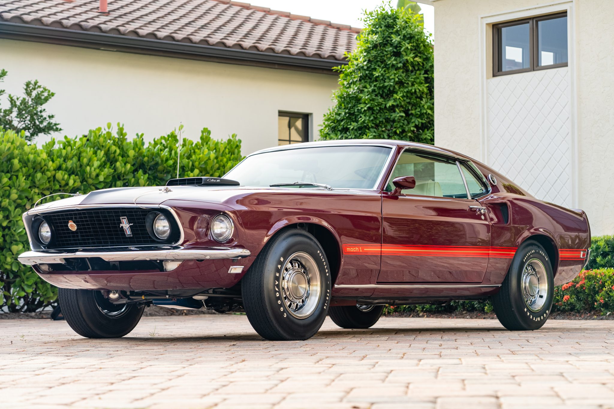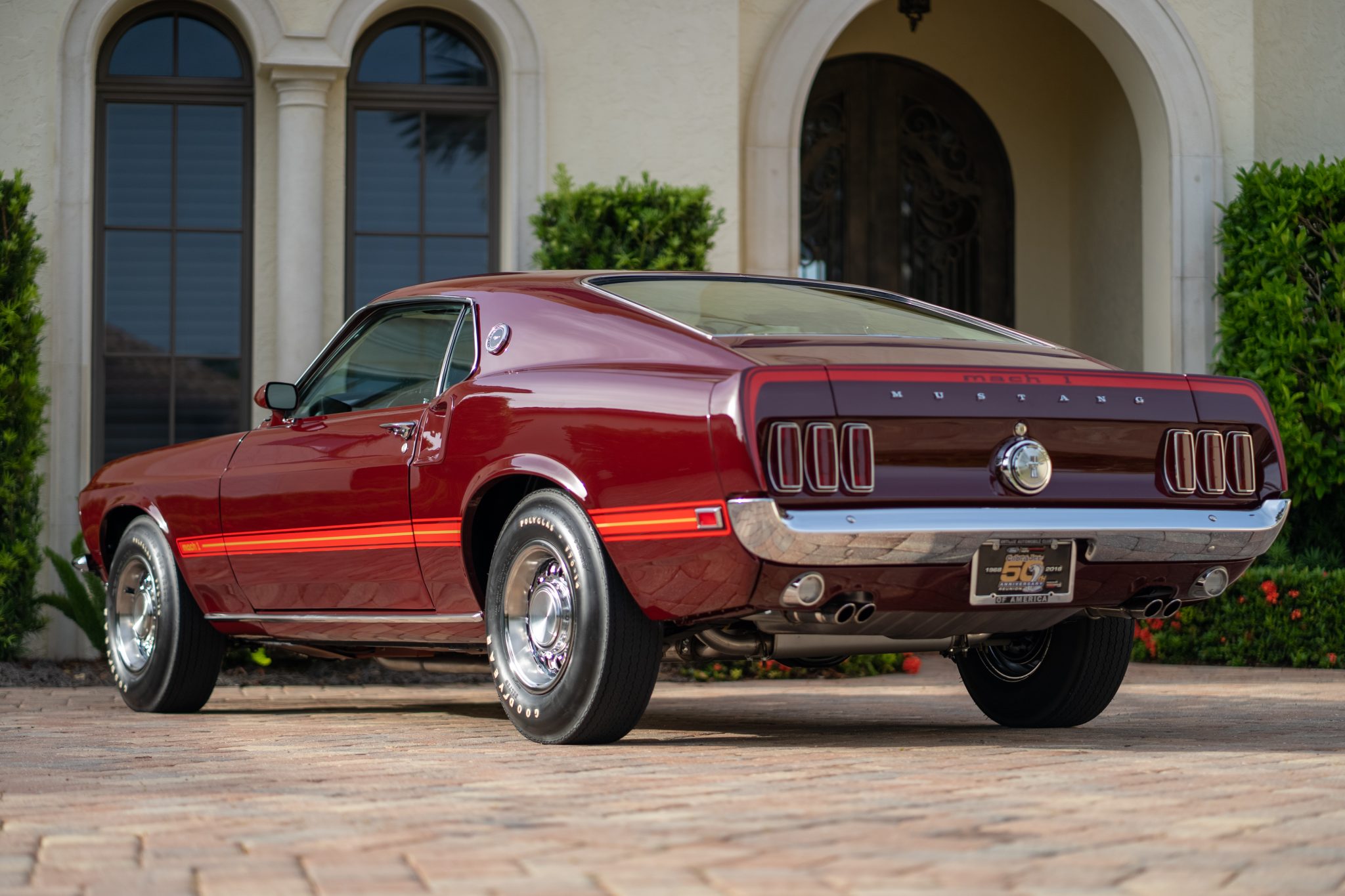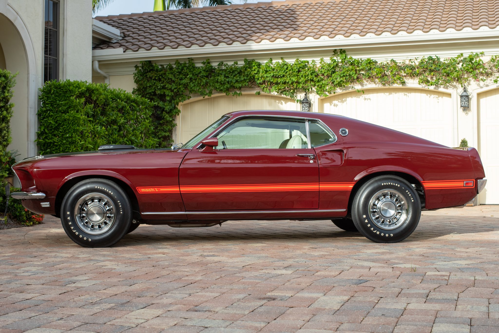 Styled 14″ steel wheels are mounted with F70-14 Goodyear Polyglas tires. Mach 1 models were equipped from the factory with Handling Suspension, and braking is managed by power-assisted front discs and rear drums.