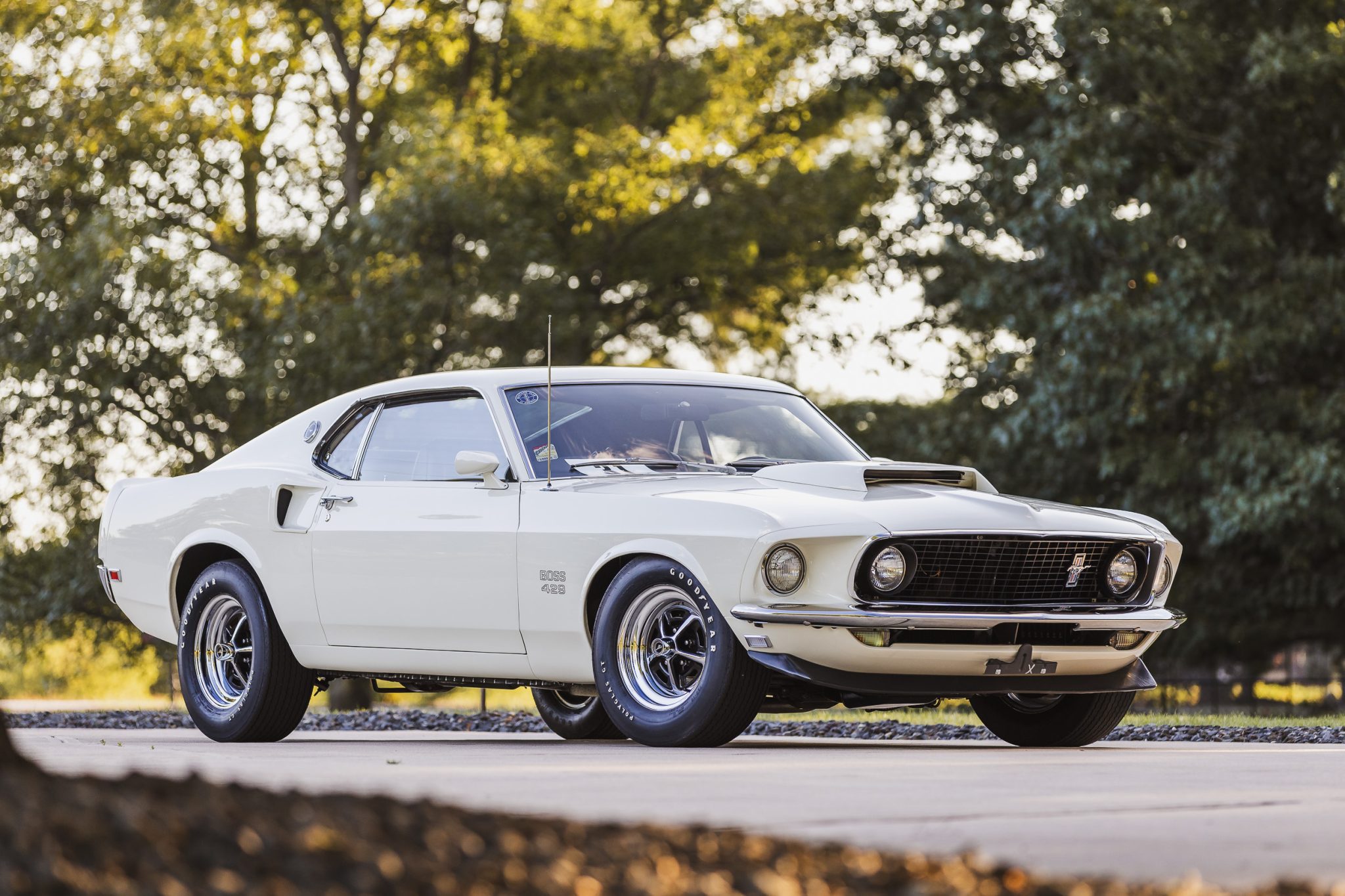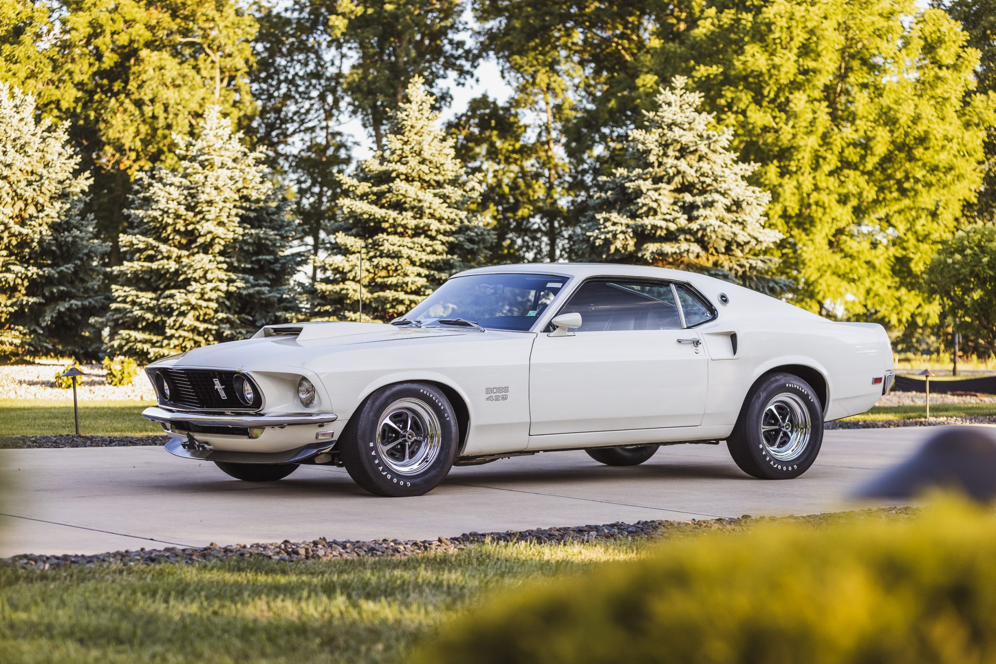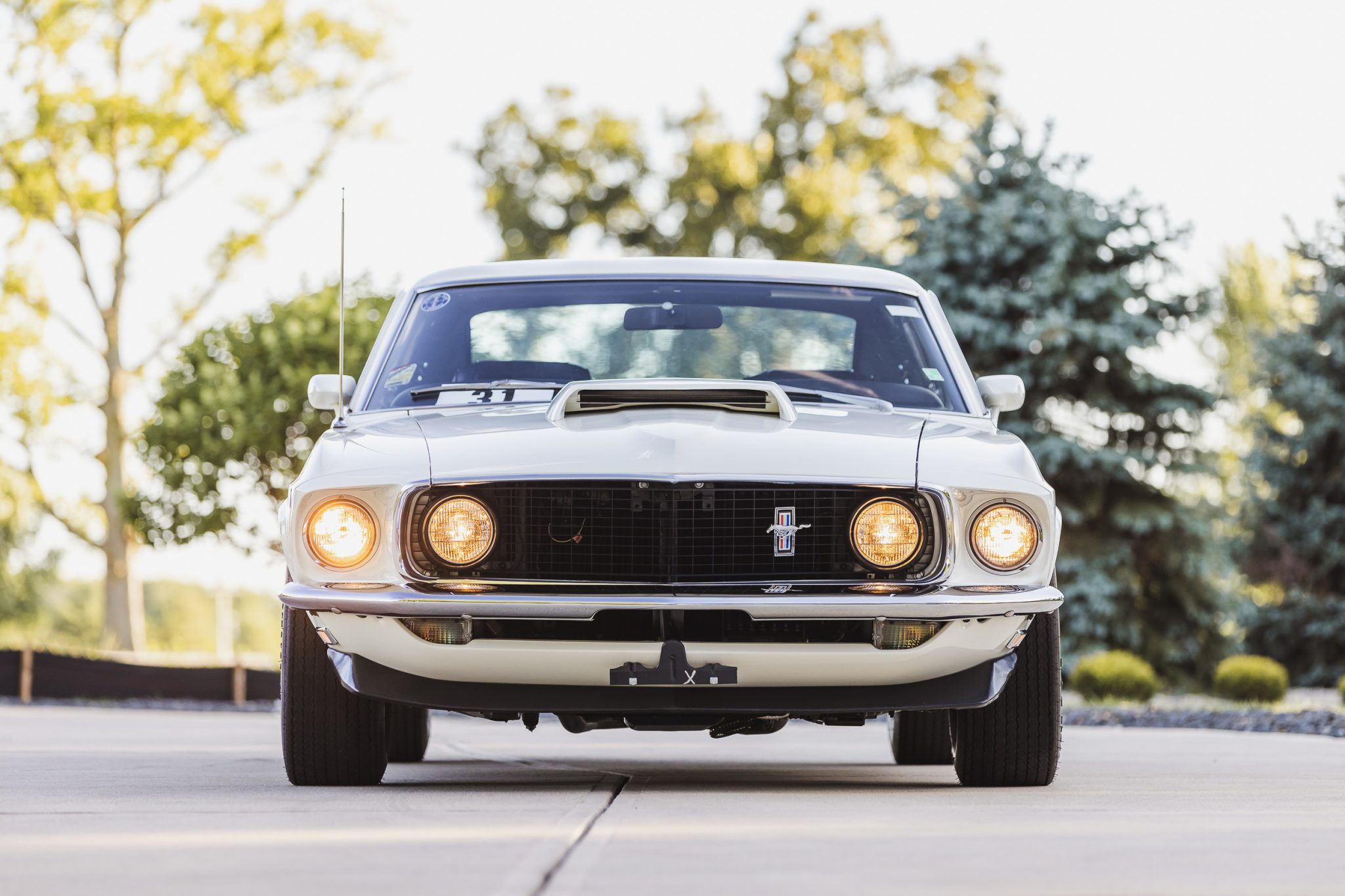 The 15″ Magnum 500 wheels are mounted with raised-letter Goodyear Polyglas GT F60-15 tires. The Boss 429 model was equipped with revised control arms, a higher-rate front anti-roll bar than other Mustang variants, a rear anti-roll bar, and staggered rear shock absorbers. Power-assisted brakes with discs up front and drums out back were standard on the 429, with the front brakes reinforced with heavy-duty hubs and rotors as well as oversized spindles. Power-assisted steering was also equipped from the factory.