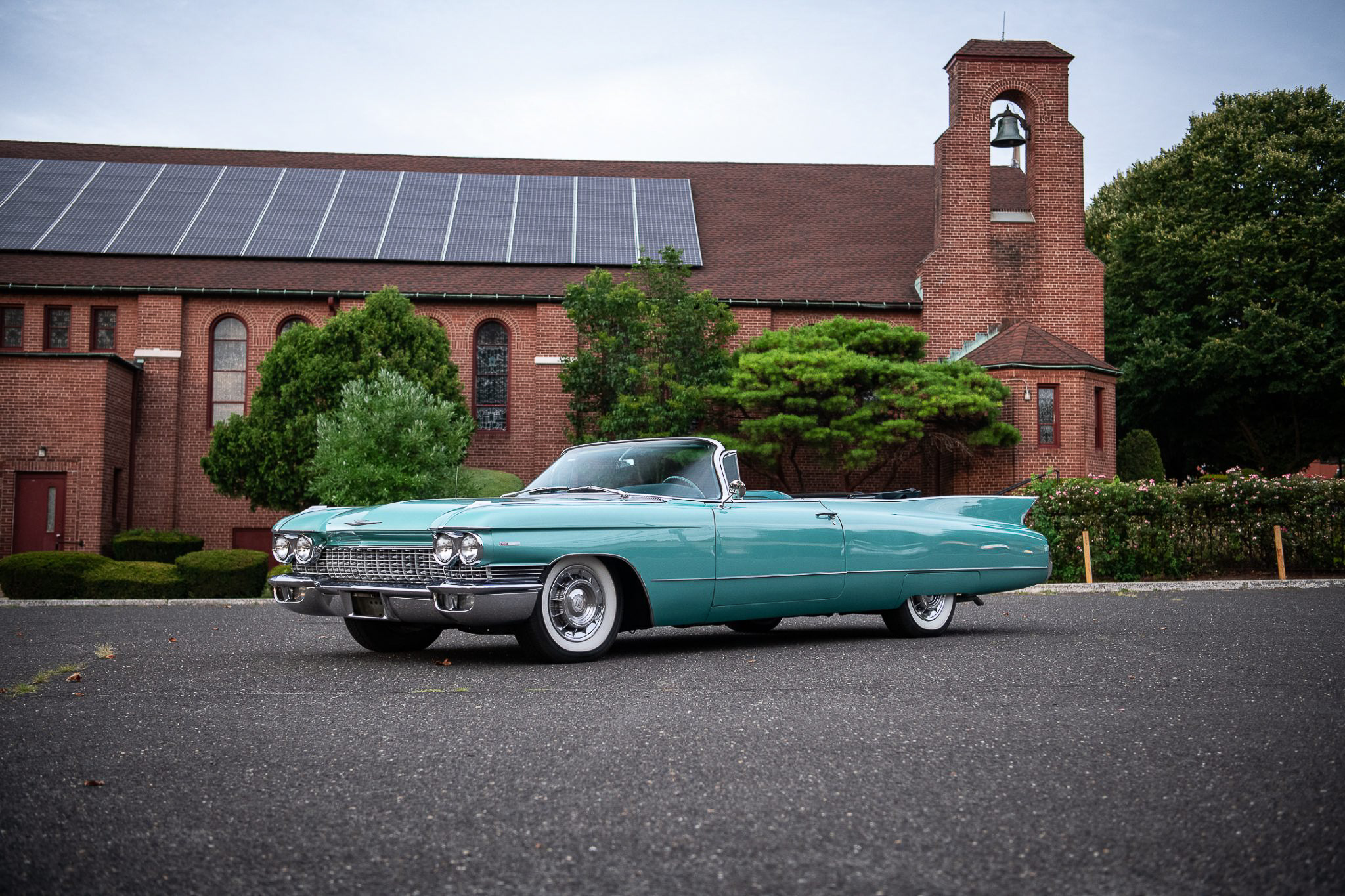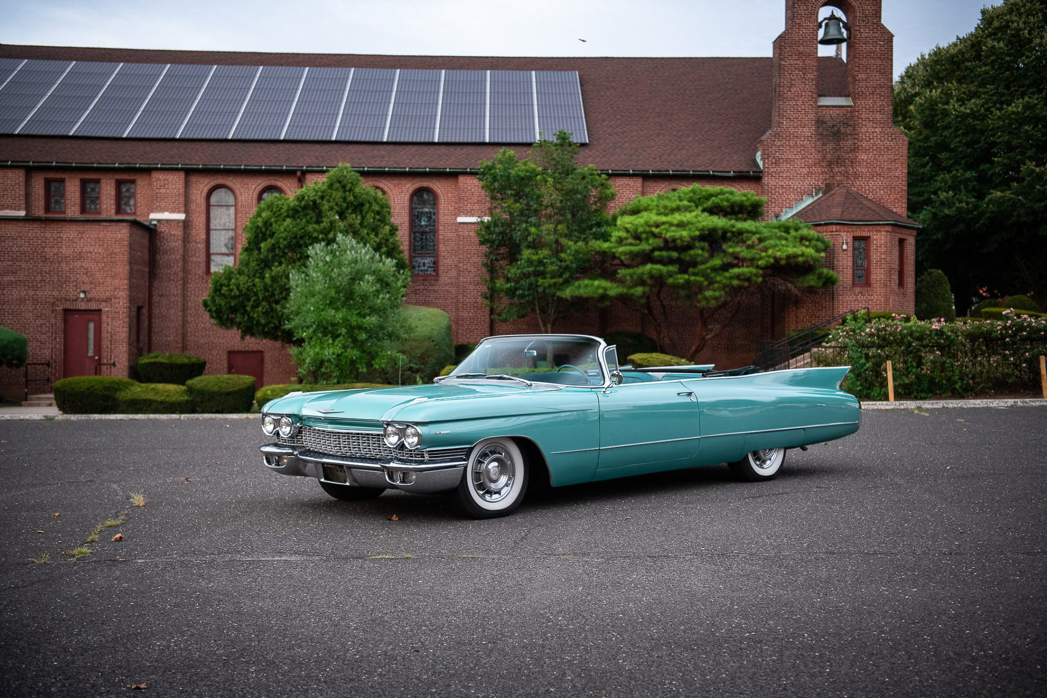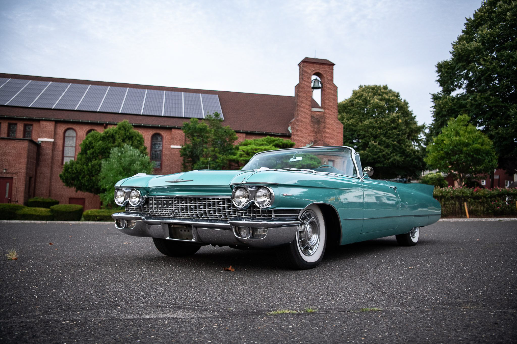 The steel wheels wear Cadillac-crest covers and wide-whitewall tires. The brake system is vacuum-assisted and makes use of a dual-reservoir master cylinder, and the car is also equipped with power-assisted steering.