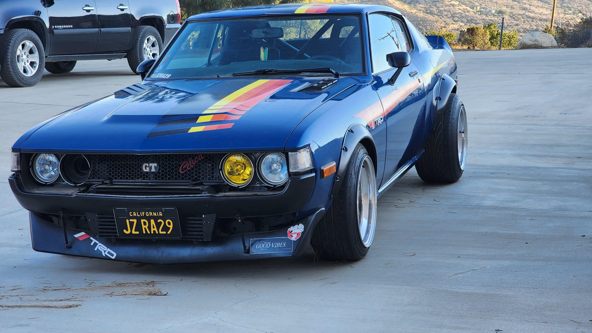 Multi-piece 16″ Epsilon wheels with gold mesh centers and polished outer barrels have been built to custom staggered widths of 9″ up front and 12″ out back. They are mounted with 205/45 Firestone Firehawk Indy 500 front tires and 245/45 Toyo Proxes rear tires. The chassis is said to have been modified with Techno Toy Tuning coilovers, tubular front control arms, an aftermarket steering linkage, a CUSCO front strut tower brace, and rear traction bars. The four-wheel disc brakes utilize Wilwood front calipers sourced from Techno Toy Tuning.