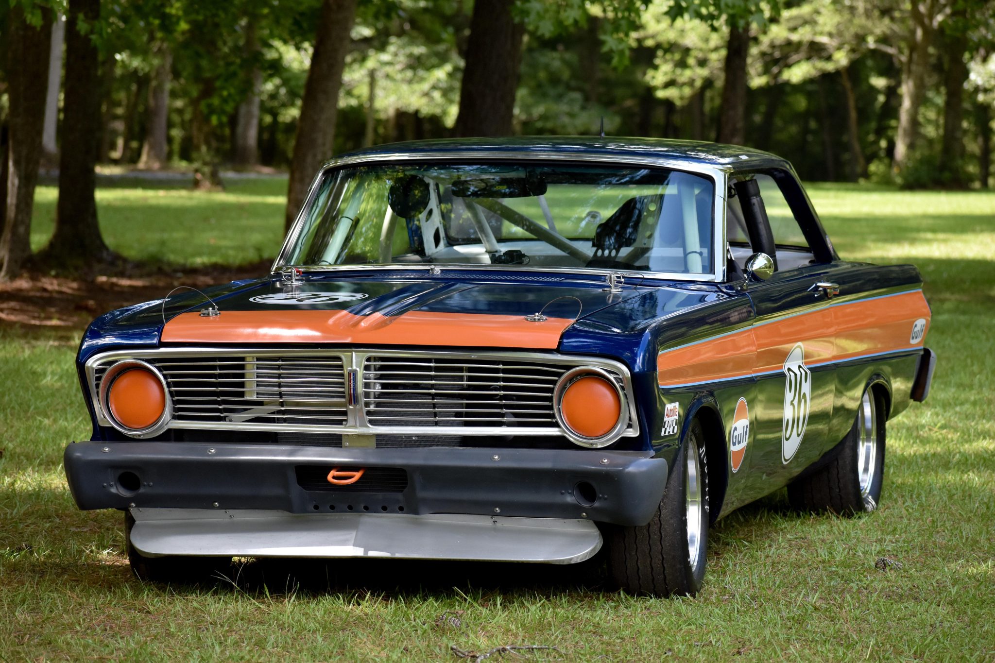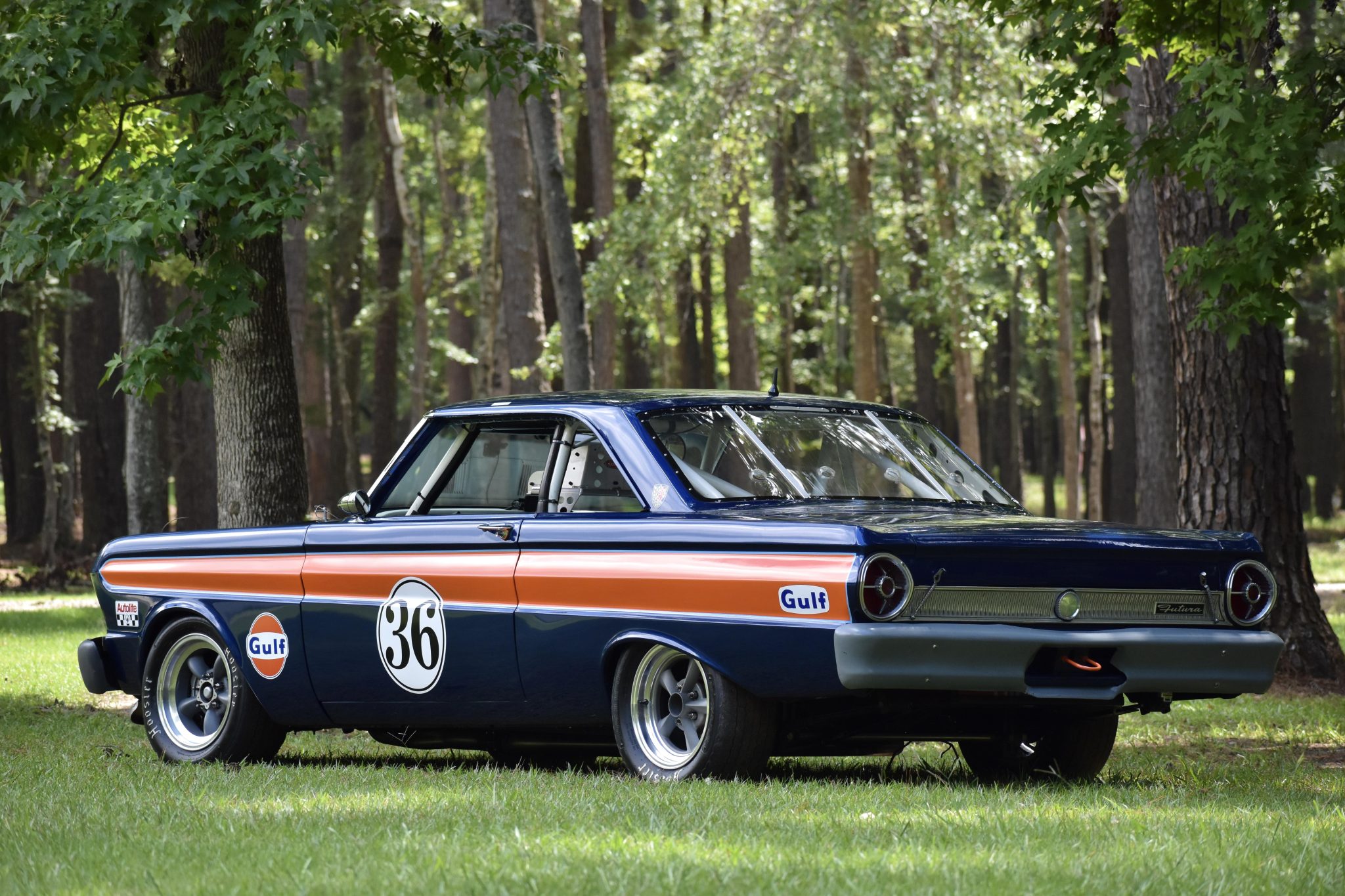 The 15” Torq Thrust wheels are mounted on Cobra Automotive hubs and wear Hoosier semi-slick tires. Braking is handled by Wilwood front discs, SSBC Mustang-spec 10” rear discs, Raybestos pads, and dual master cylinders. The seller notes that the removed rear drum brake assembly will accompany the vehicle, along with ten spare wheels, six of which are mounted with rain tires. Suspension and steering modifications are said to include the following components: