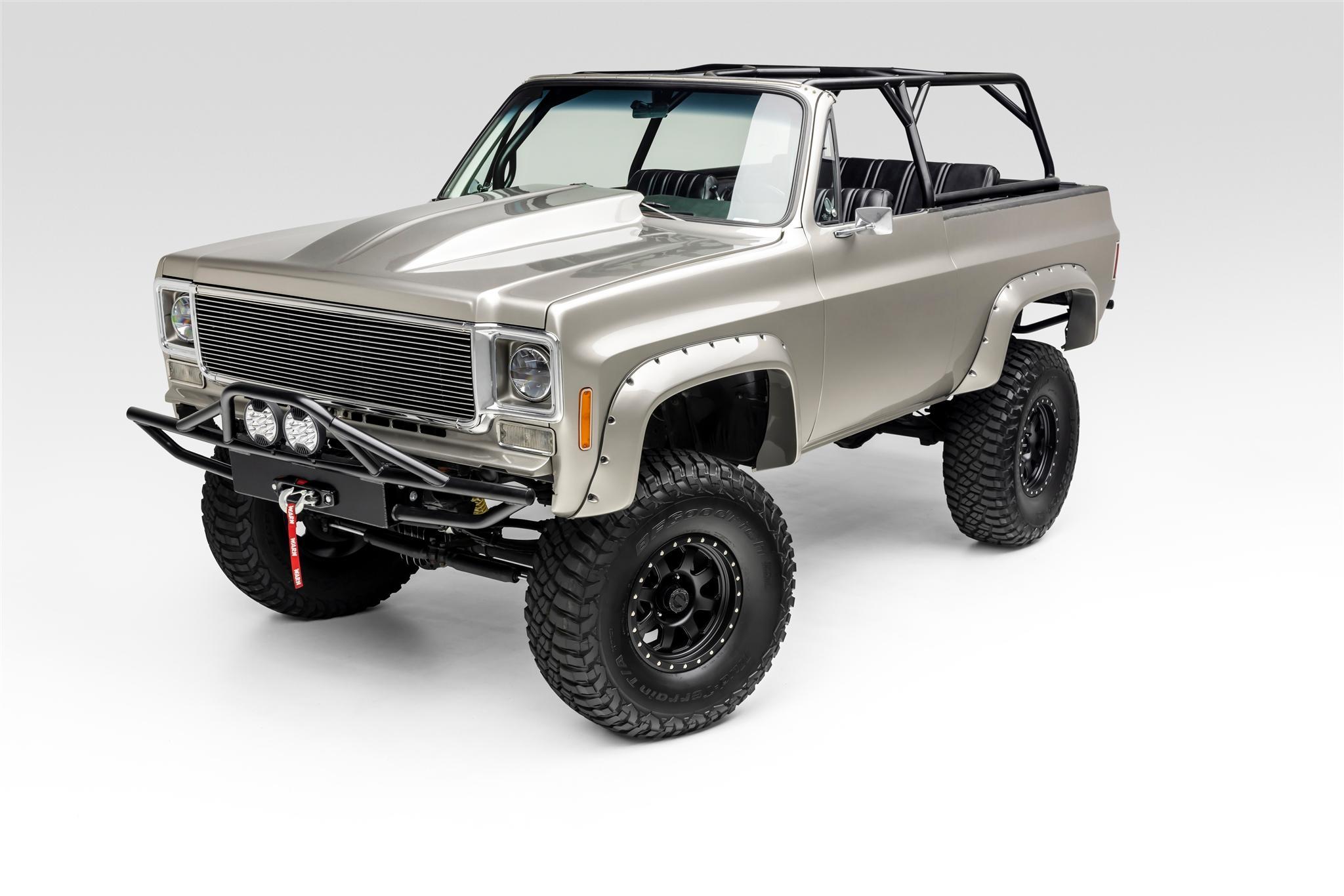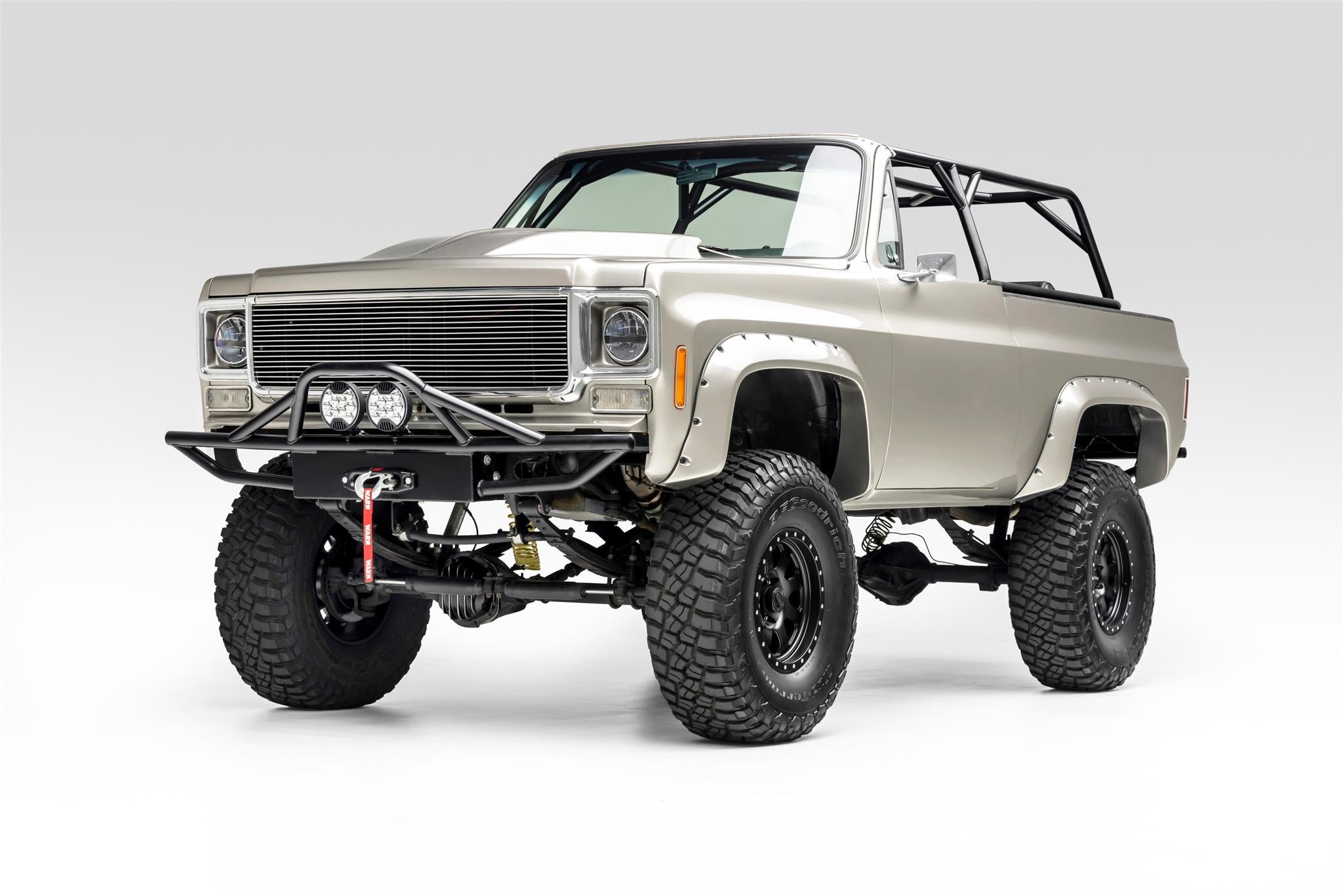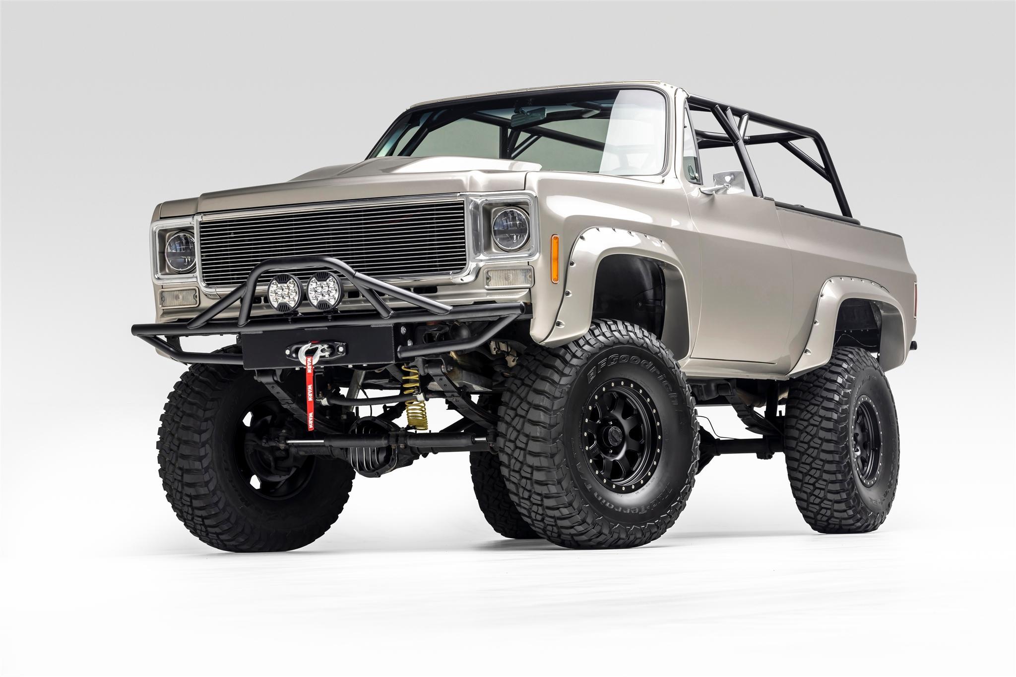 Raceline 17” wheels are mounted with wheel spacers and wear 39×13.5” BFGoodrich Mud-Terrain KM3 tires that were installed in July 2022. The front axle is equipped with manually locking hubs, and braking is handled by front discs and rear drums. A steering box brace is said to be welded to the frame. The suspension is reportedly lifted 8″ by Superlift leaf springs and is fitted with Bilstein 5150 shocks on the front axle.