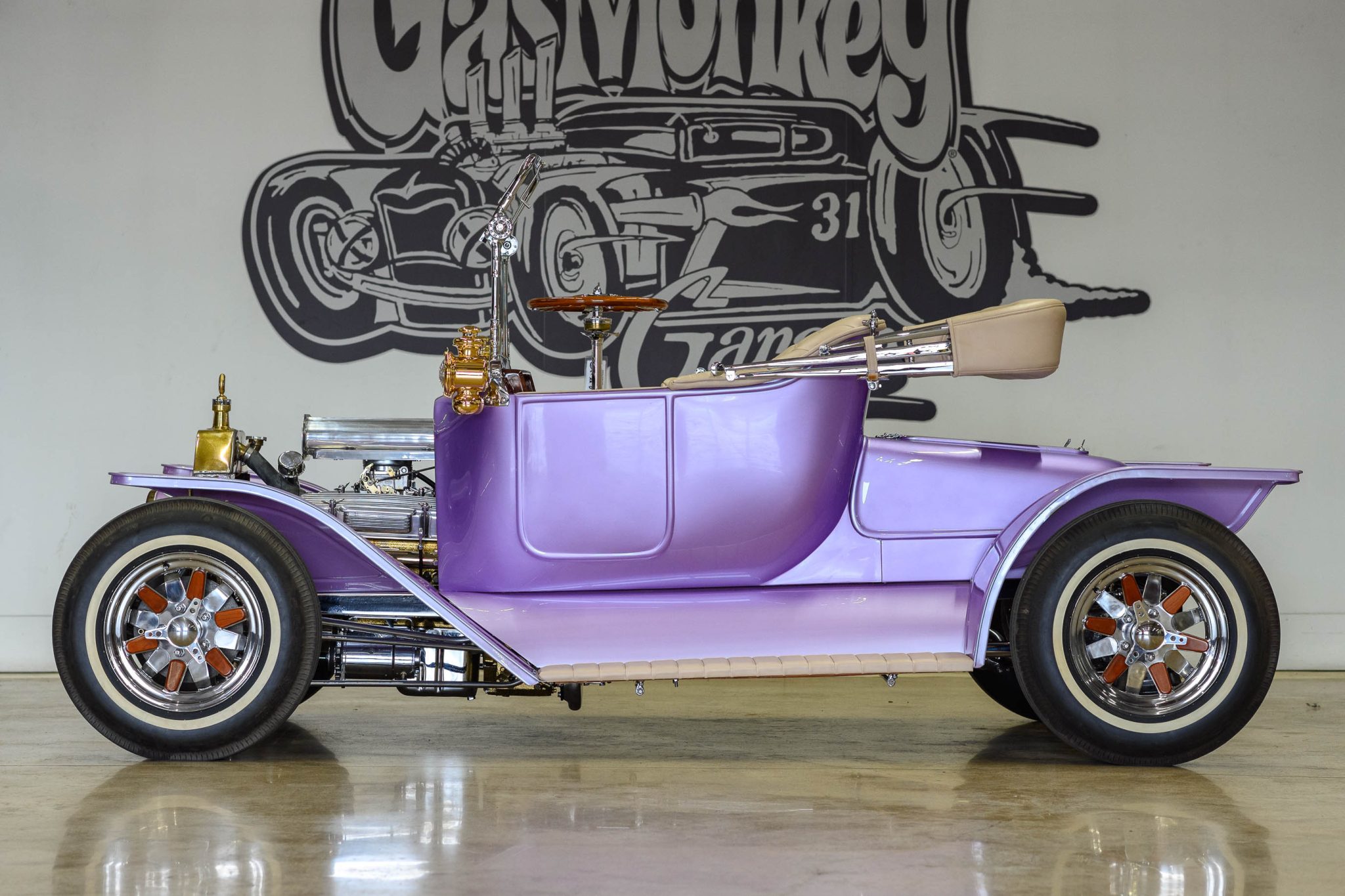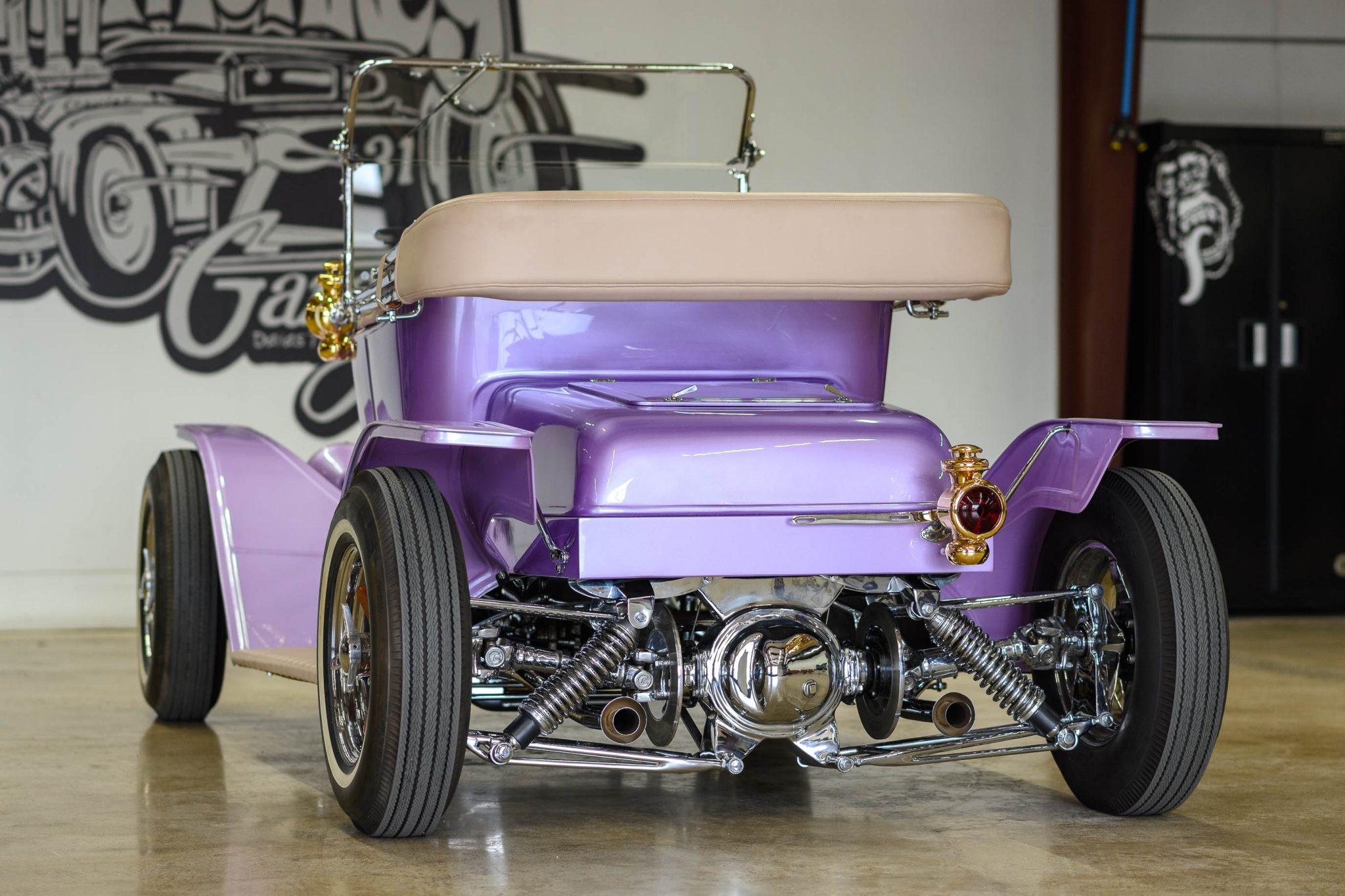 The 15″ chrome wheels feature faux knock-off hubs and wood inlays, and they are mounted with US Royal Safety 800 whitewall bias-ply tires. The car is built on a custom tubular steel frame and utilizes chromed Jaguar XKE-sourced independent rear suspension components, front radius rods, chrome front tube shocks, and front coil springs. Stopping power is provided by four-wheel disc brakes with inboard rear units.