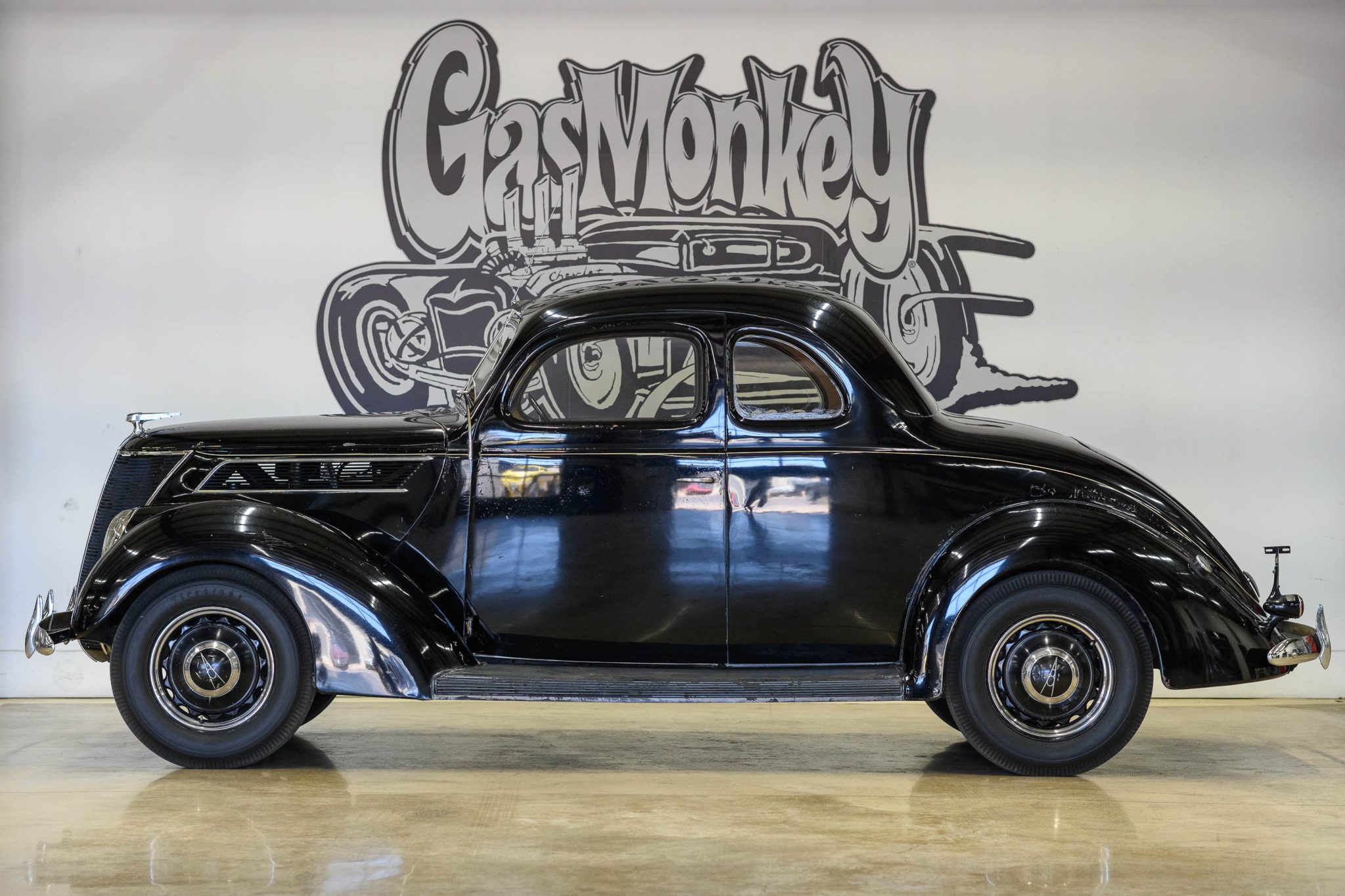 The body-color artillery-style wheels wear chrome trim rings and center caps and are mounted with 6.00–16 Firestone bias-ply tires. A matching spare wheel with an older bias-ply tire is mounted in the trunk. The Model 78 rode on a 112″ wheelbase and featured transverse front and rear leaf springs. Stopping power is provided by hydraulically-actuated drums at all four corners.
