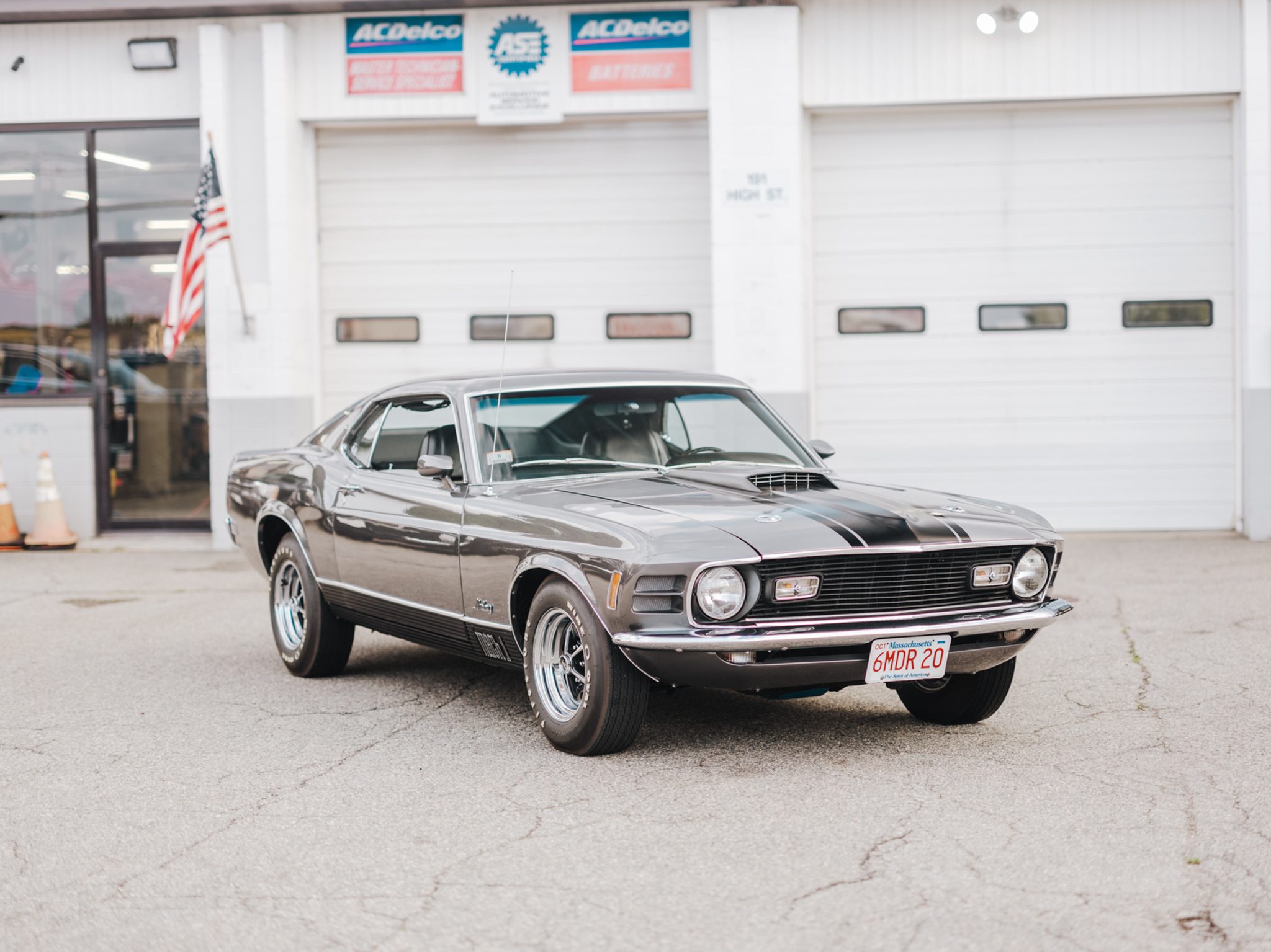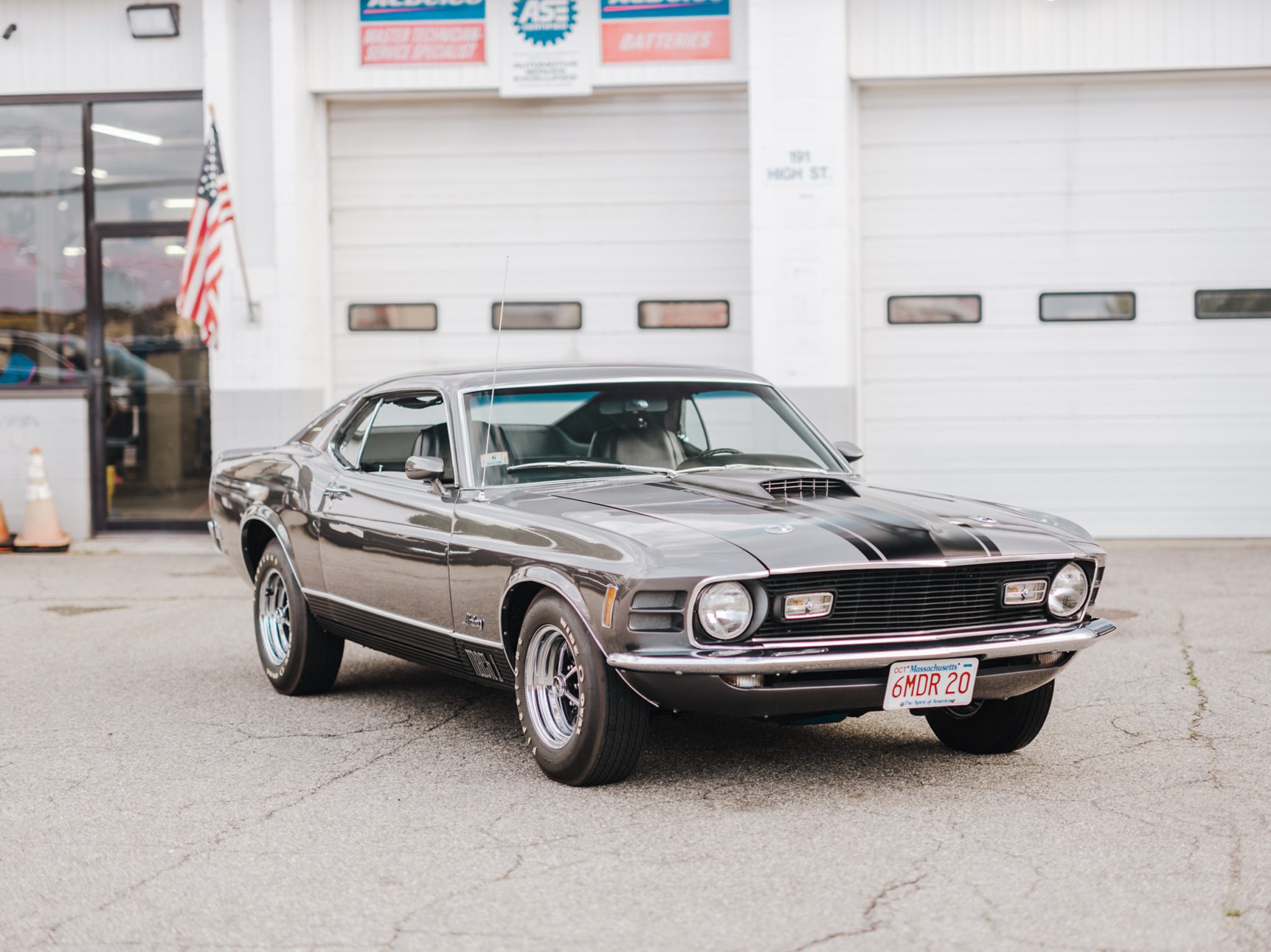 Chrome Magnum 500 wheels are mounted with E70-14 Firestone Wide Oval white-letter tires. The car is equipped with power steering, and braking is handled by power-assisted front discs and rear drums.