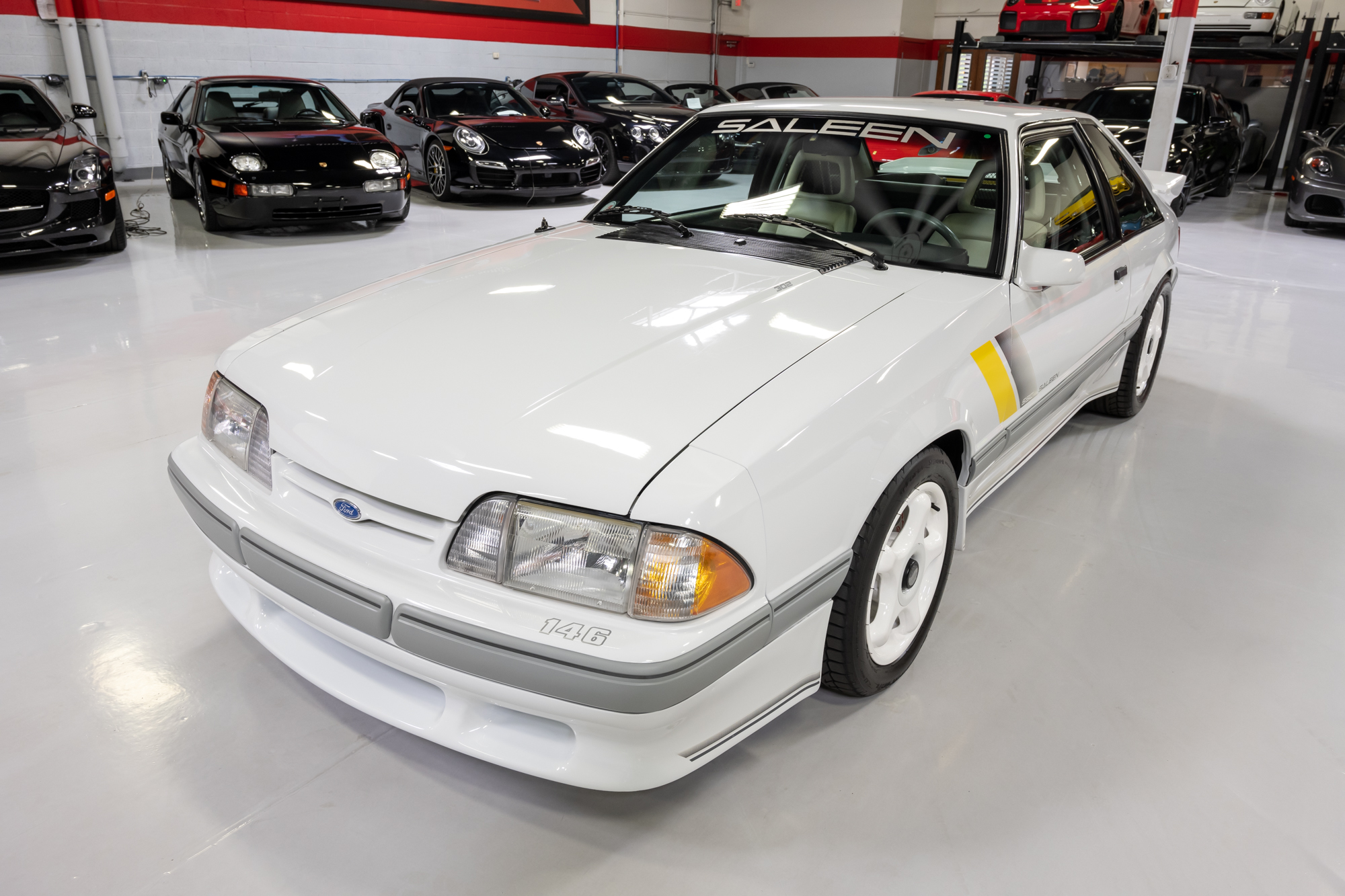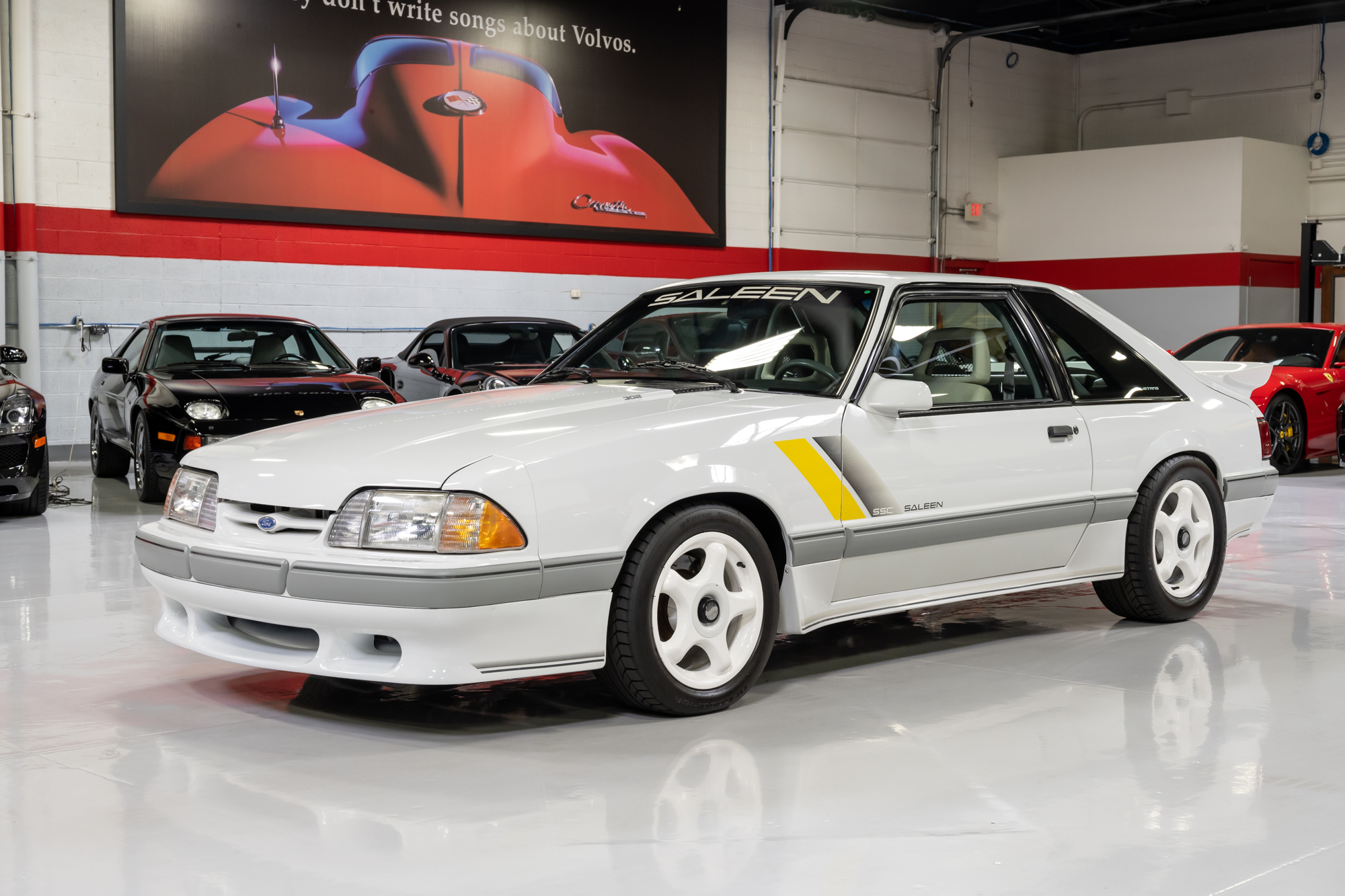 Oxford White 16″ five-spoke alloy wheels with Saleen-logo center caps are wrapped in 225/50 front and 255/50 rear BFGoodrich g-Force Sport Comp-2 tires. The Saleen-installed Racecraft suspension included electronically-adjustable Monroe Formula GP shocks and struts, a Monroe Formula GP axle damper, strut tower braces, and urethane sway bar pivot bushings. Baer brakes were reportedly fitted under prior ownership.