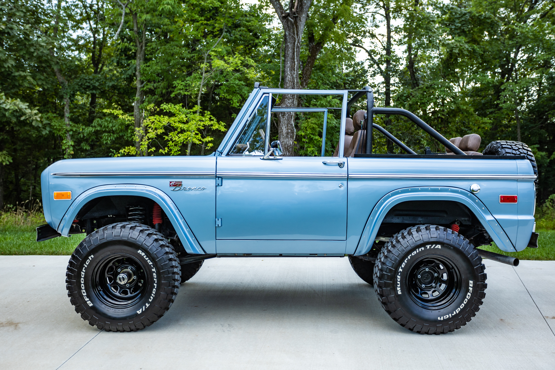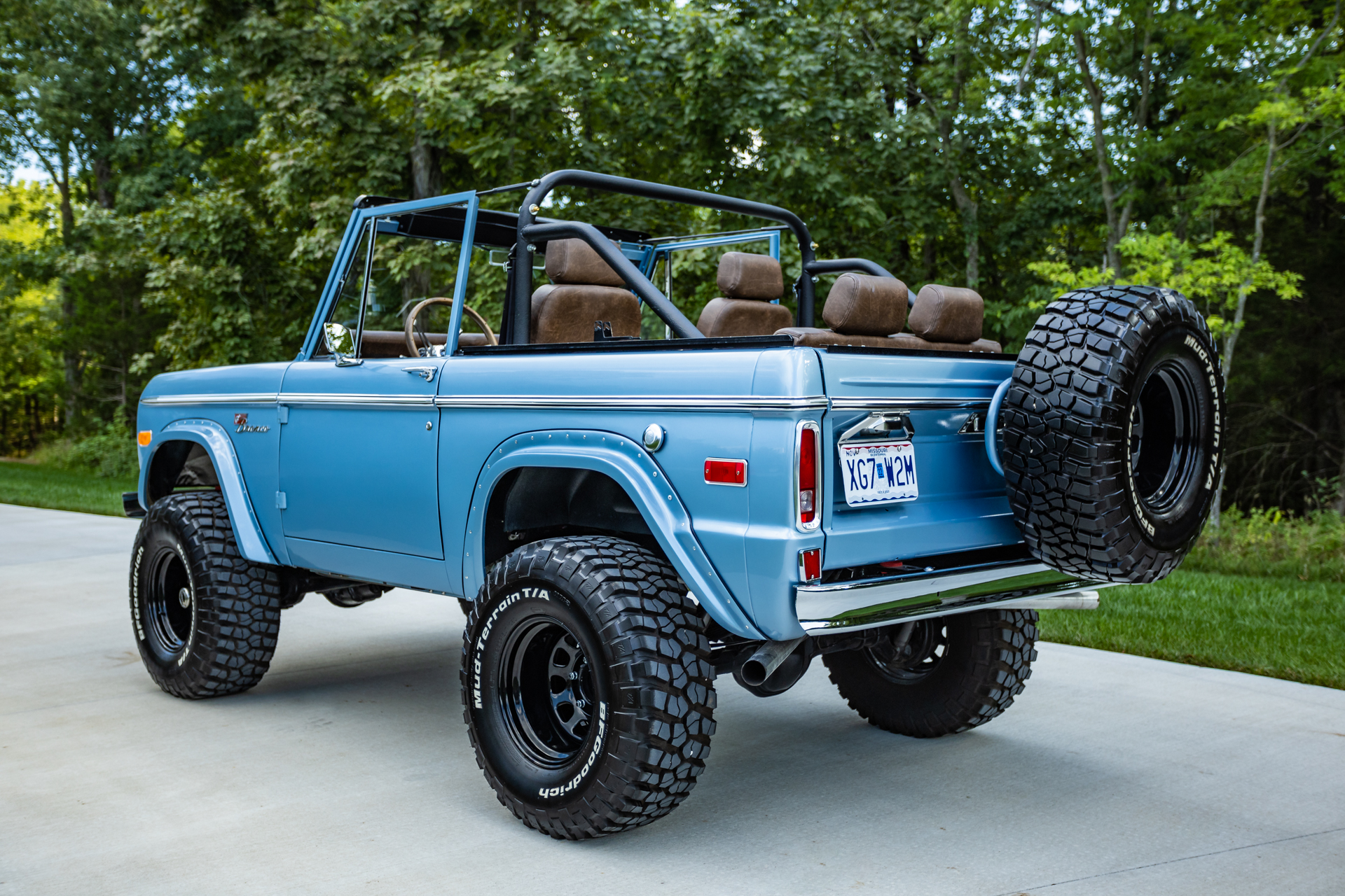 Black 15″ Ten-hole steel wheels are mounted with 33×12.5″ BFGoodrich Mud-Terrain T/A KM2 white-letter tires showing 2018 date codes, and a matching spare is mounted to a swing-away rear carrier. The truck is equipped with power steering, Mile Marker manually locking front hubs, and a 2.5″ suspension lift kit from Tom’s Offroad. Braking is handled by power-assisted front disc brakes and rear drums, and a Tom’s Offroad master cylinder is installed.