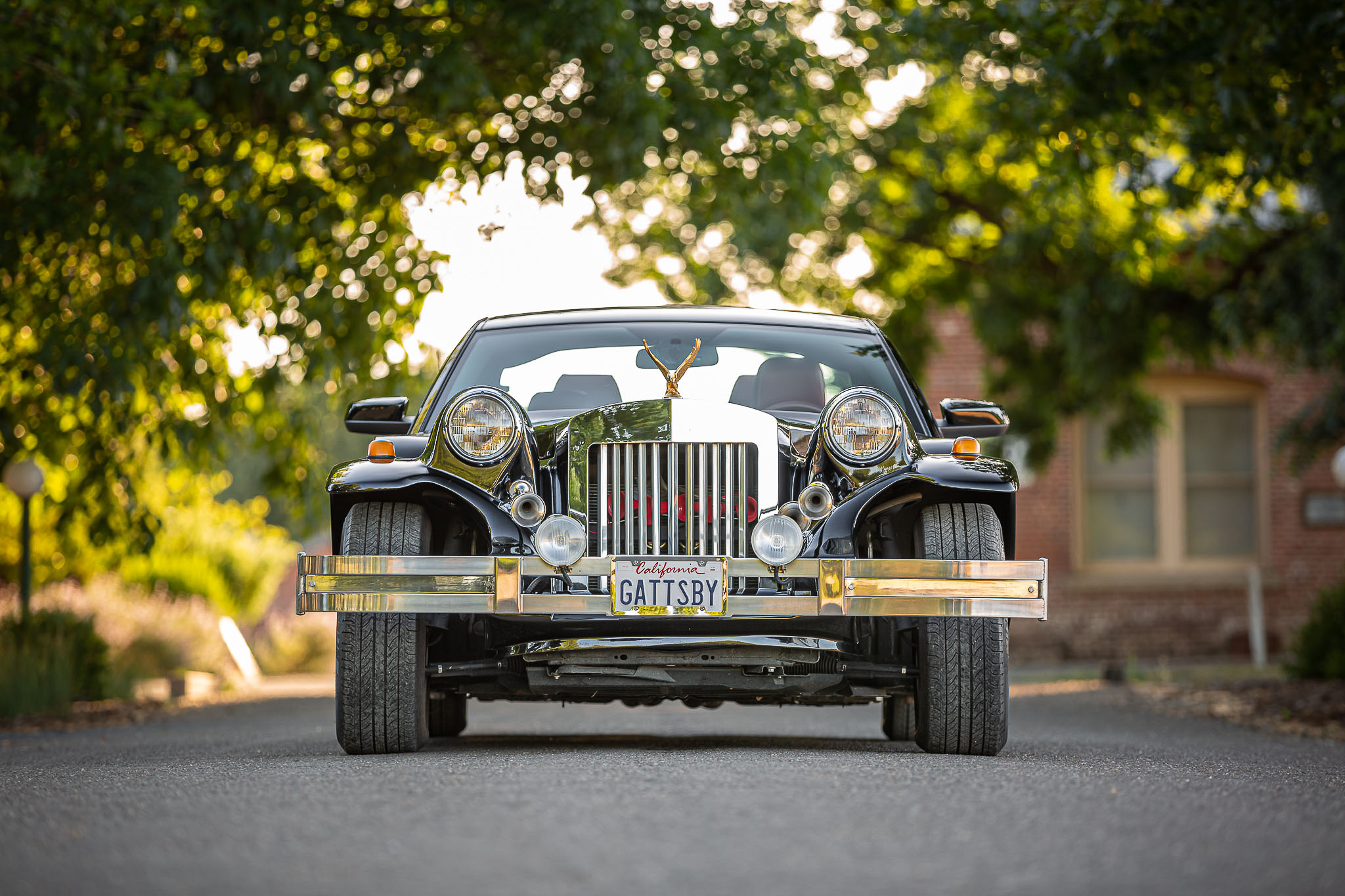 Chrome-finished 10-spoke 18″ wheels are mounted with Michelin Energy MXV4 S8 tires. Side-mount spares on wire wheels are fitted on both sides. The trunk lid features a simulated spare-tire bump, and a space-saver spare is stored inside the trunk. The four-wheel disc braking system and suspension components from the Mustang are retained.