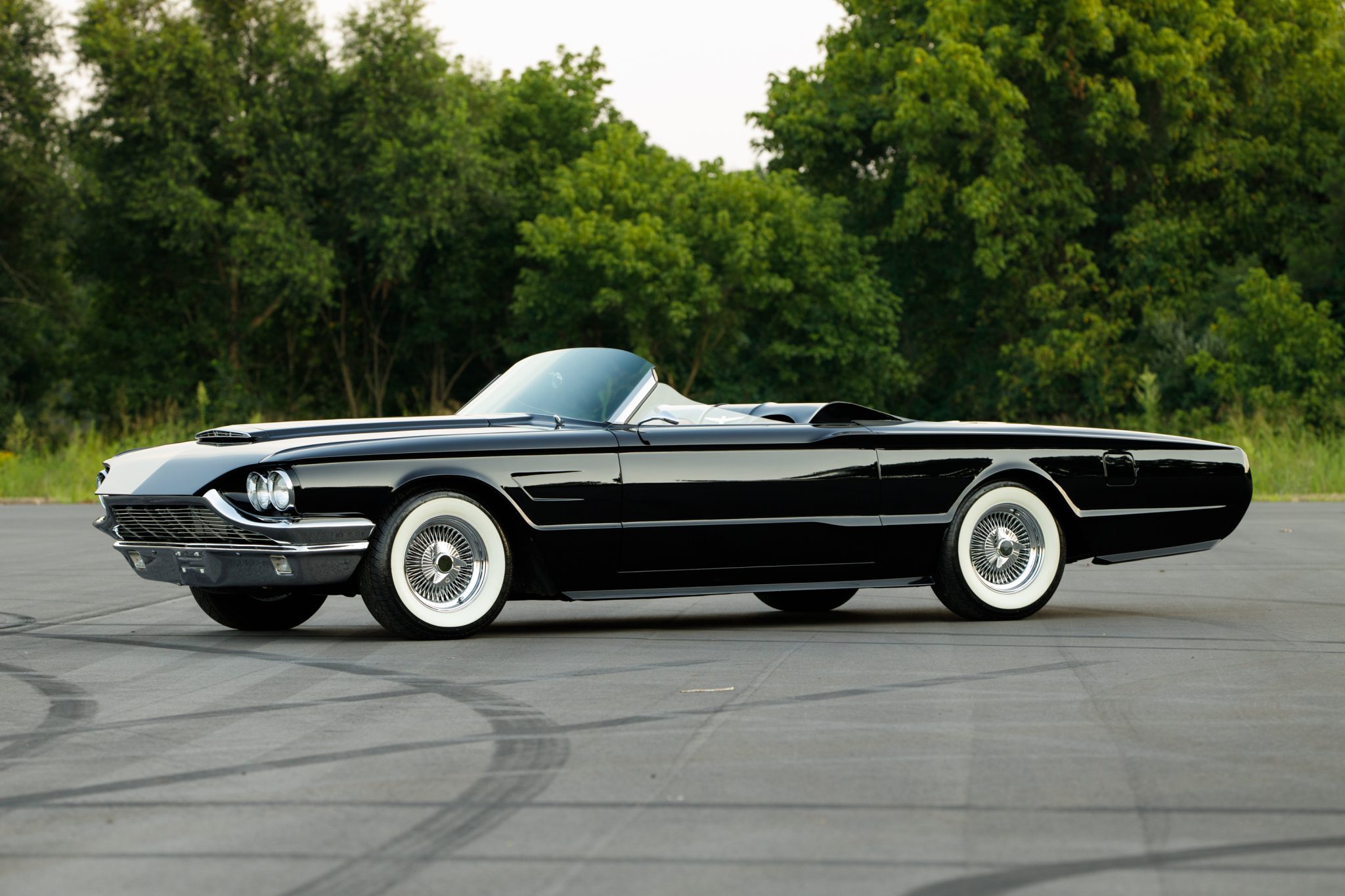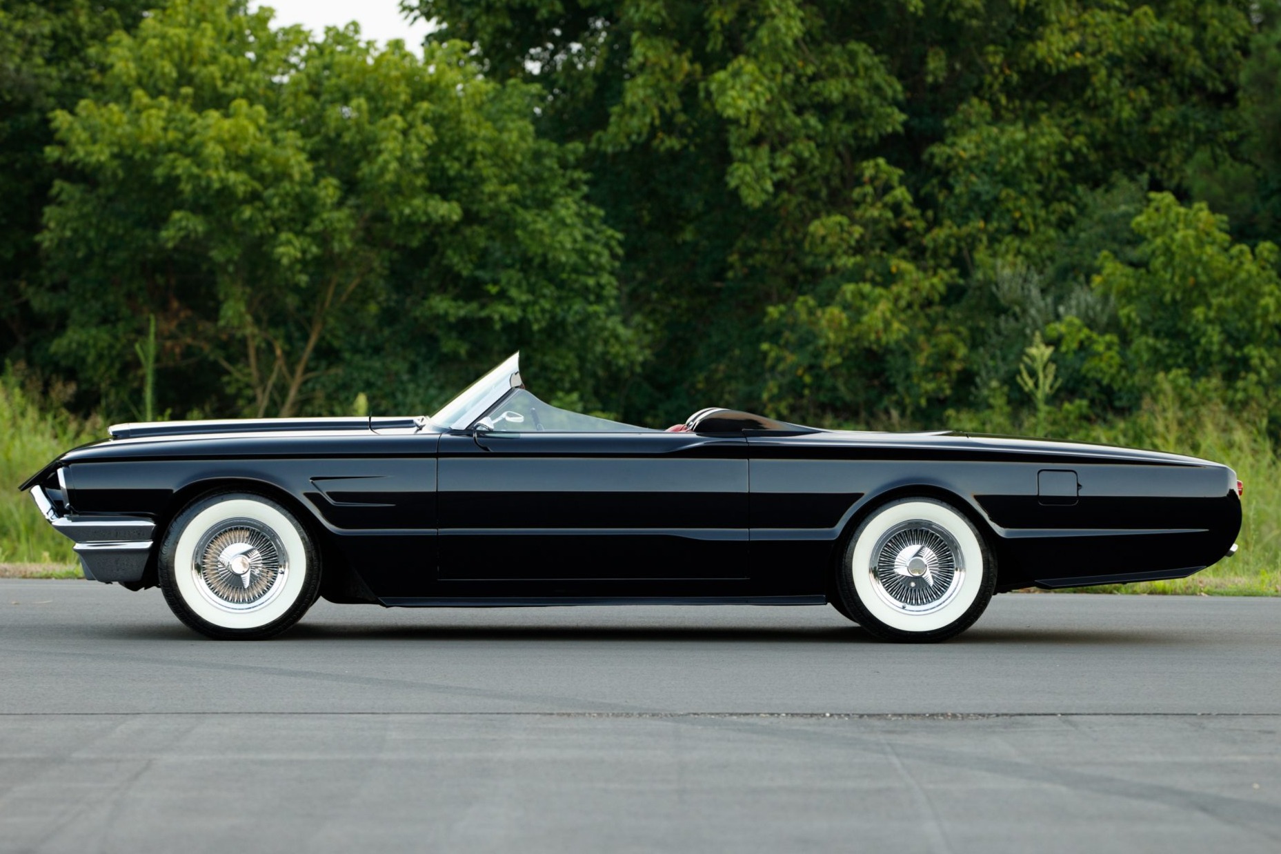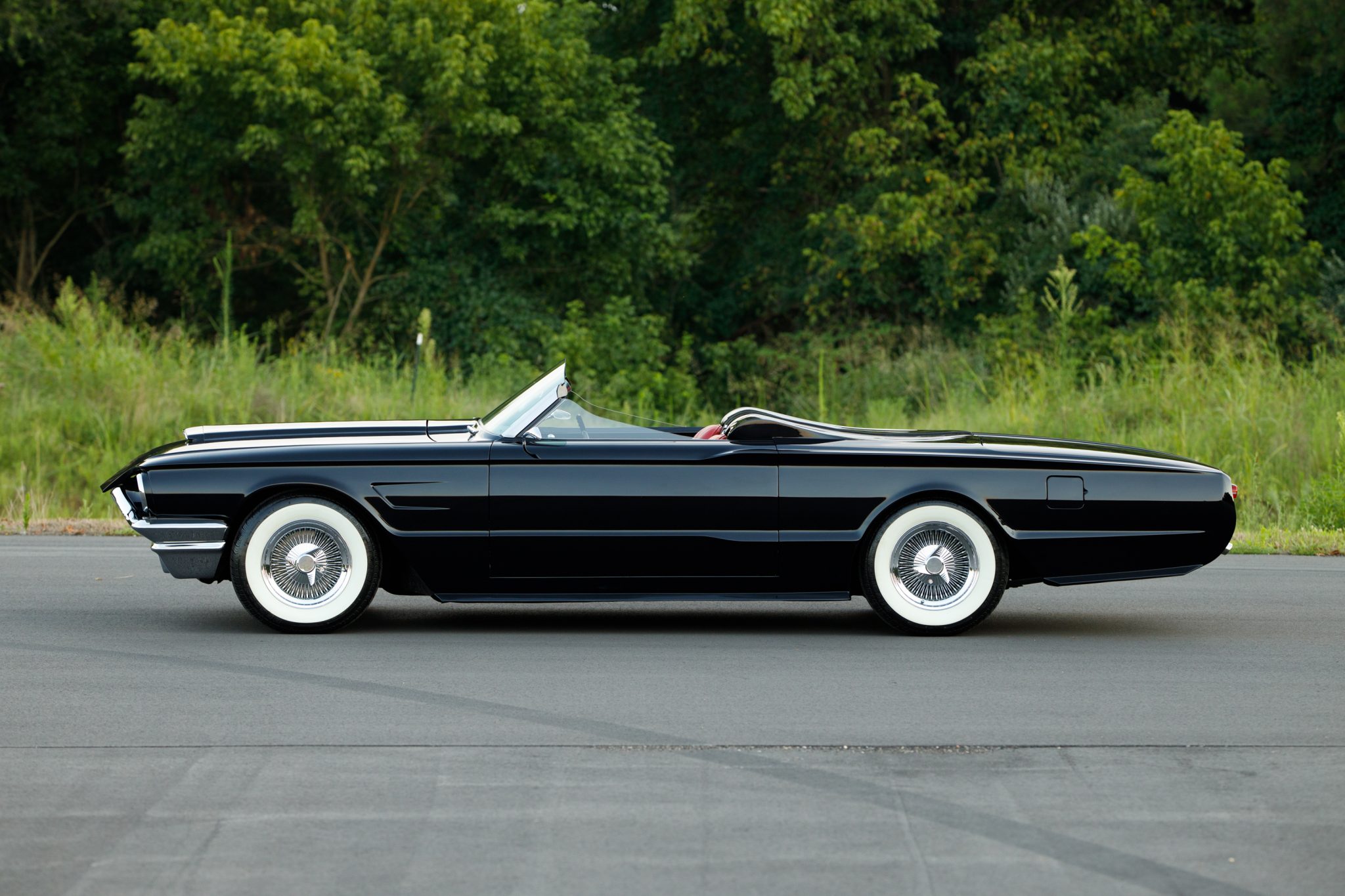 Chrome-finished 15″ wire wheels are equipped with simulated knockoffs and wear 225/70 BFGoodrich Silvertown wide-whitewall tires. The car is equipped with power-assisted steering and brakes, and service performed in February 2022 included replacing the brake booster and strut rod bushings.