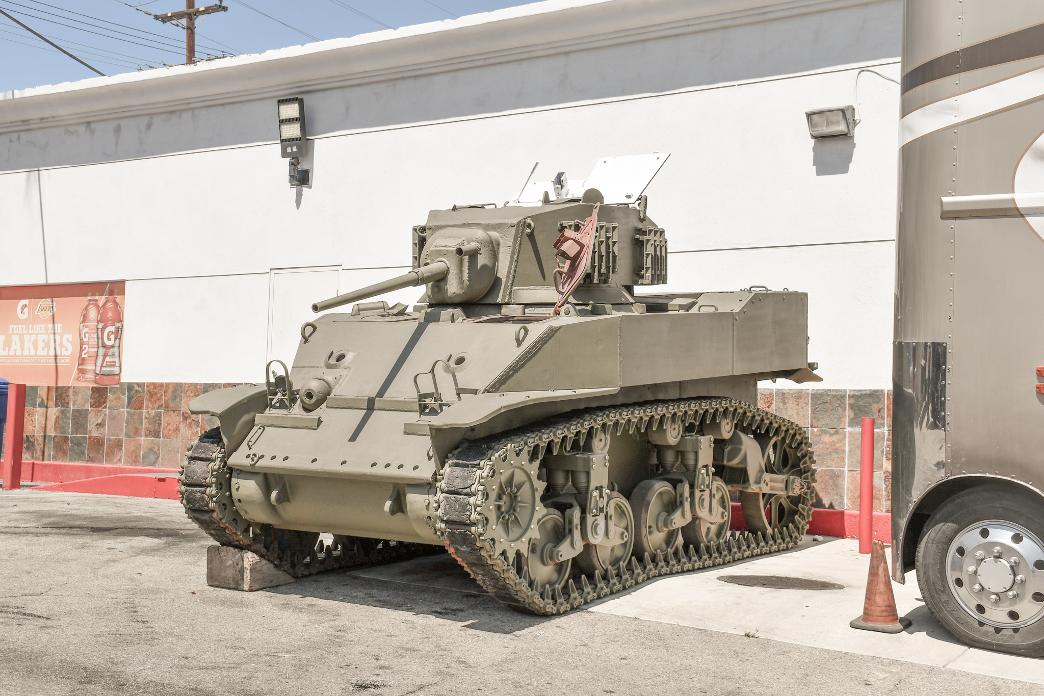 The Stuart M5A1 uses vertical volute suspension and utilizes four road wheels per side in addition to idler wheels out back and track tensioner rollers mounted to the top of each bogie.