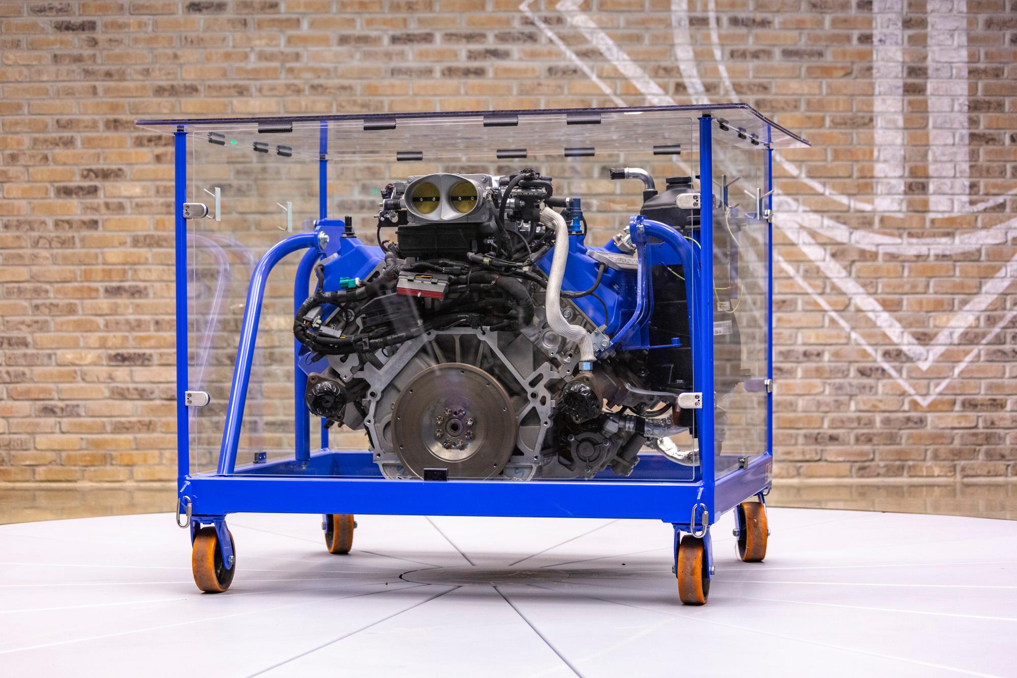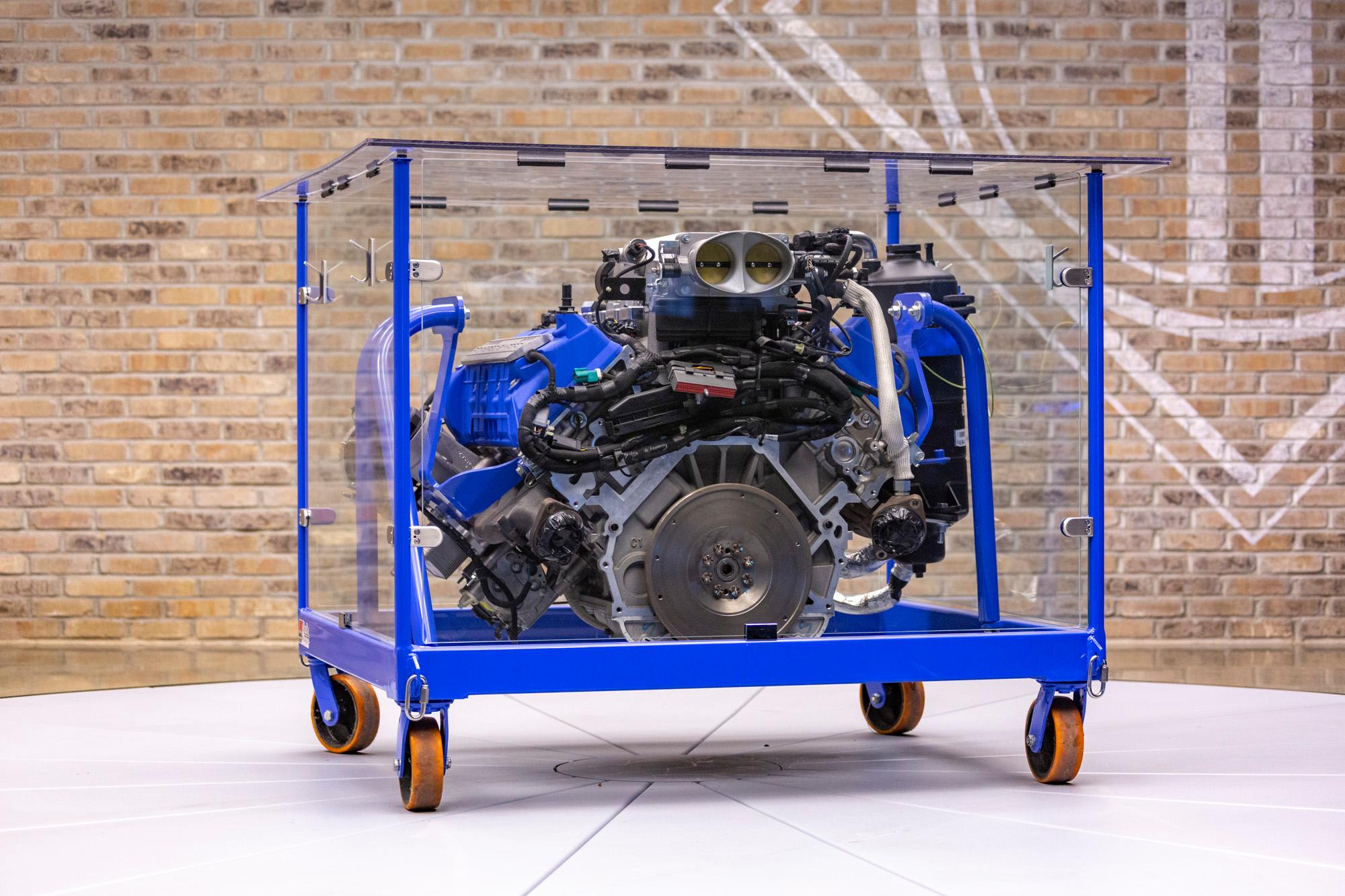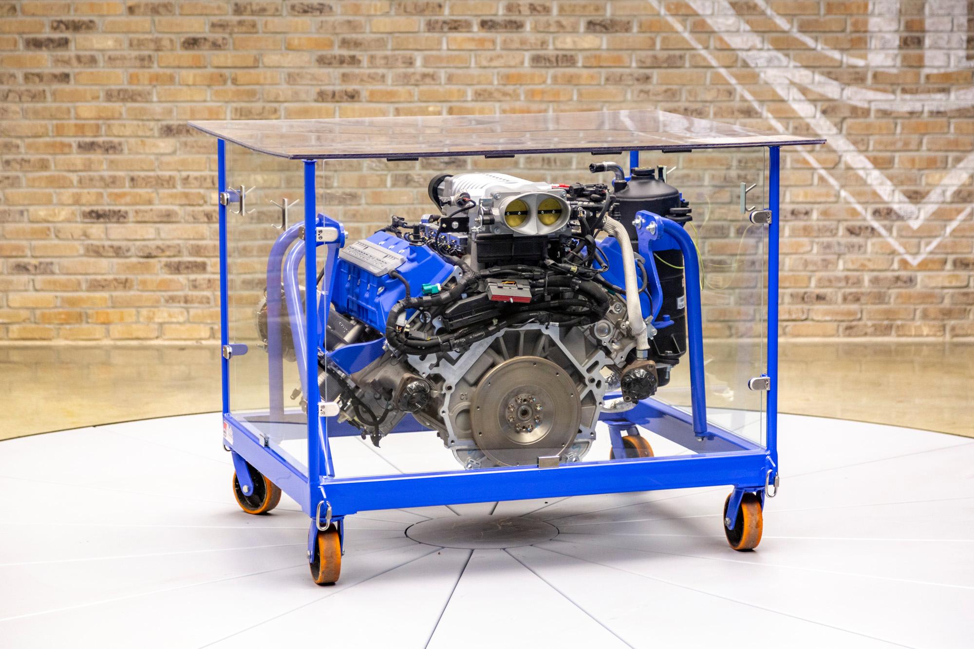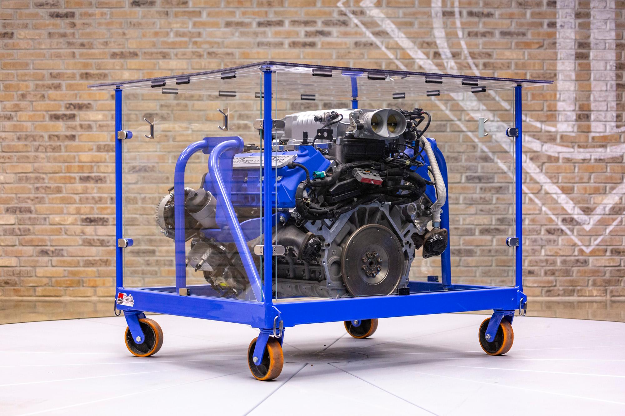 The engine was built at the Ford Romeo niche engine assembly plant and is fitted with a signed build plate. Retained components consist of a throttle body, a supercharger, an oil tank, an alternator, an air conditioning compressor, a flywheel, and an accessory belt. The selling dealer states that the engine has been used as a display piece and has not been run or installed in a vehicle.