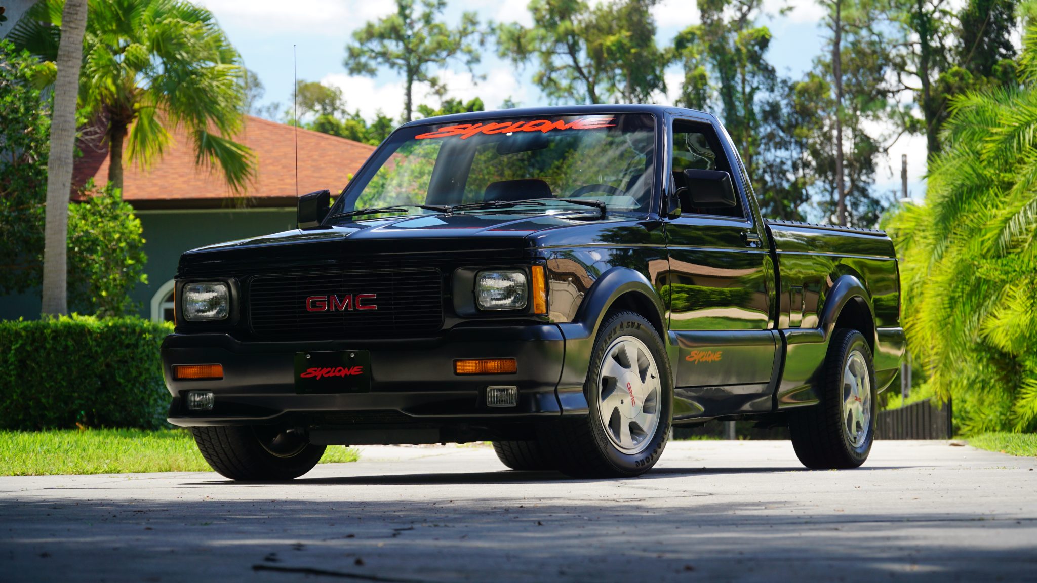 Six-spoke 16″ aluminum wheels feature GMC-branded center caps and are wrapped with older 245/50 Firestone Firehawk SVX tires. The truck is equipped with power steering, a sport-tuned suspension with Bilstein shock absorbers, and front disc brakes. The selling dealer notes the brake booster was replaced in August 2022, and the malfunction-indicator light for the four-wheel ABS system is on.
