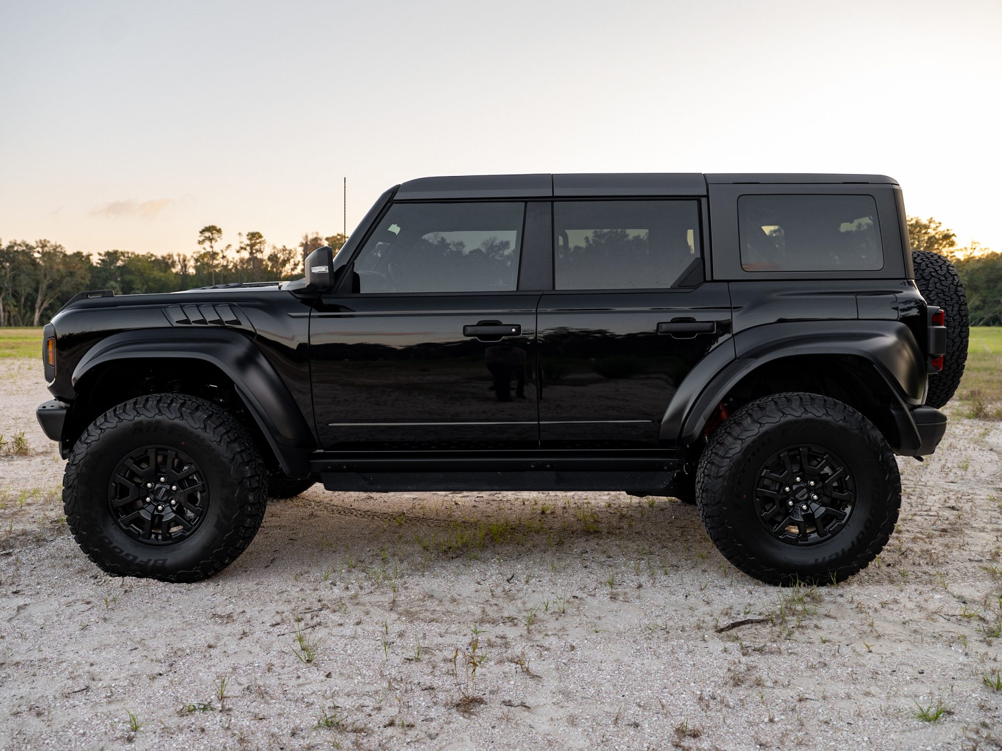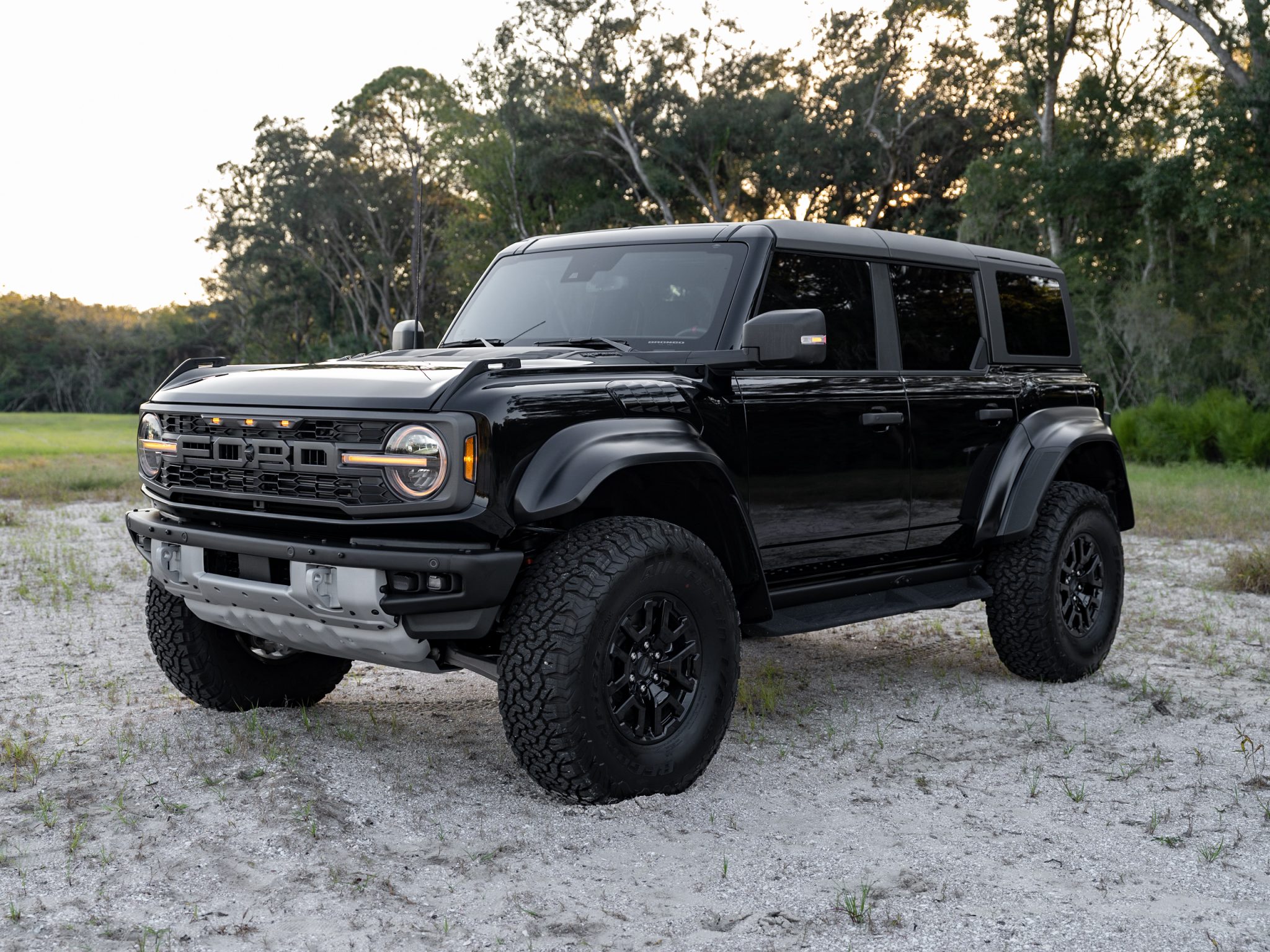 Black 17″ alloy wheels wear 37×12.5″ BFGoodrich All-Terrain T/A K02 tires, and a matching spare is mounted to a swing-out tailgate. The truck is equipped with a Raptor High-Performance Off-Road Stability Suspension (HOSS) system with live-valve Fox dampers, a front stabilizer bar disconnect system, and four-wheel disc brakes. The Raptor features a wider track and increased ground clearance over the contemporary Bronco.