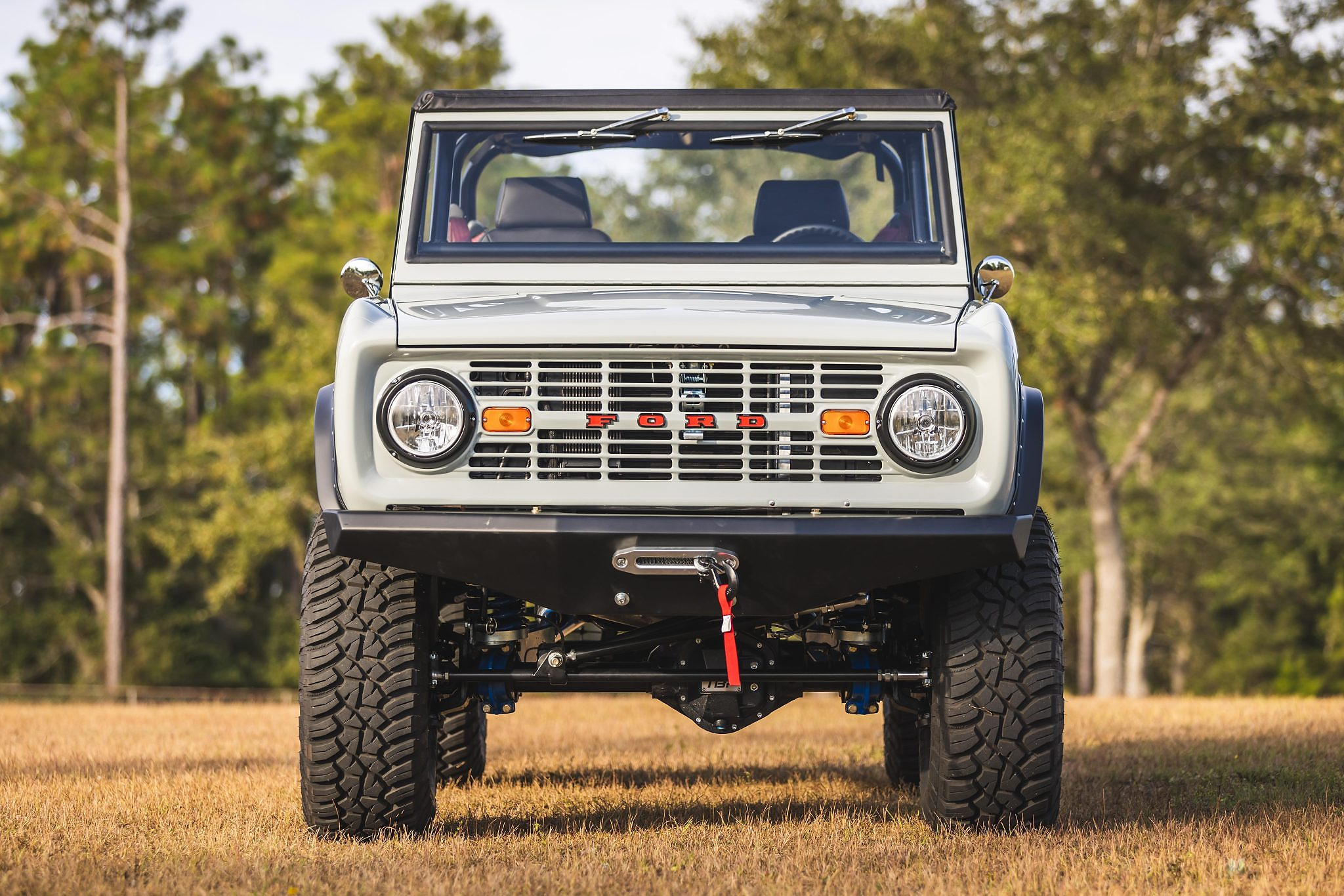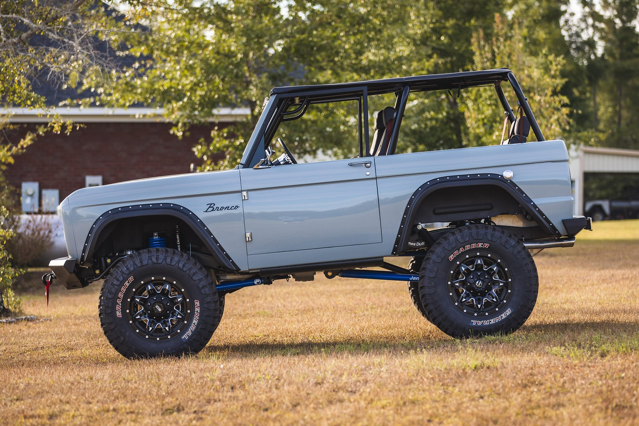 Fuel 17″ alloy wheels are wrapped in 35×12.50 General Grabber tires. Stopping power is from four-wheel discs, and replacement brake lines have been installed. The steering and suspension systems were fitted with James Duff components including a four-link rear setup, quad rear shock absorbers, and front coil springs.