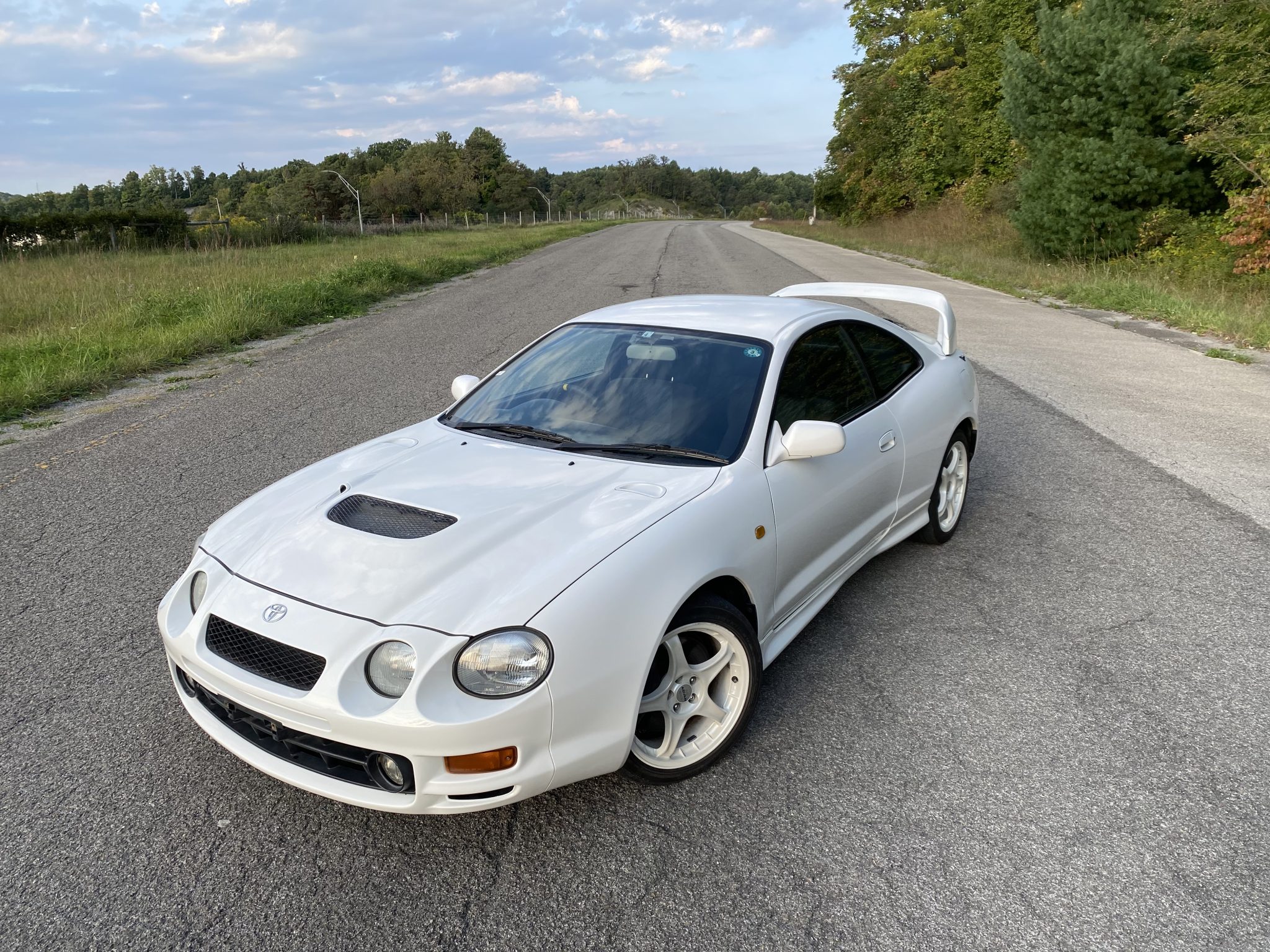 White-painted 17″ Advan RC wheels are wrapped in 215/45 Goodyear Eagle RVS tires. Sport ABS was introduced to the Celica in 1996, and stopping power is provided by four-wheel disc brakes with Celica-branded calipers. The front suspension features the Toyota “Superstrut” system, and the left-front camber control link and control arms were replaced under current ownership. Photos show curb marks on the wheels.