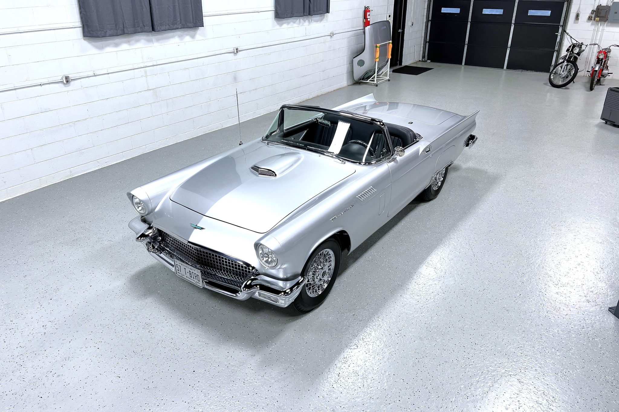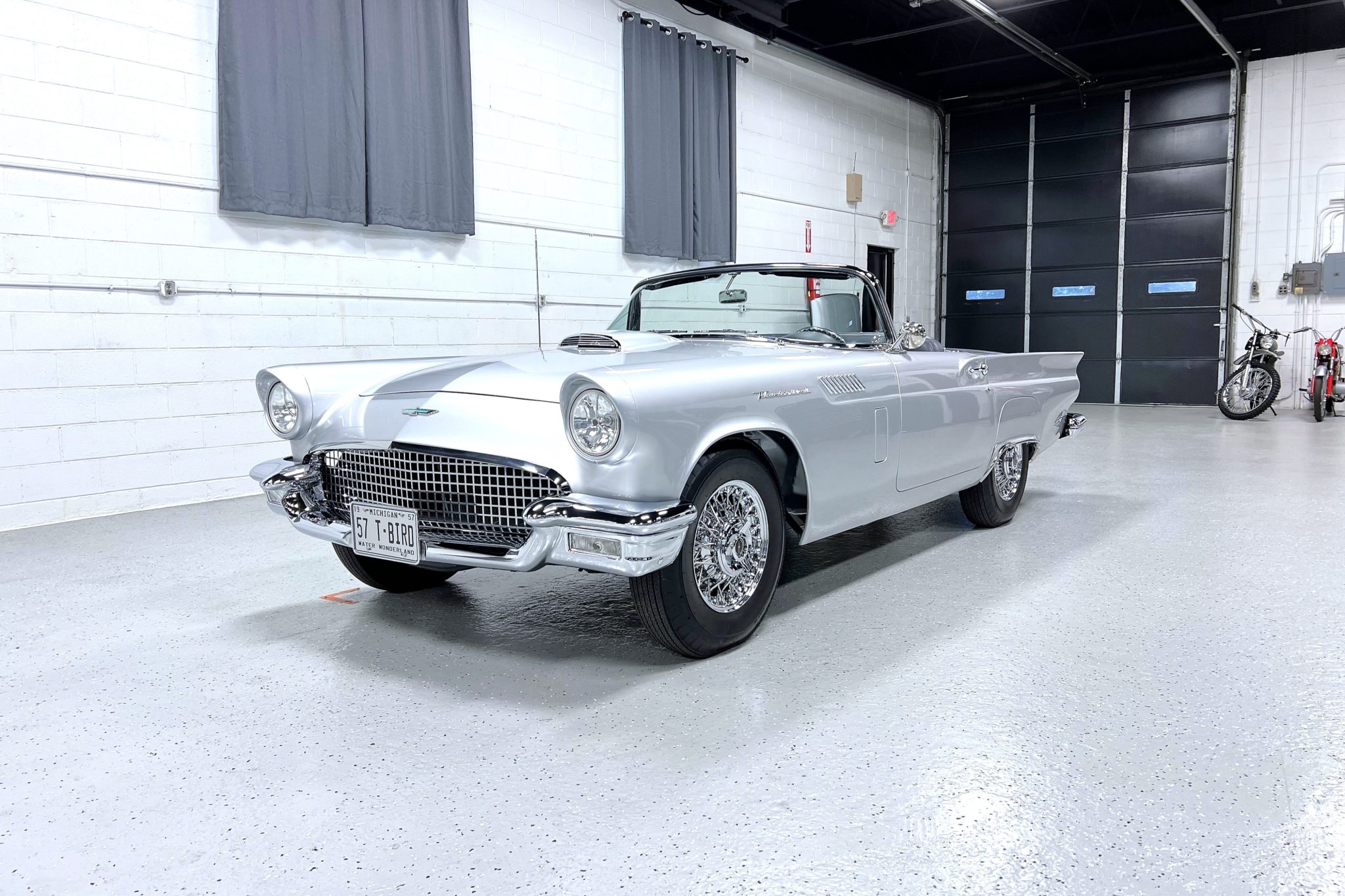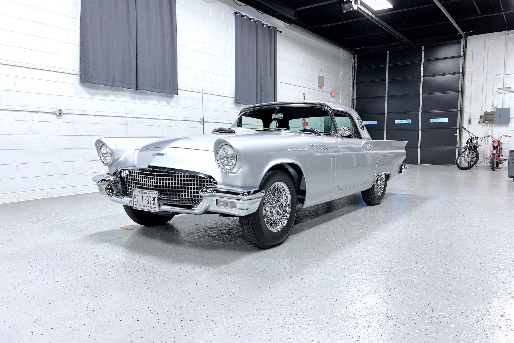 Chrome 15″ Coker wire wheels are mounted with Coker Classic tires. The car is equipped with power steering and four-wheel disc brakes.