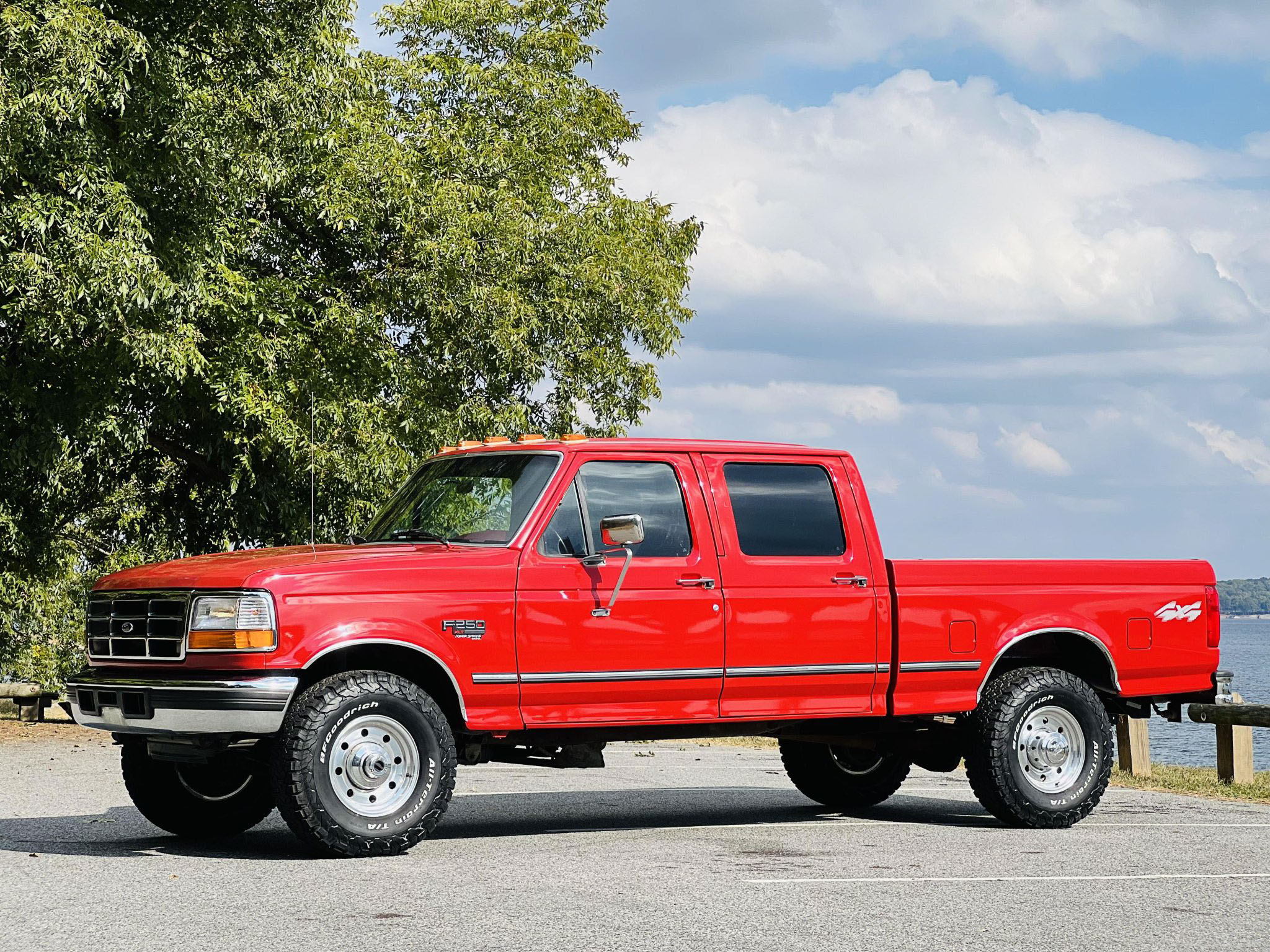 Polished 16″ forged alloy wheels show flaws pictured below and wear 285/75 BFGoodrich Radial T/A tires. The seller states that the tires and brake pads were replaced in July 2022.
