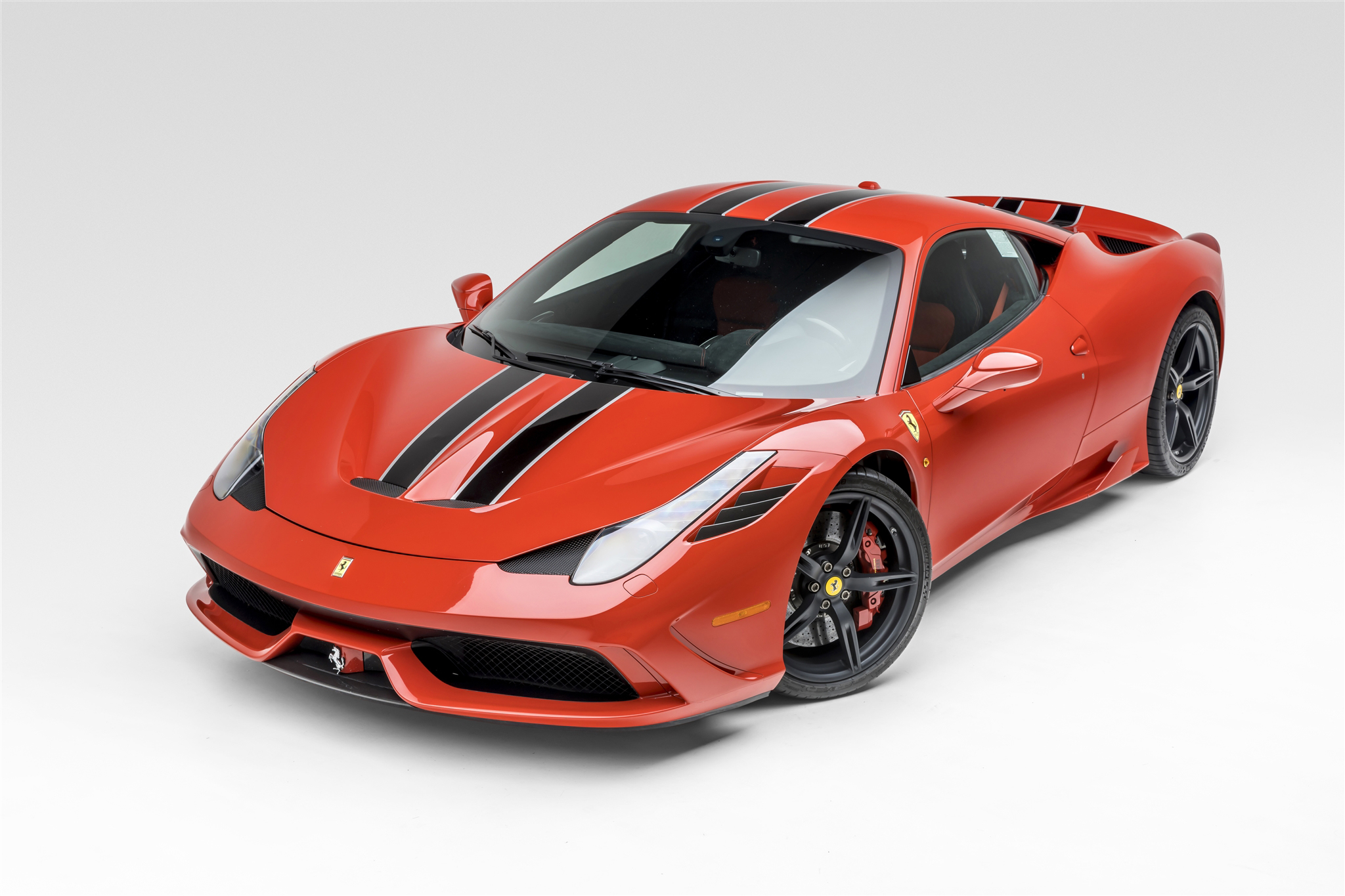 The 20″ five-spoke alloy wheels are mounted with staggered-width Michelin Pilot Sport Cup 2 tires. The car is equipped with magnetorheological dampers and a vehicle lift system, and braking is handled by red-finished Ferrari/Brembo calipers over cross-drilled carbon-ceramic rotors at all four corners. The Speciale received a retuned Side Slip Angle Control system compared with the 458 Italia as well as F1-Trac traction control.